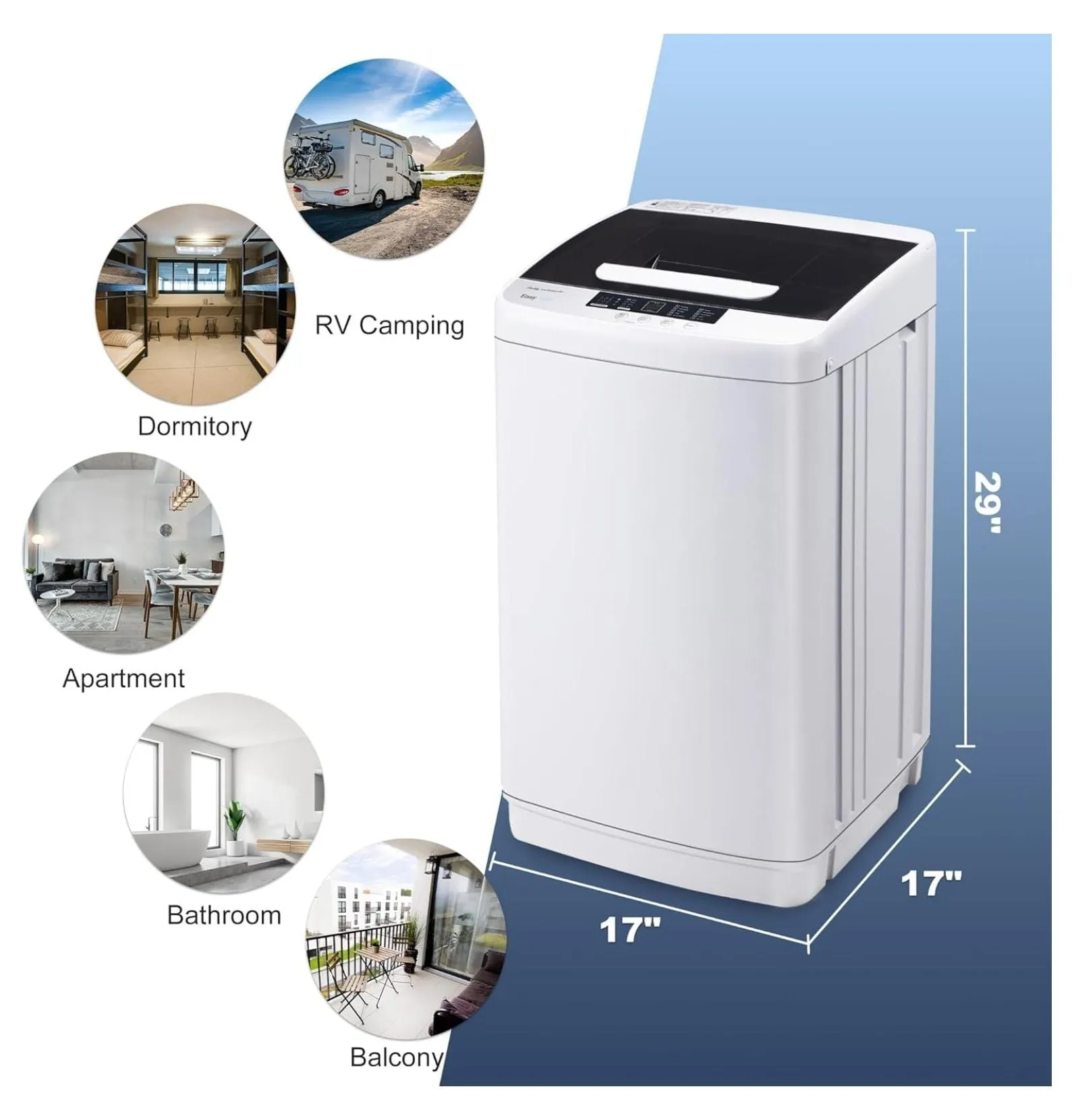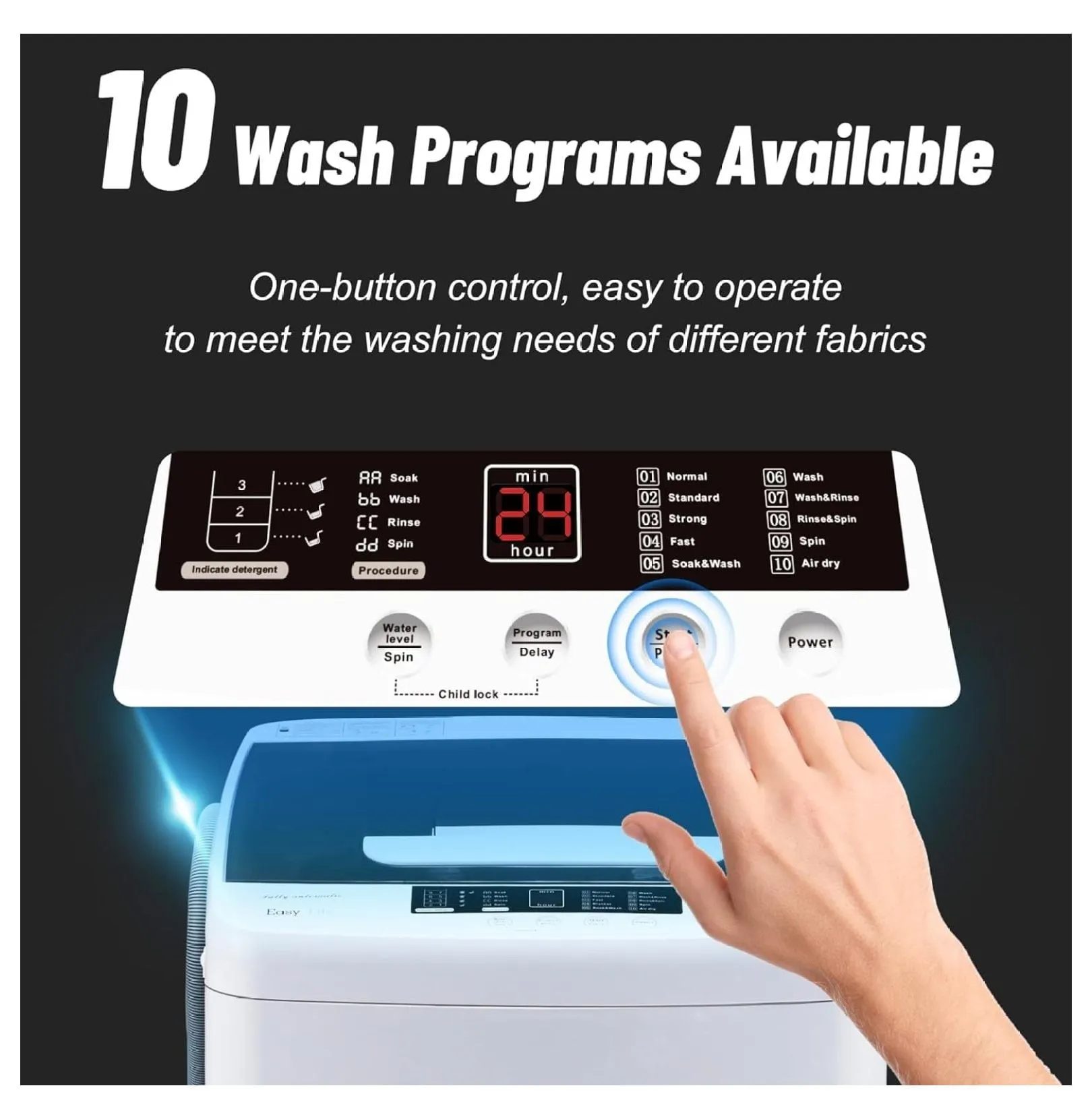 - Large Capacity & Easy Operation: With a spacious capacity and powerful motor, the portable washer machine can wash up to 8 lbs of clothes or other items for your daily use. The control panel features 10 programmes, 3 water level selections and an LED display that makes all functions and operations easy to see at a glance, including water level/spin, programme/delay, time settings and child lock for everyday washing.