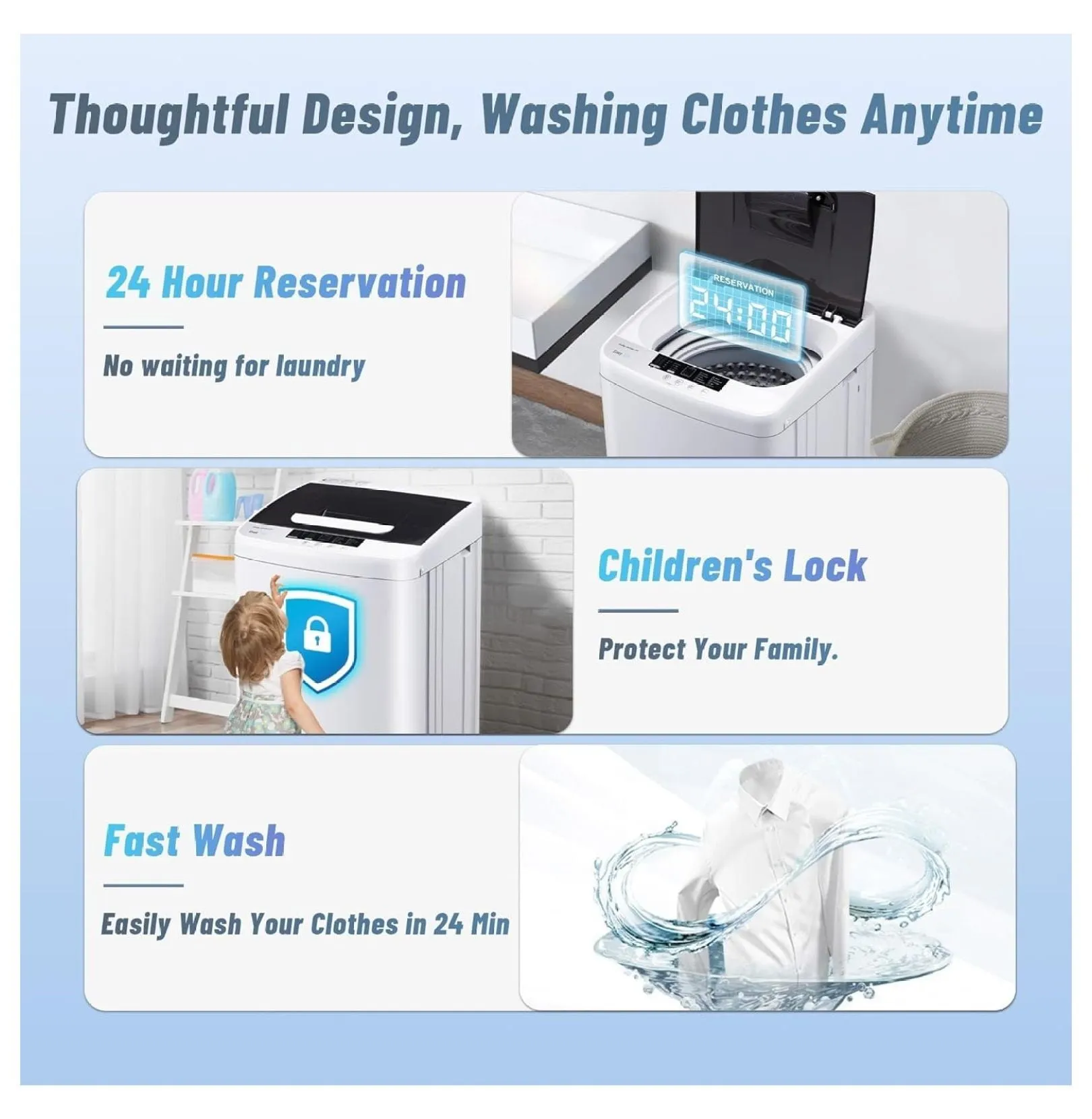 - Humanised Design And Safety Child Lock: The lid of the laundry machine is transparent, you can view and monitor the water volume and washing condition at any time, once the child lock function is set, all buttons will be locked, if the top cover is opened, the washer will stop running and send out a false alarm. In addition, this portable washing machine features a 24-hour smart delay wash function, so you can preset the wash start time as needed.