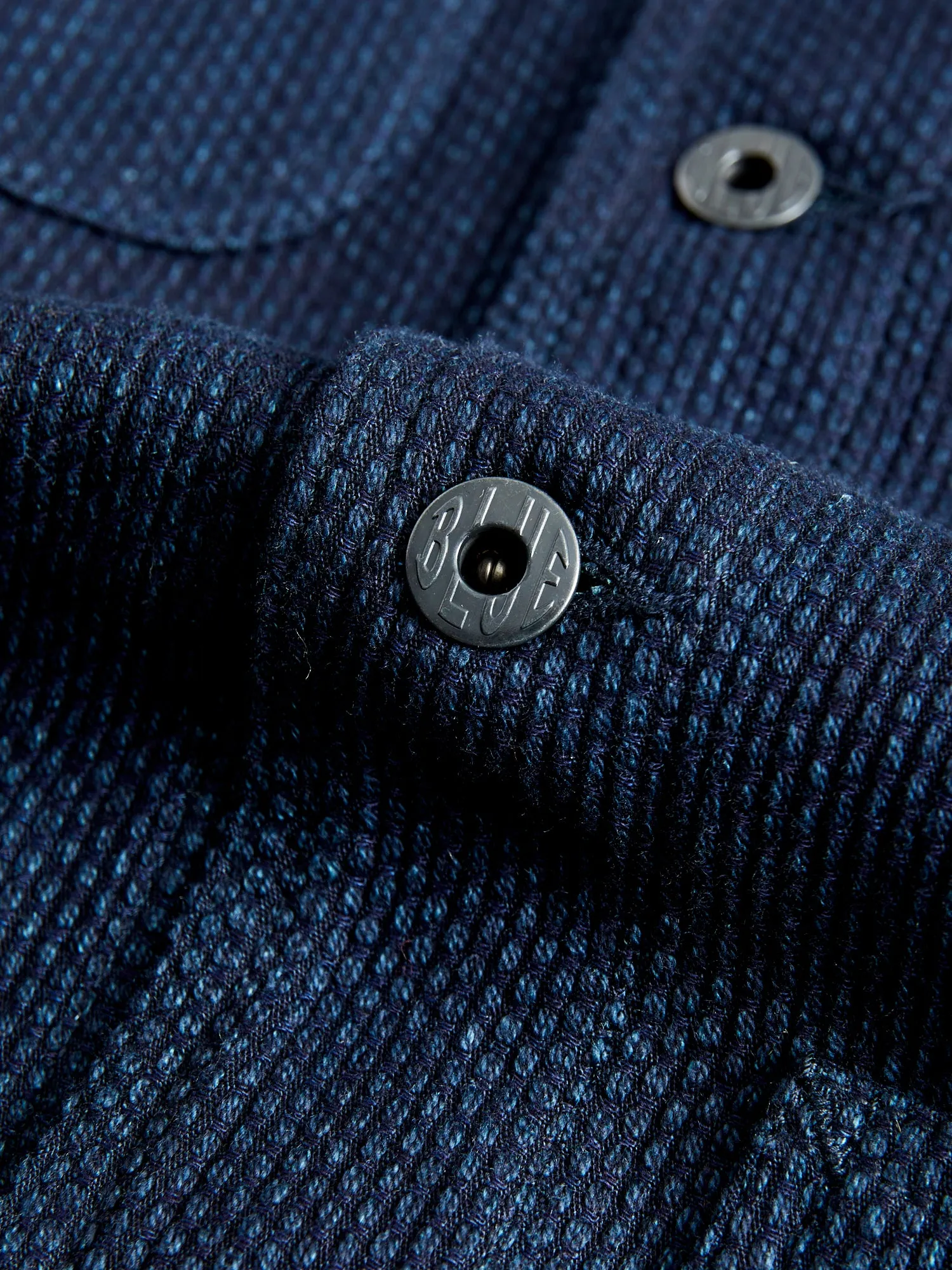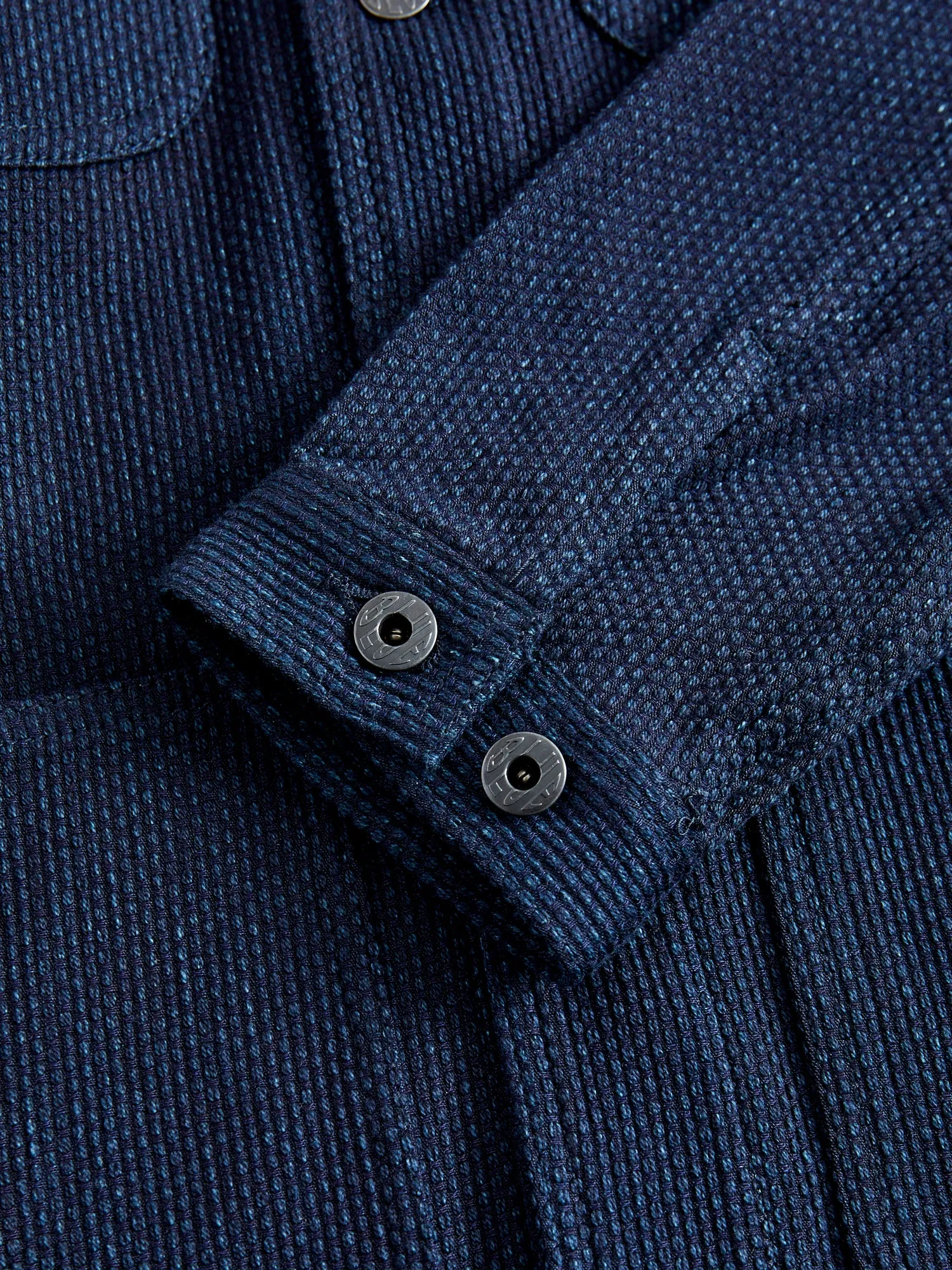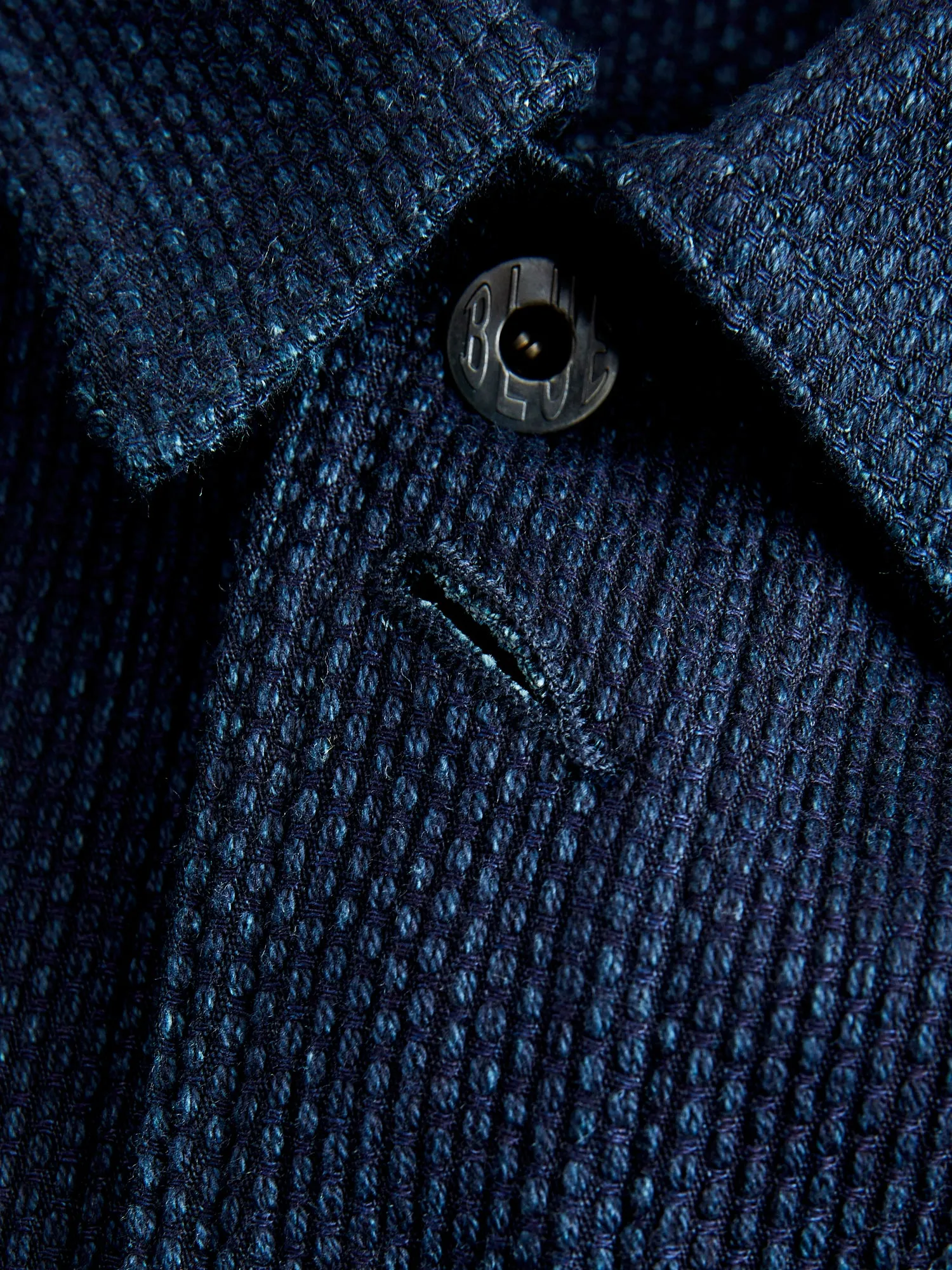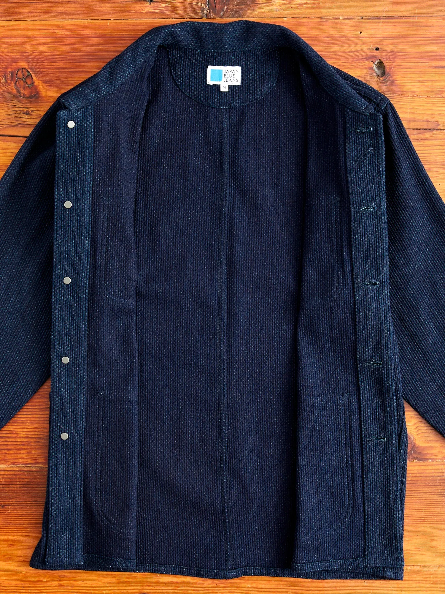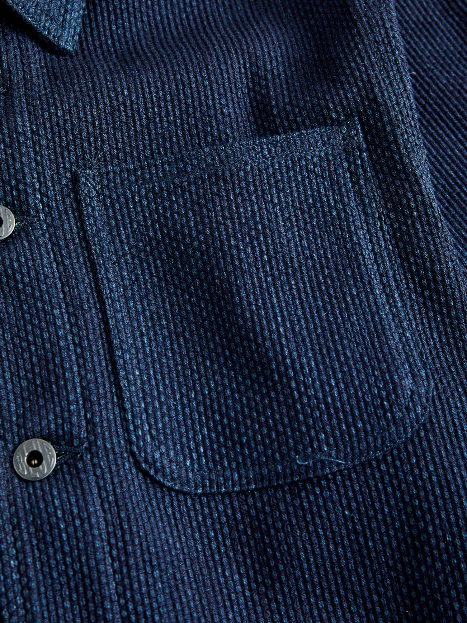Inspired by "hikeshi banten" or traditional Japanese firefighter uniforms, Japan Blue's 11oz sashiko fabric is woven using sashiko threads on a robust cotton base. Dyed with rope indigo for a deep color, the fabric's texture intensifies with continued wear, revealing a spectrum of indigo-blues over time. Japan Blue's Coverall design pulls from traditional workwear complete with a four pocket design at the front, metal button placket, and pointed collar.