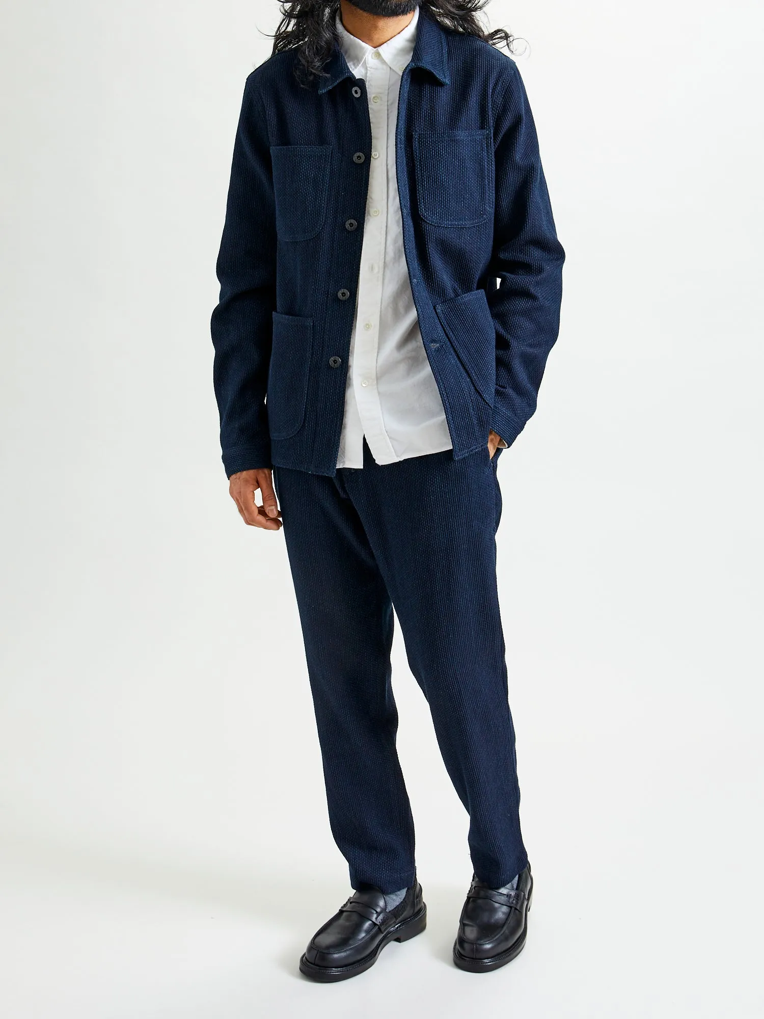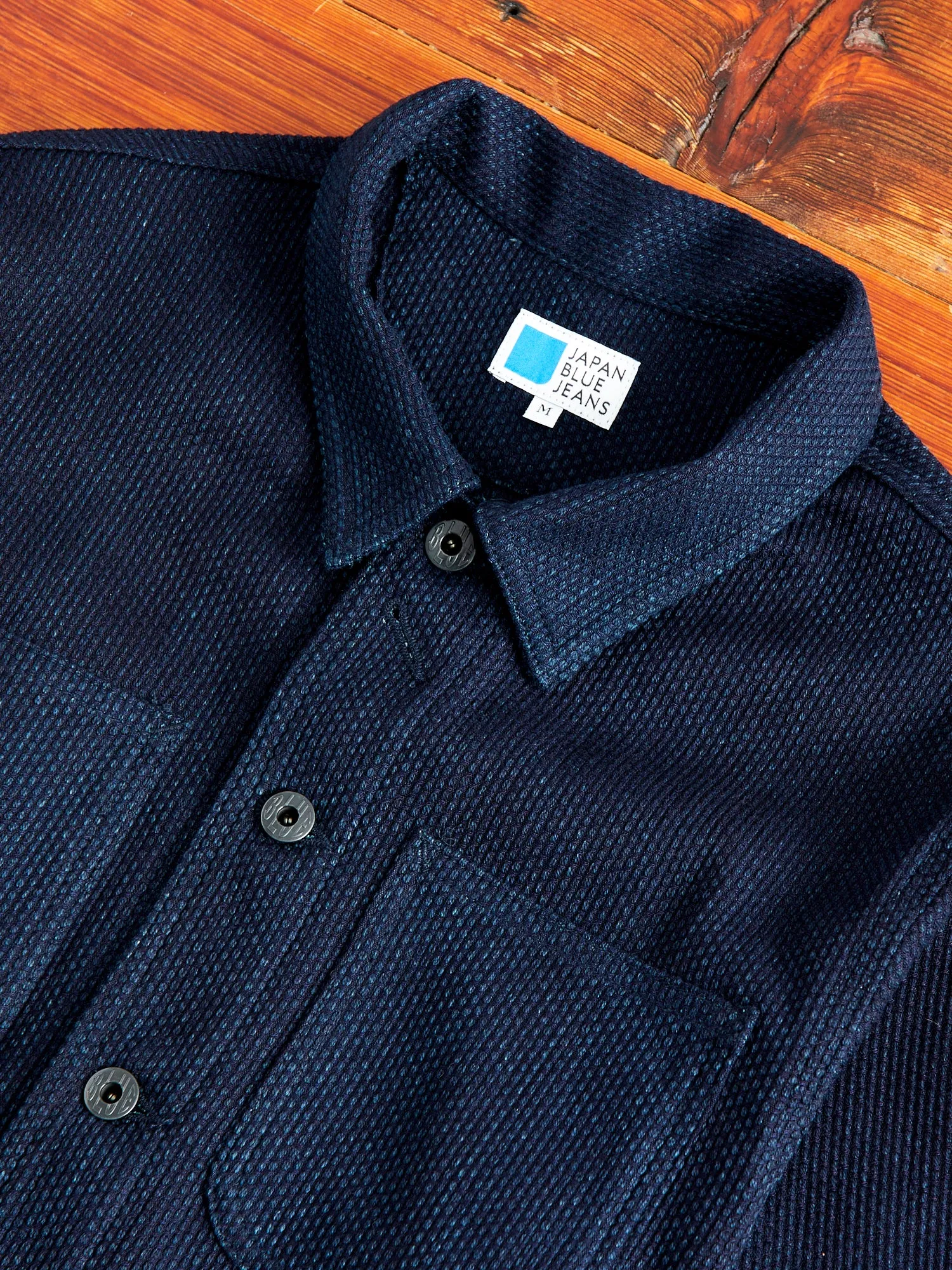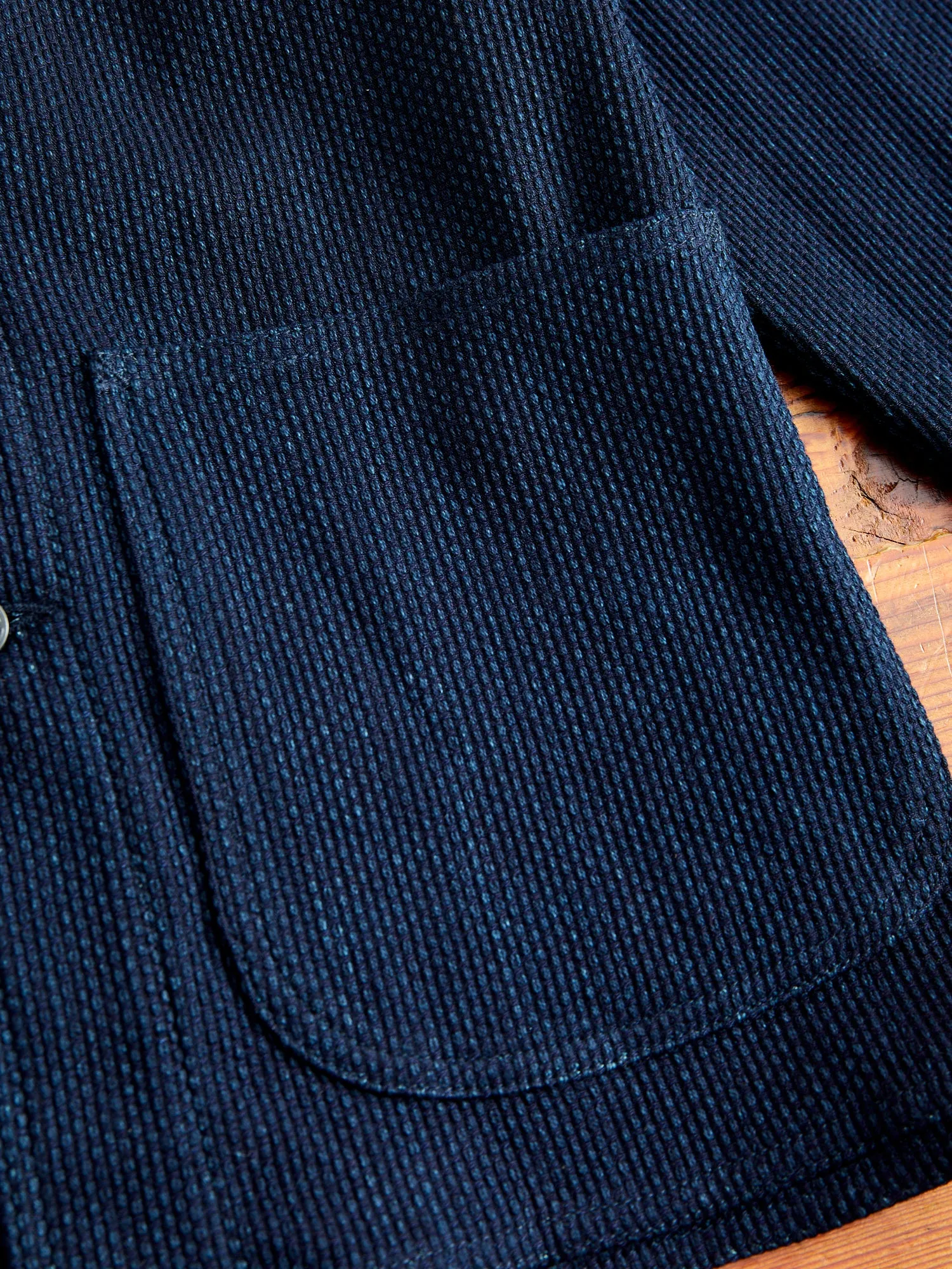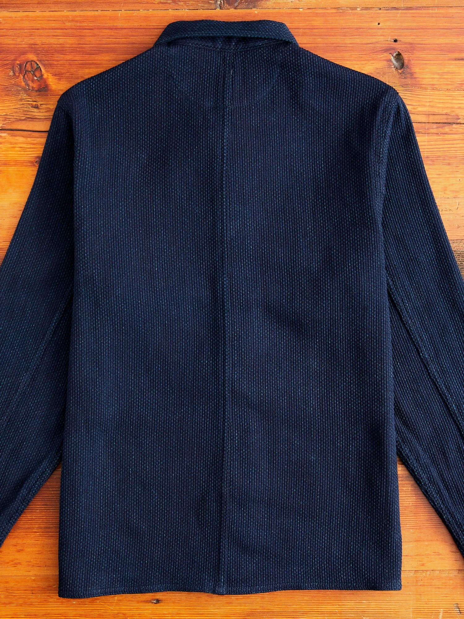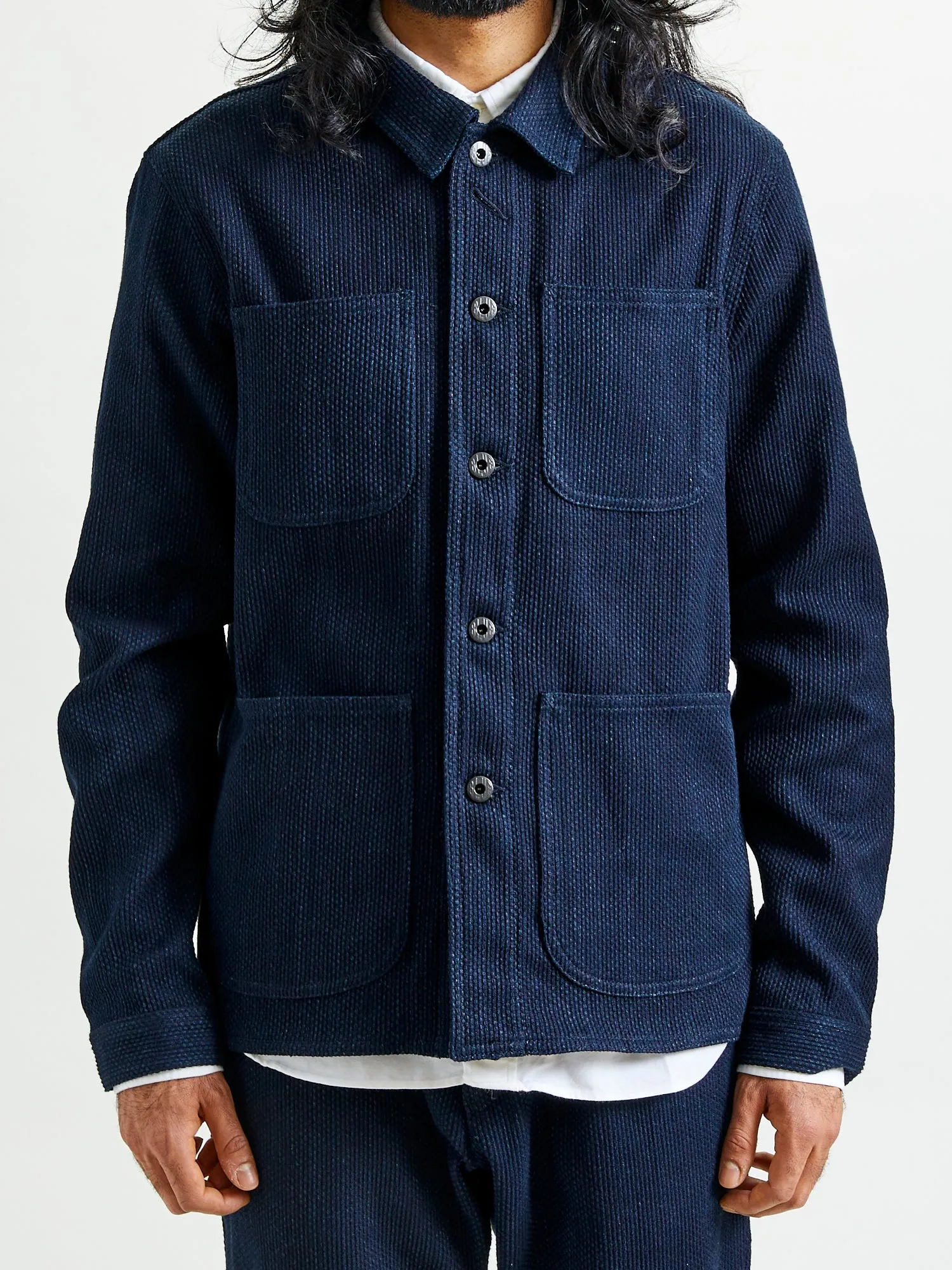 Inspired by "hikeshi banten" or traditional Japanese firefighter uniforms, Japan Blue's 11oz sashiko fabric is woven using sashiko threads on a robust cotton base. Dyed with rope indigo for a deep color, the fabric's texture intensifies with continued wear, revealing a spectrum of indigo-blues over time. Japan Blue's Coverall design pulls from traditional workwear complete with a four pocket design at the front, metal button placket, and pointed collar.