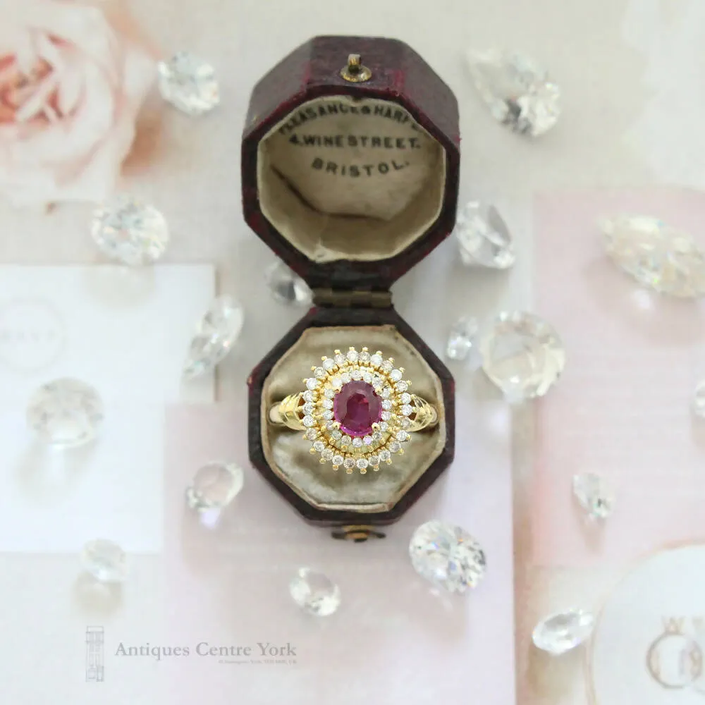 This ring has an Asian look about it being all yellow gold with ribbed shoulders. Set with an oval mixed cut ruby measuring 6.25mm x 5.5mm with a surround of eighteen small brilliant cut diamonds set with yellow gold claws with gold bead work between the outer row of twenty six brilliant cut diamonds. The cluster measures 14.5mm x 13.5mm and sits a little proud off the finger. No hallmark but tested to confirm 18ct yellow gold. Finger size O. Weight 7.1g.