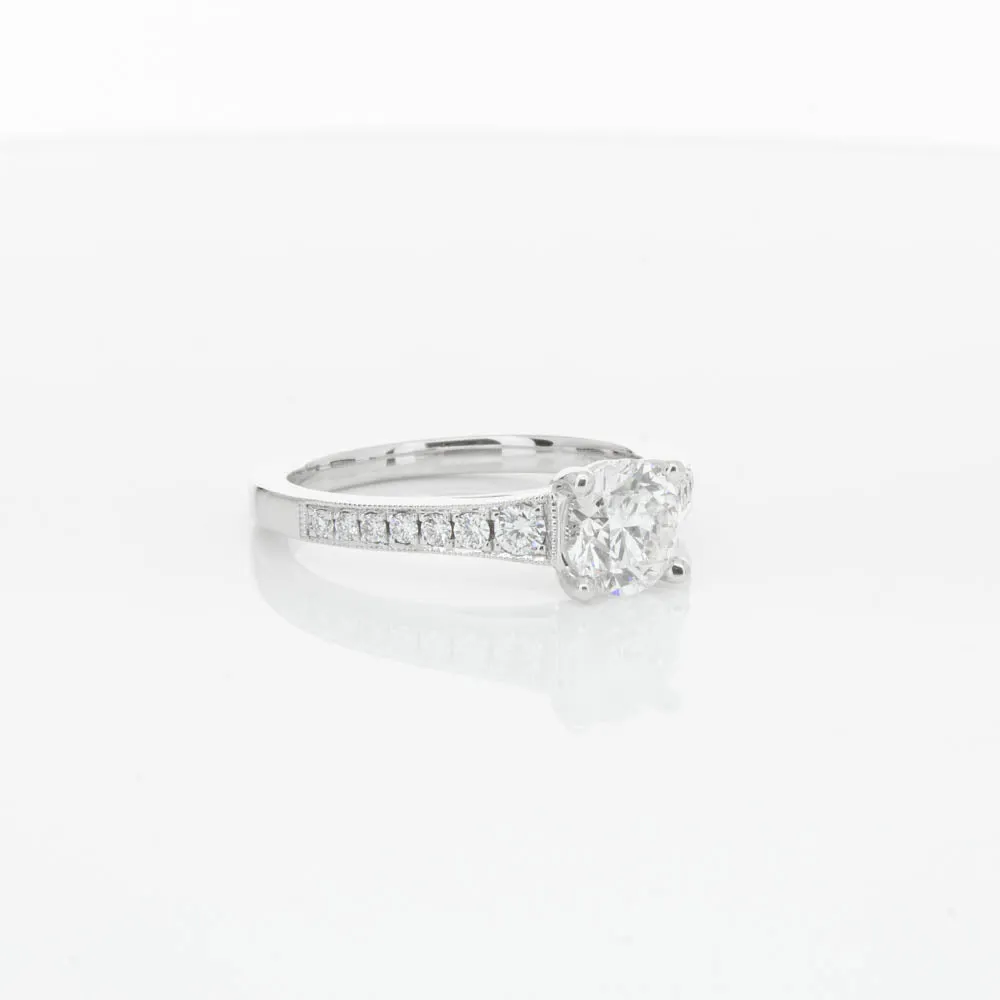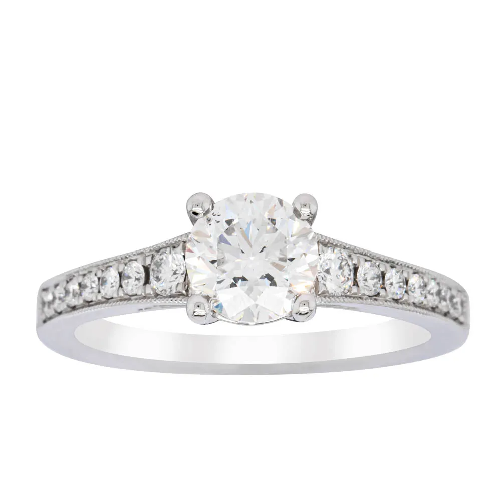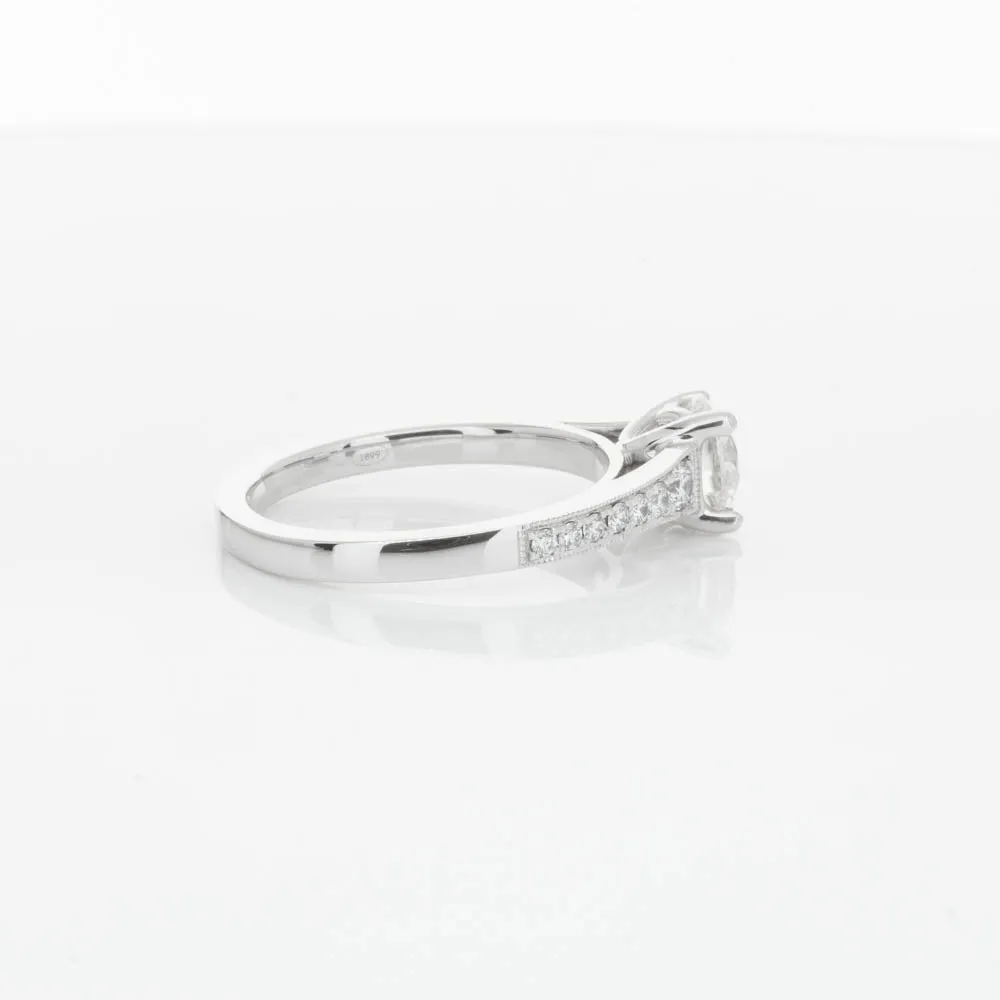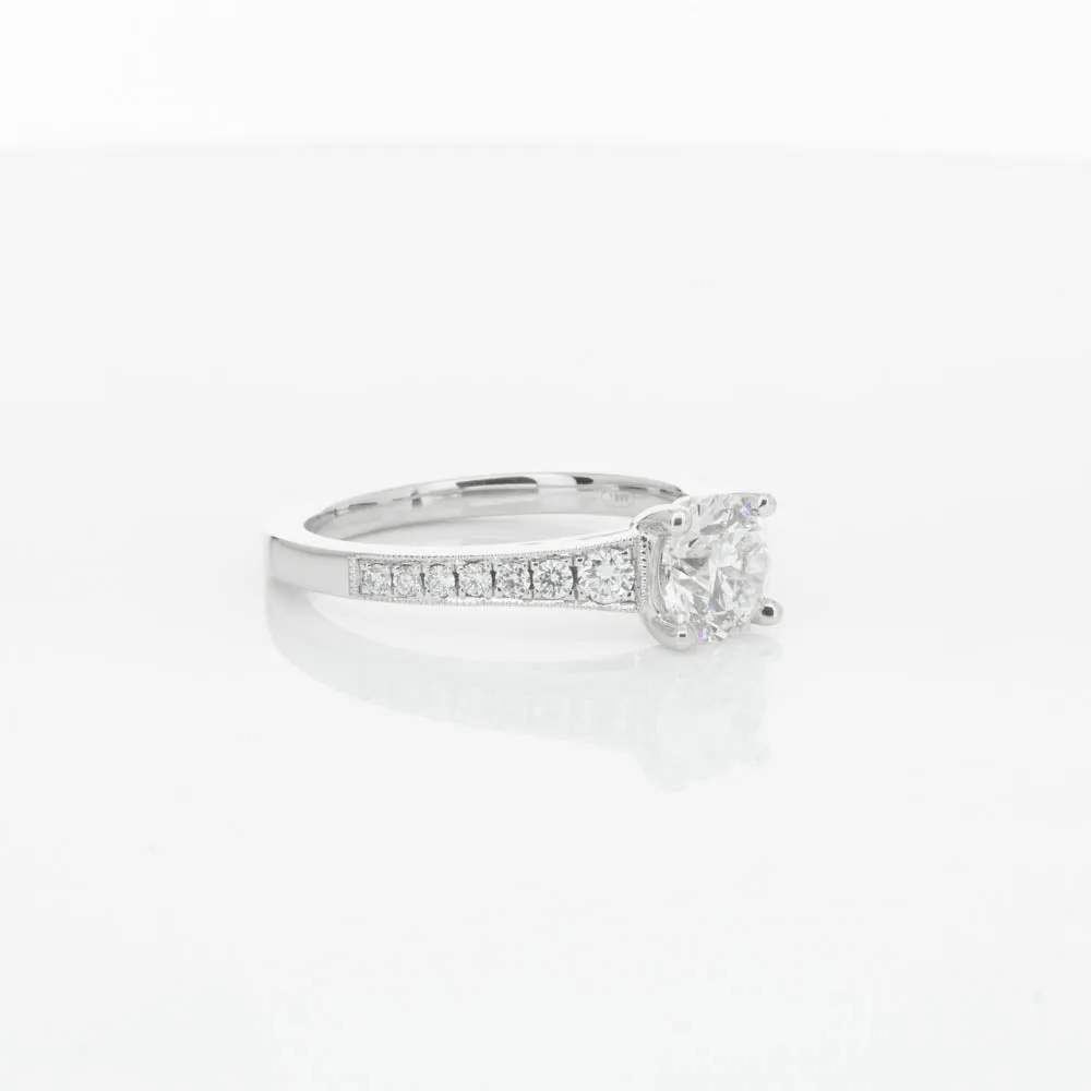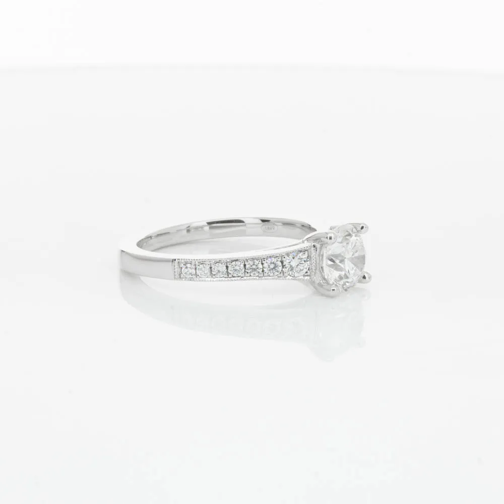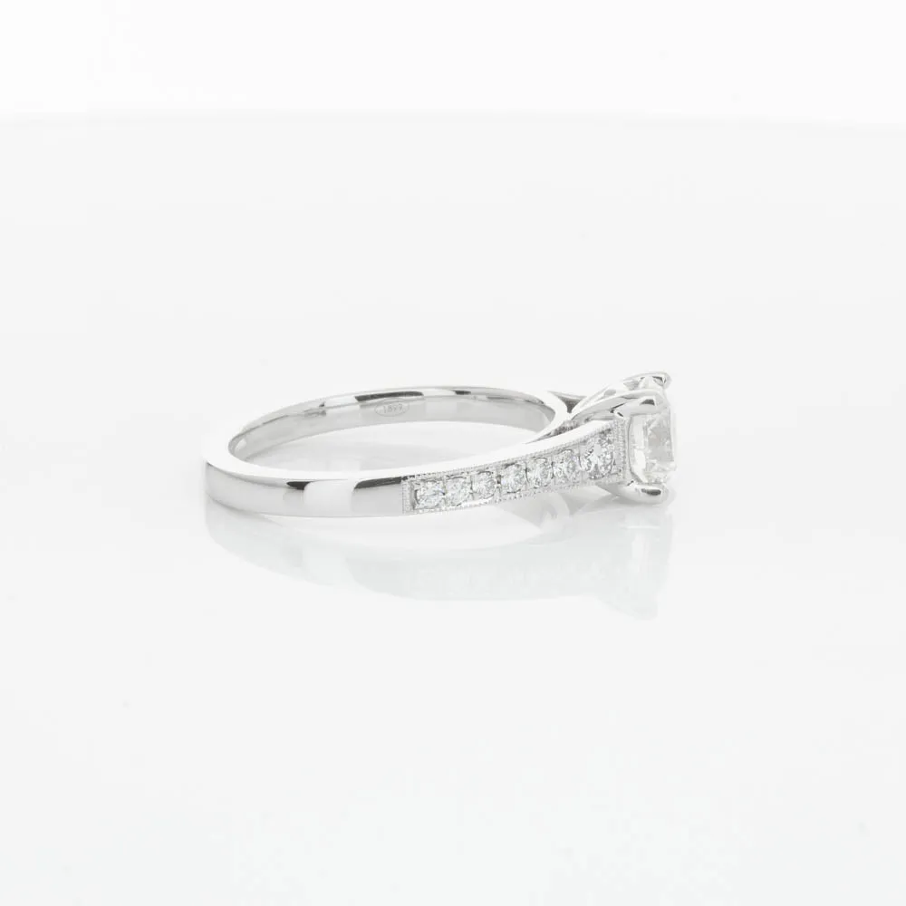 This impressive ring features a magnificent 1.01ct dazzling round brilliant cut diamond with bead set shoulders skilfully set in 18ct white gold from our signature 1899 collection.