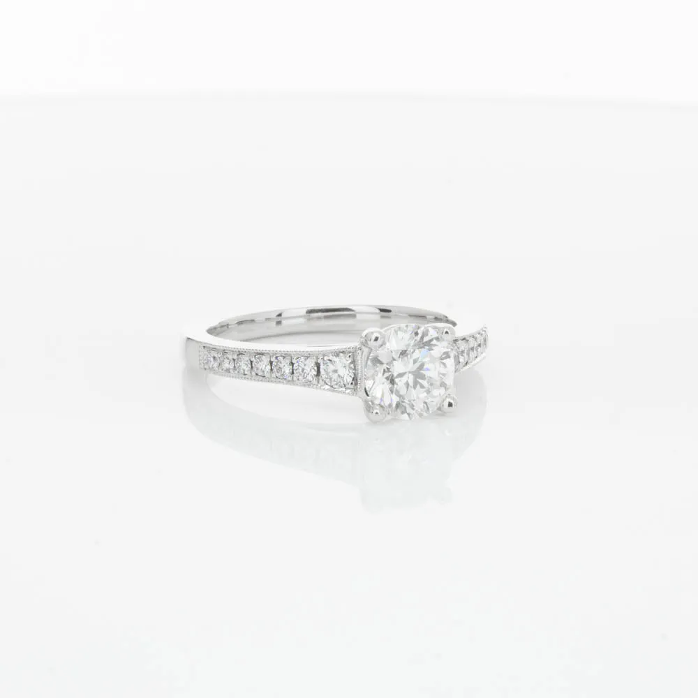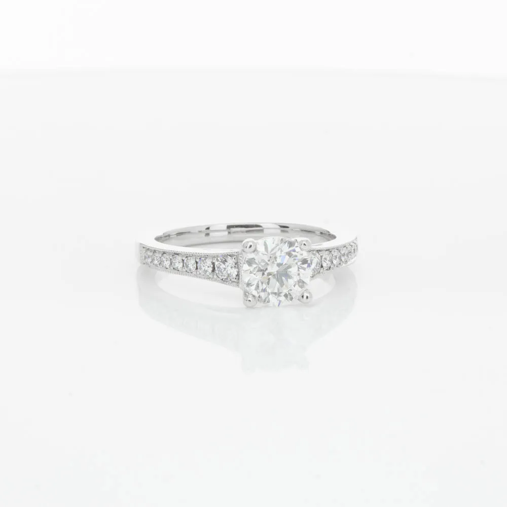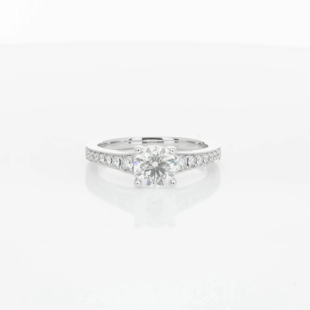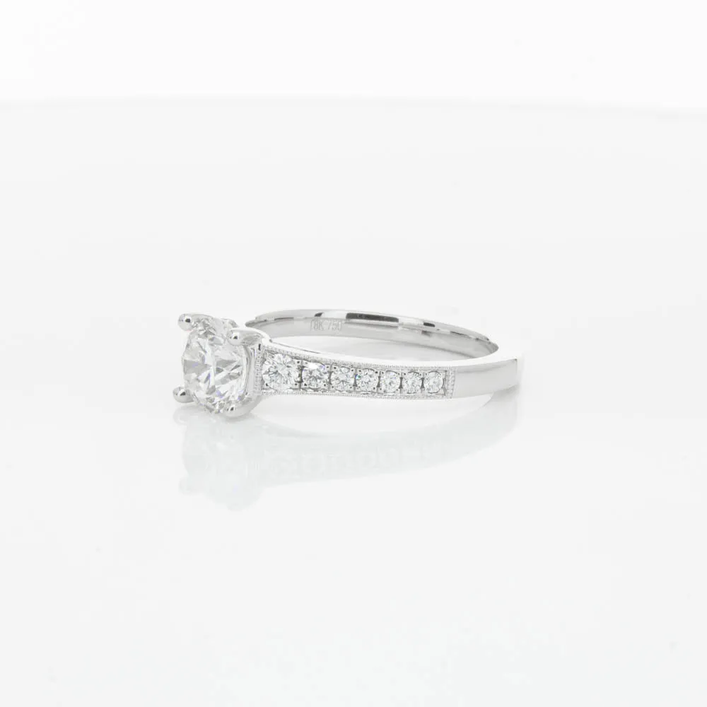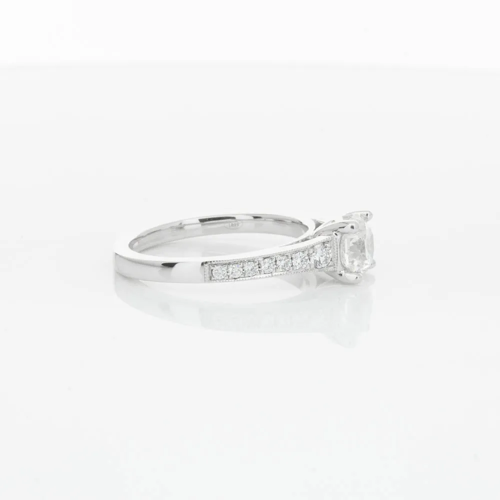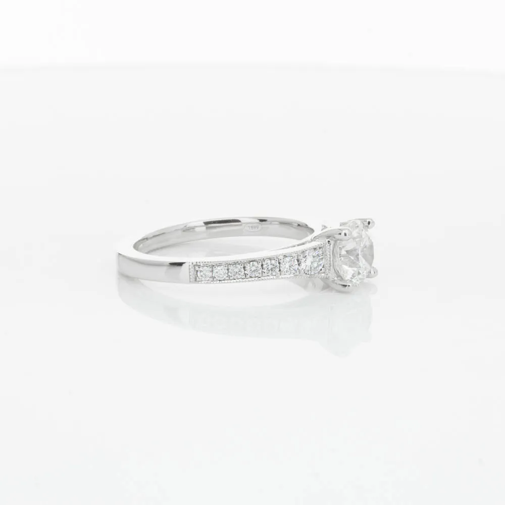 This impressive ring features a magnificent 1.01ct dazzling round brilliant cut diamond with bead set shoulders skilfully set in 18ct white gold from our signature 1899 collection.