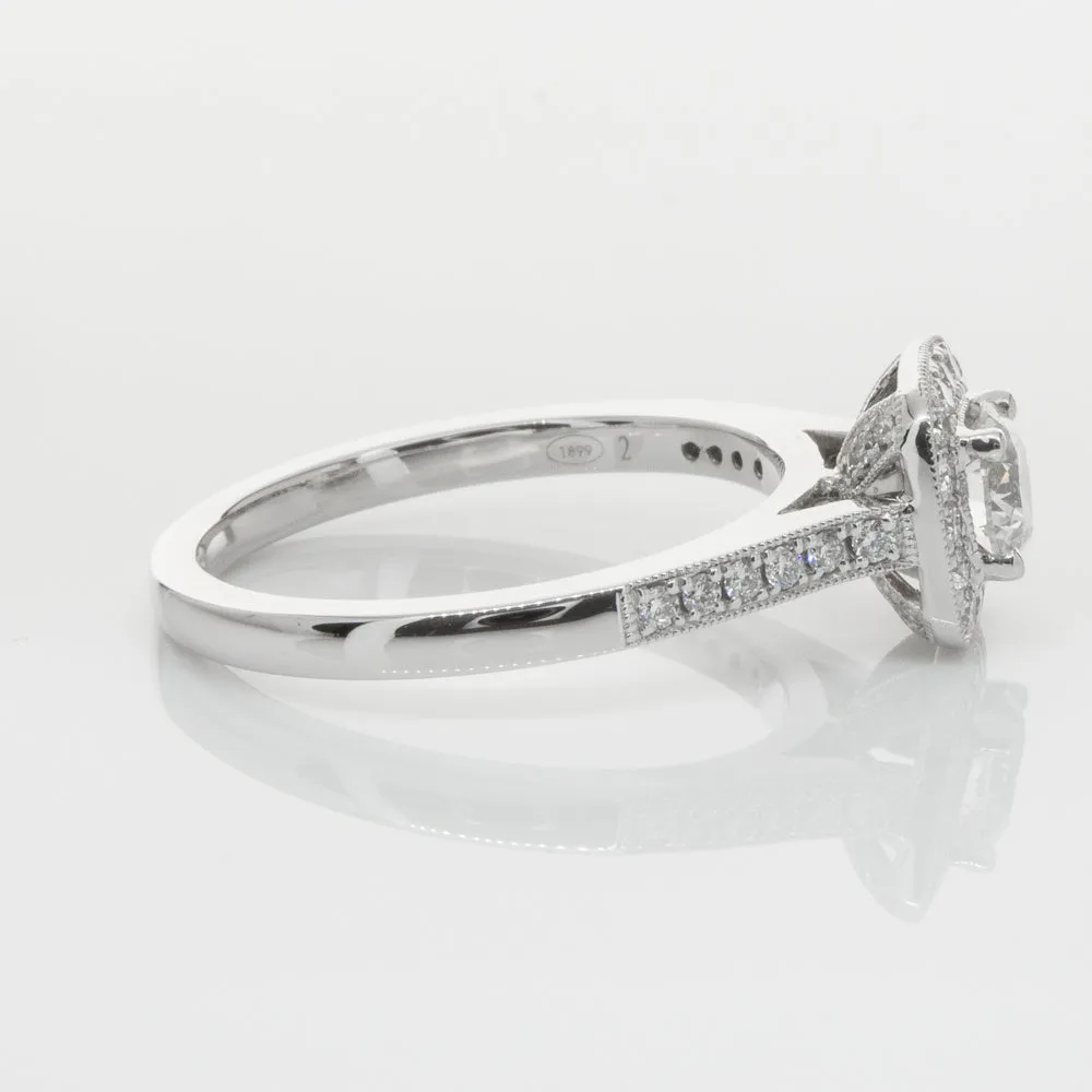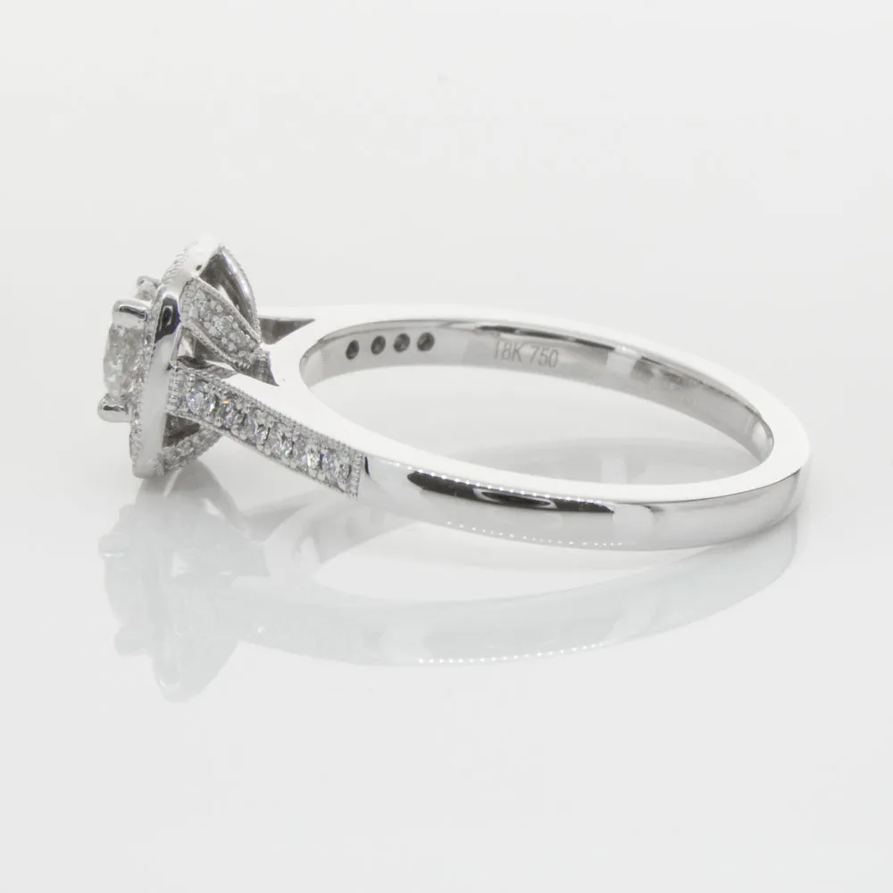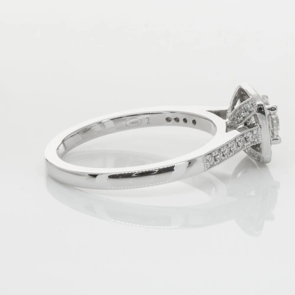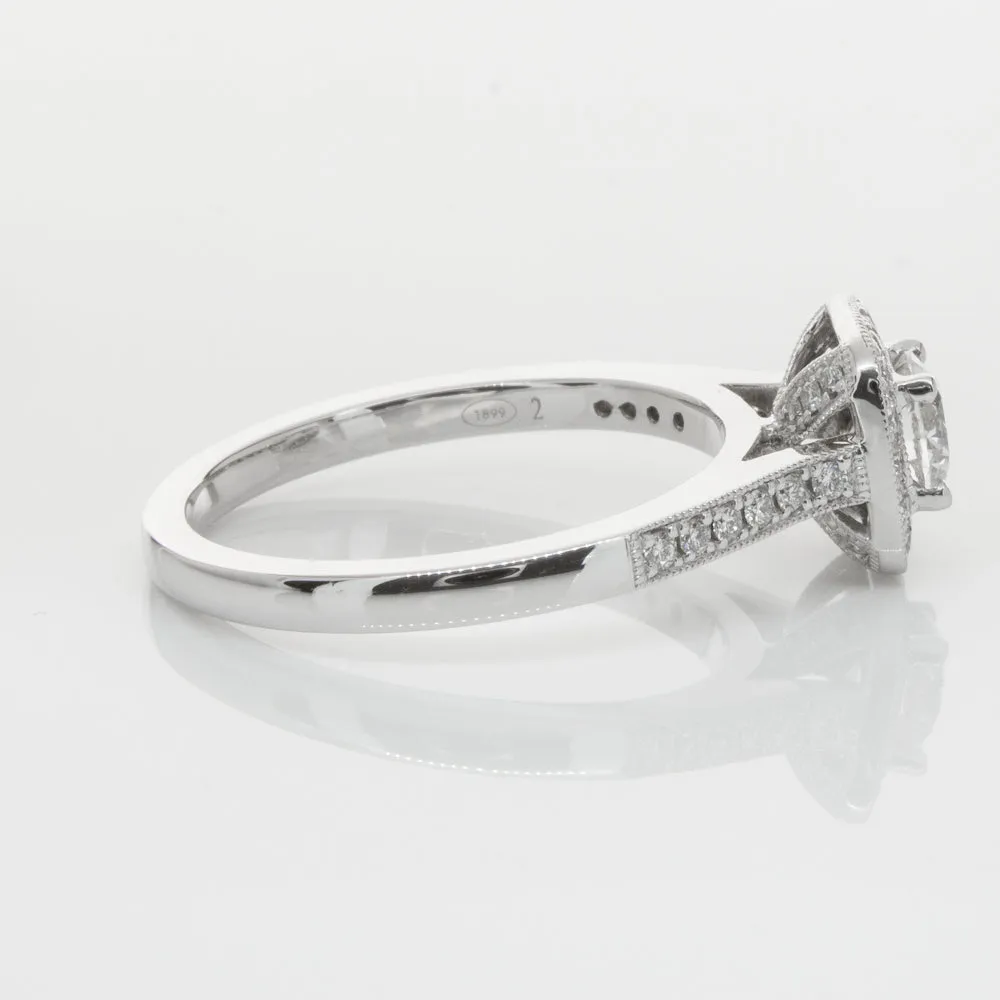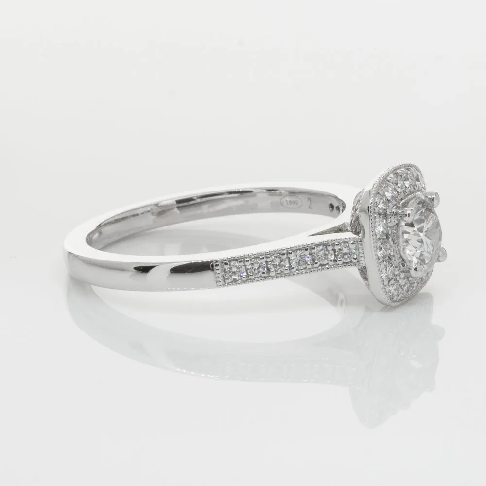 Carefully crafted in 18ct white gold from our signature 1899 collection, this stunning Aurora ring inspired by the polar lights (Aurora Borealis) boasts a .50ct round brilliant cut centre diamond framed by a dazzling halo of white diamonds, complete with diamond set shoulders.