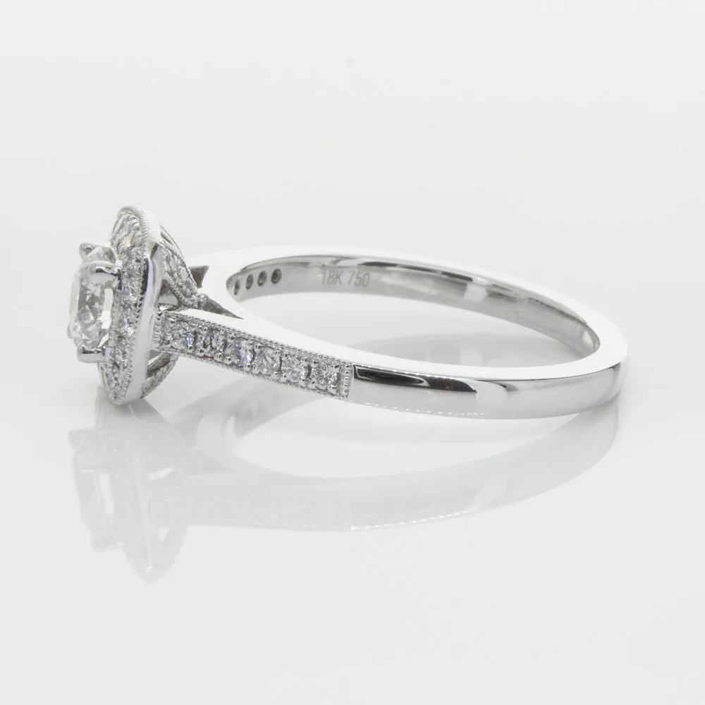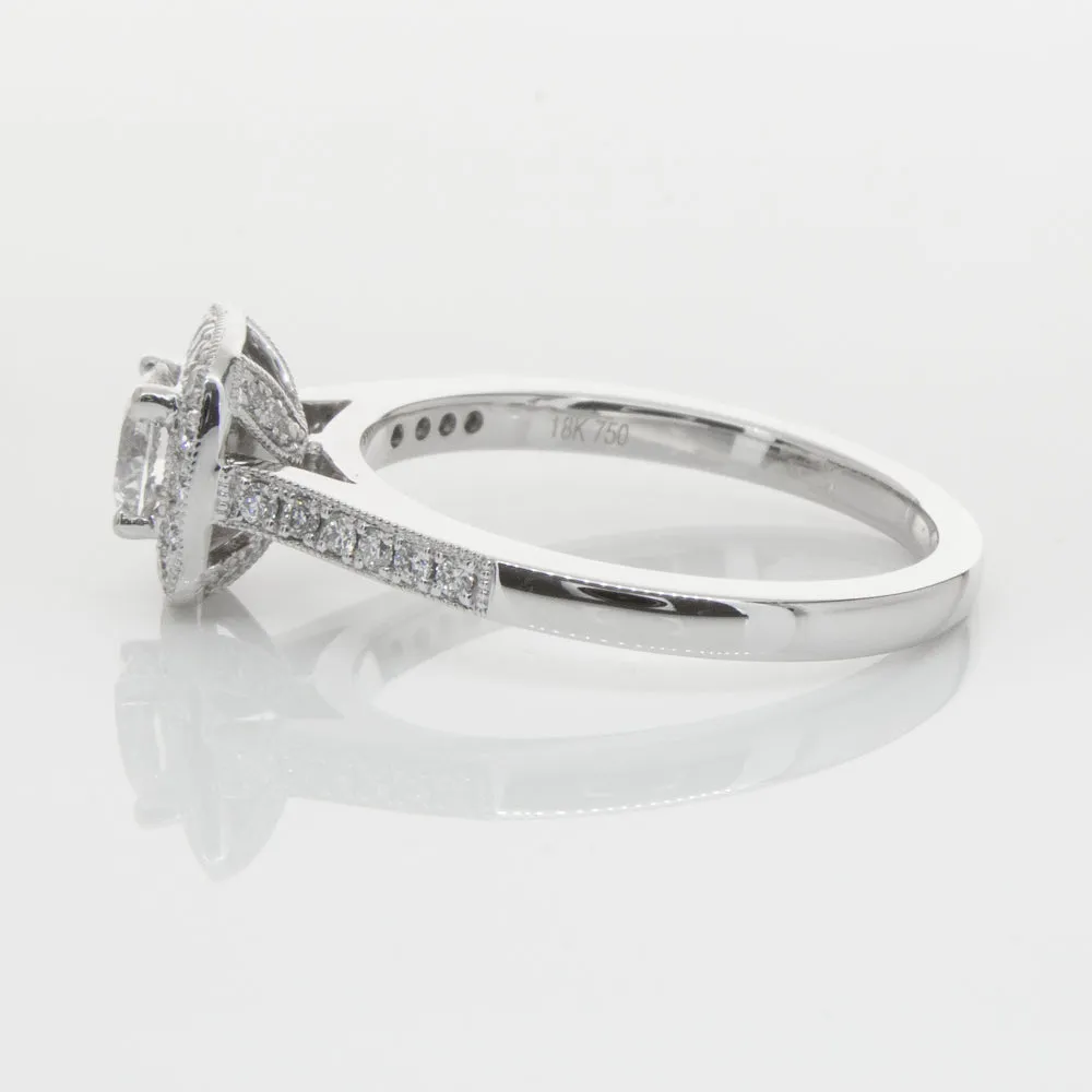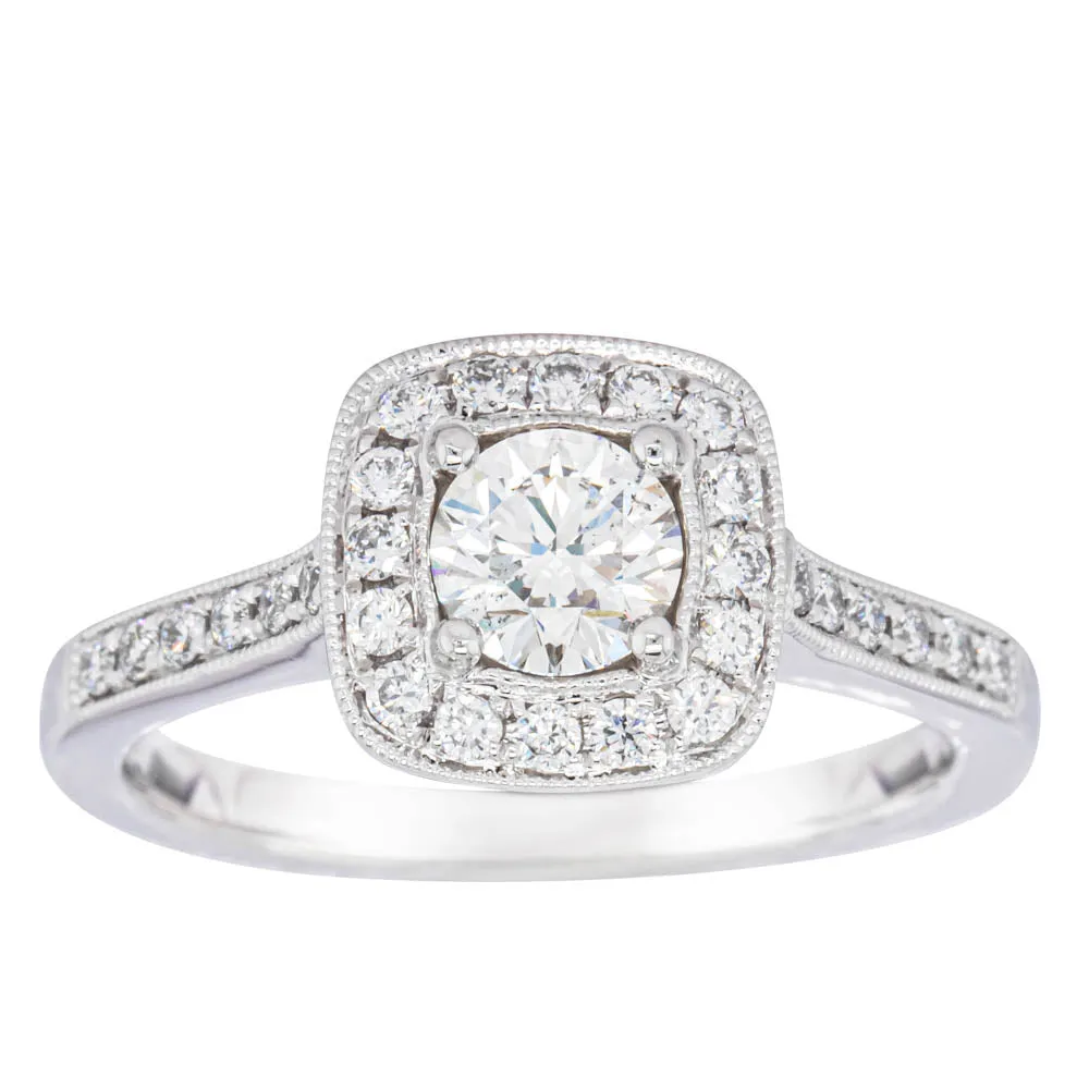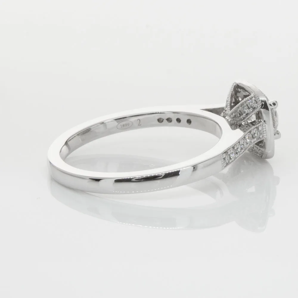 Carefully crafted in 18ct white gold from our signature 1899 collection, this stunning Aurora ring inspired by the polar lights (Aurora Borealis) boasts a .50ct round brilliant cut centre diamond framed by a dazzling halo of white diamonds, complete with diamond set shoulders.