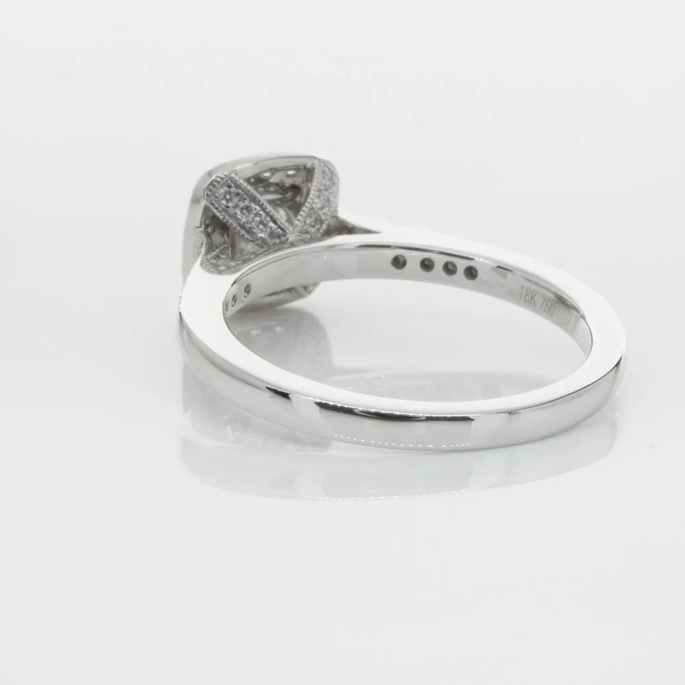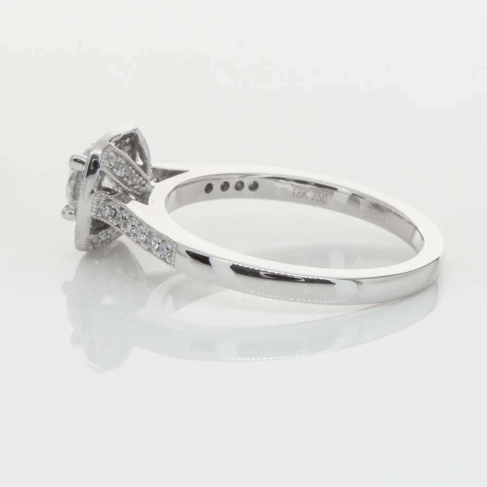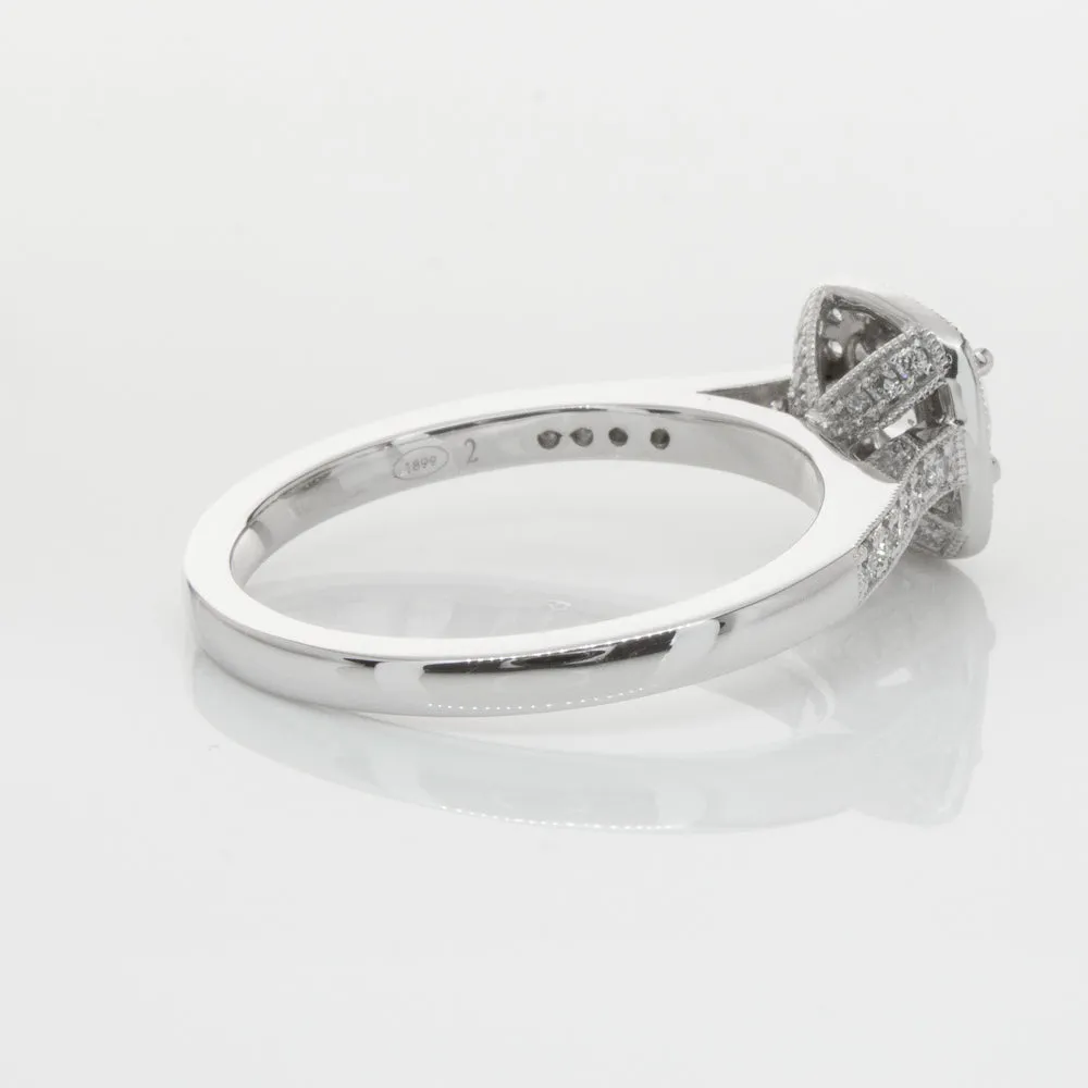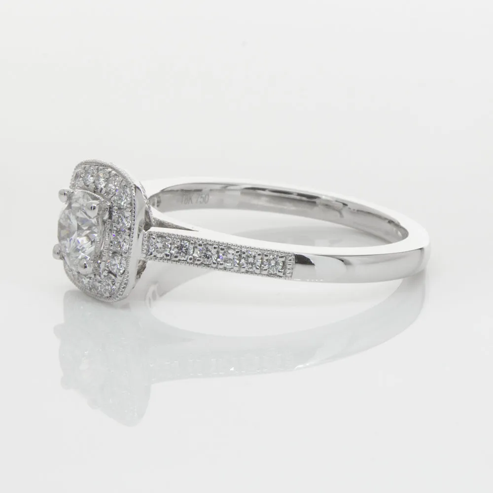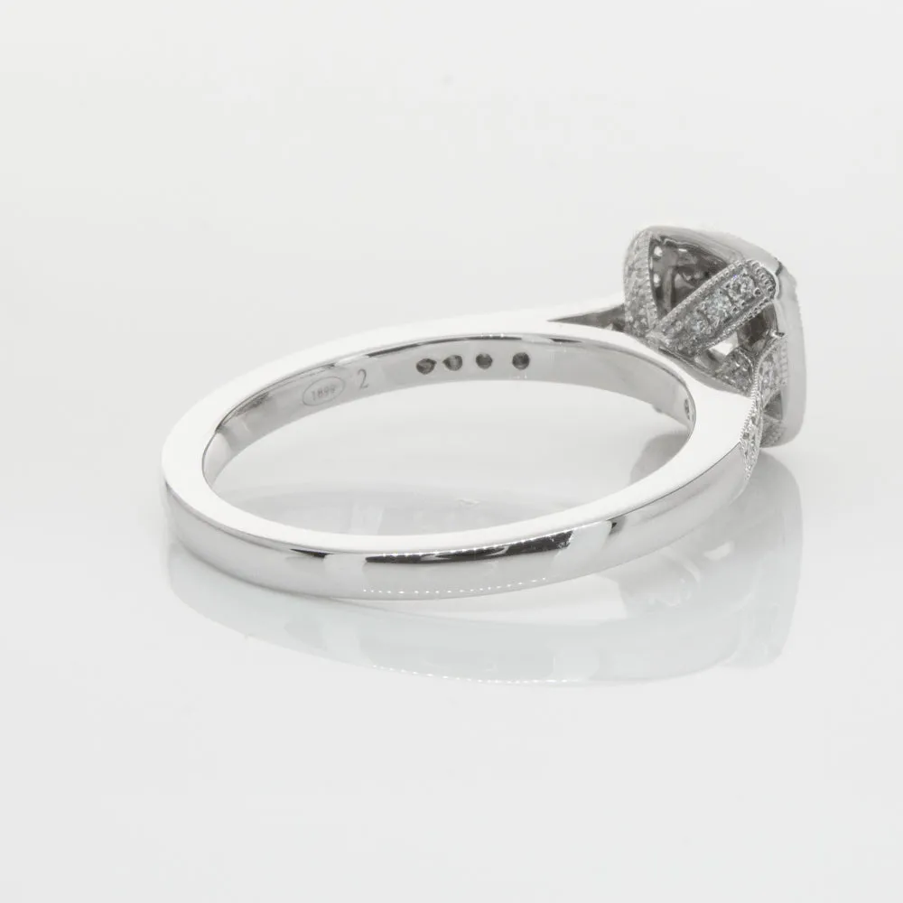 Carefully crafted in 18ct white gold from our signature 1899 collection, this stunning Aurora ring inspired by the polar lights (Aurora Borealis) boasts a .50ct round brilliant cut centre diamond framed by a dazzling halo of white diamonds, complete with diamond set shoulders.