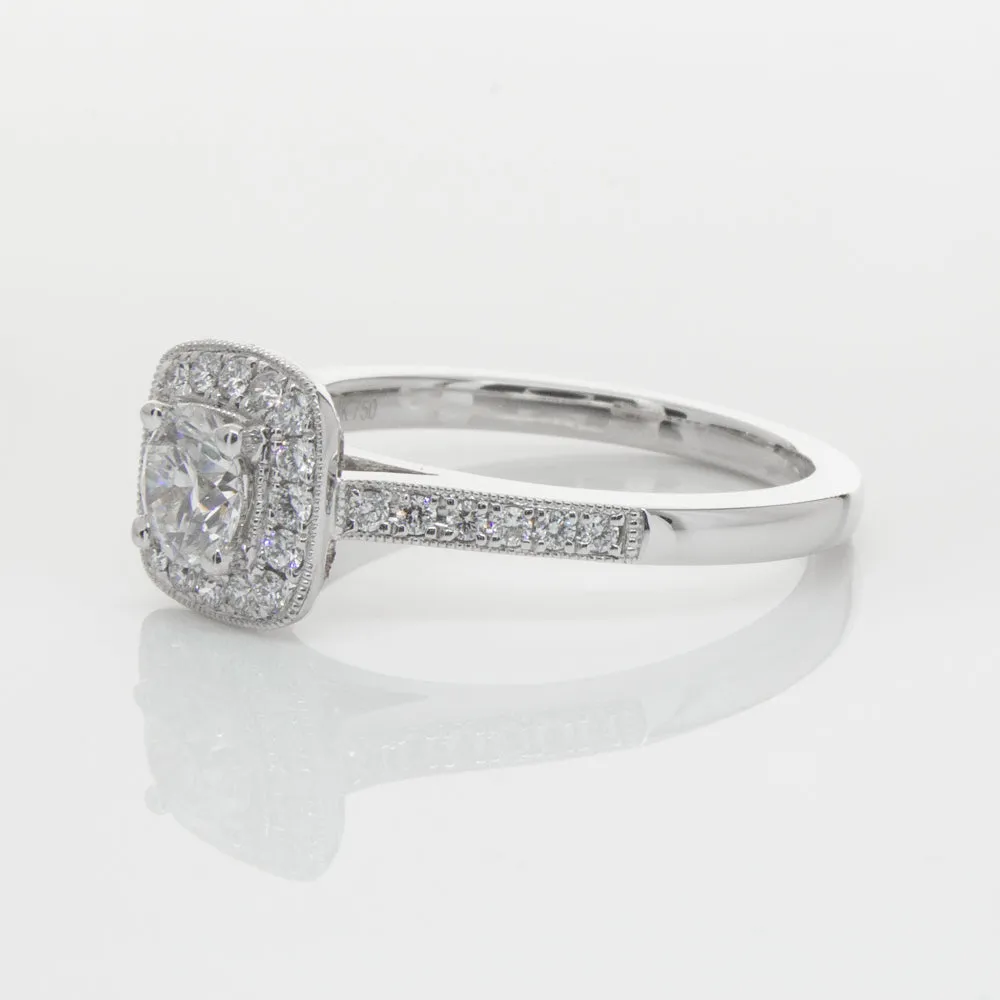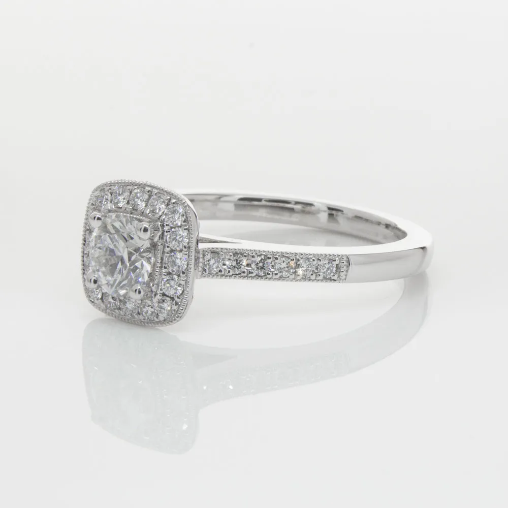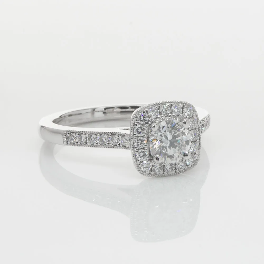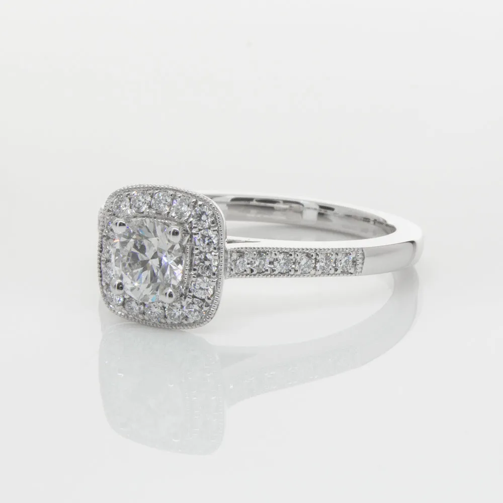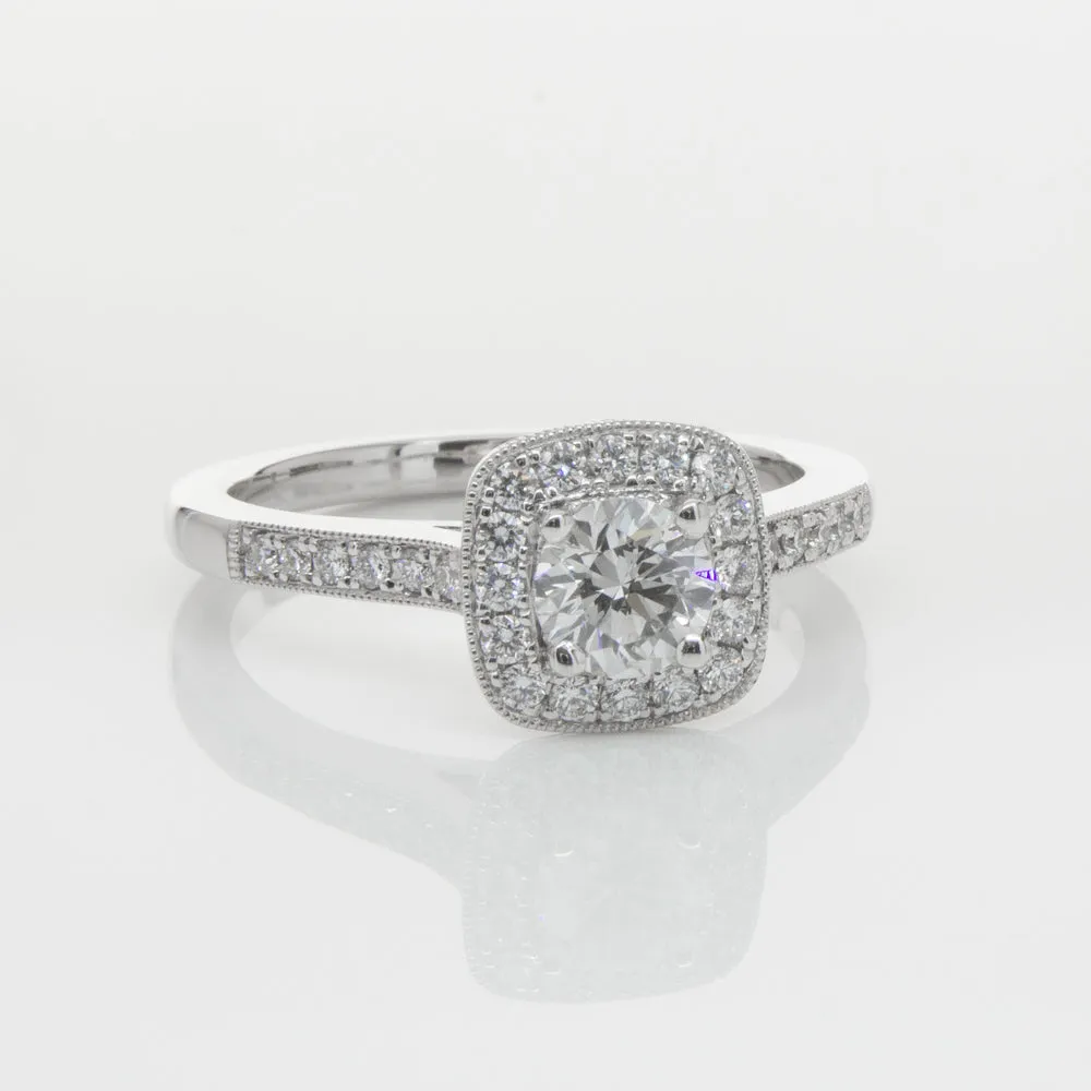 Surrounding the central diamond is a cushion shaped halo of bead set diamonds. These diamonds continue down half of each side of the band. The centre diamond is held with 4 claws and the main setting sits up to allow a band to rest against the ring and features tiny diamonds set in to the underside of the setting.