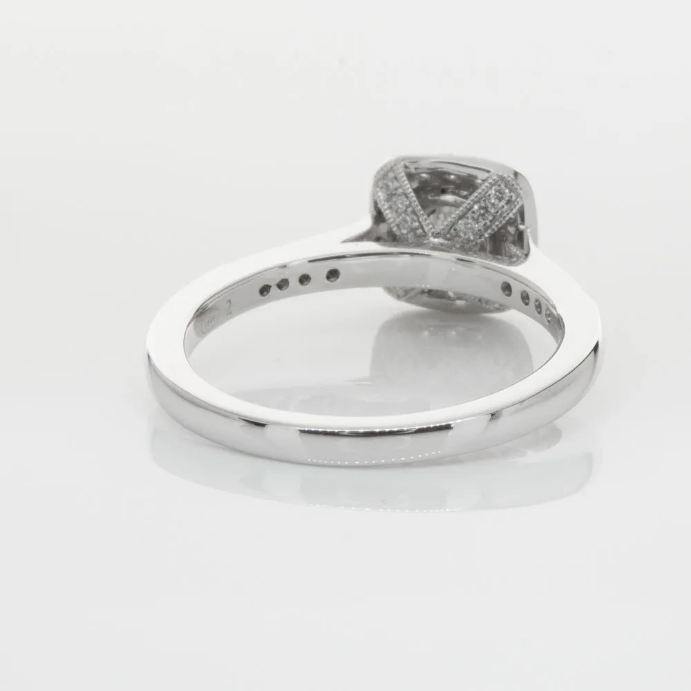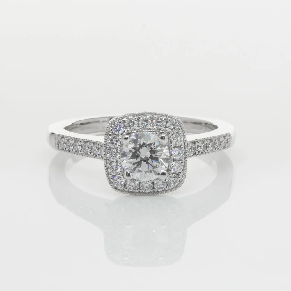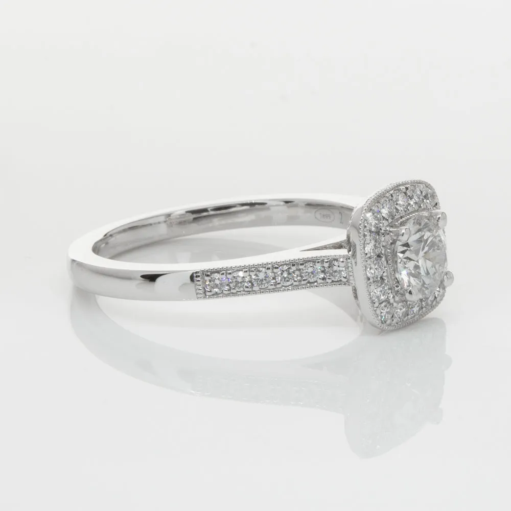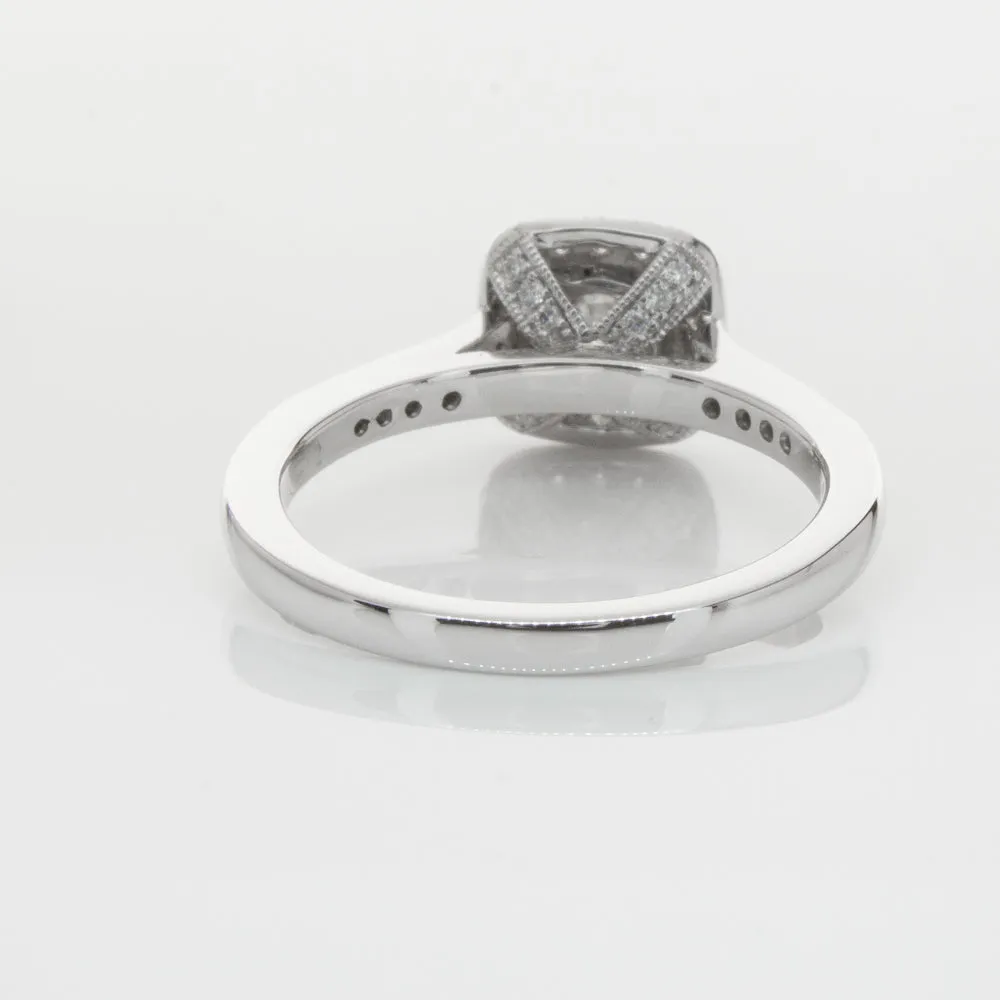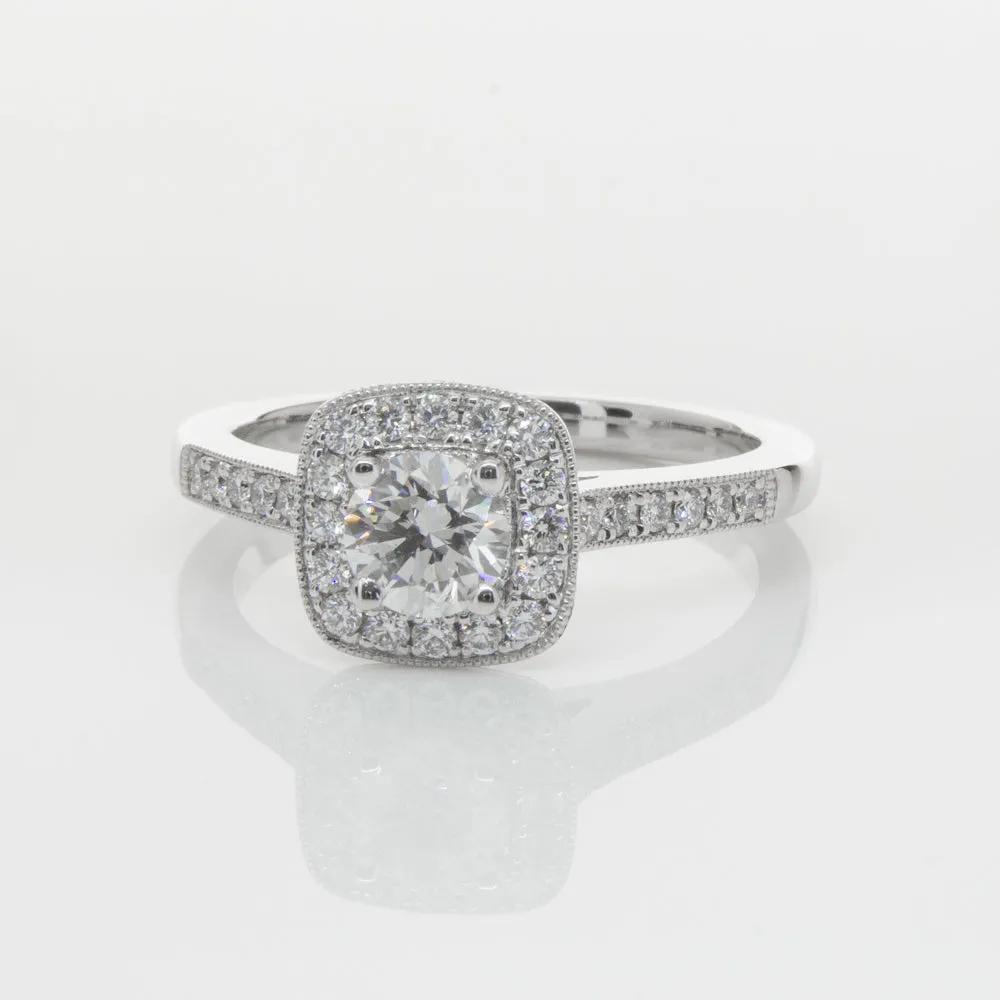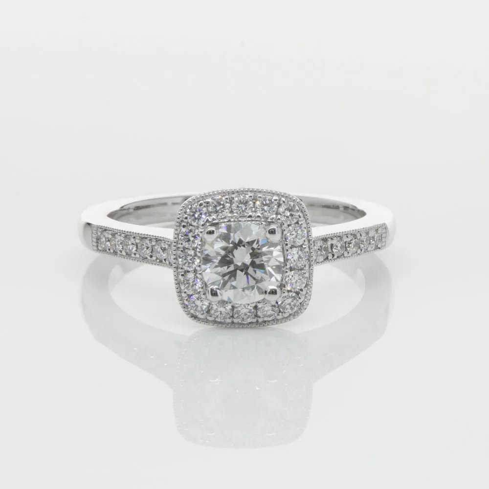 Surrounding the central diamond is a cushion shaped halo of bead set diamonds. These diamonds continue down half of each side of the band. The centre diamond is held with 4 claws and the main setting sits up to allow a band to rest against the ring and features tiny diamonds set in to the underside of the setting.