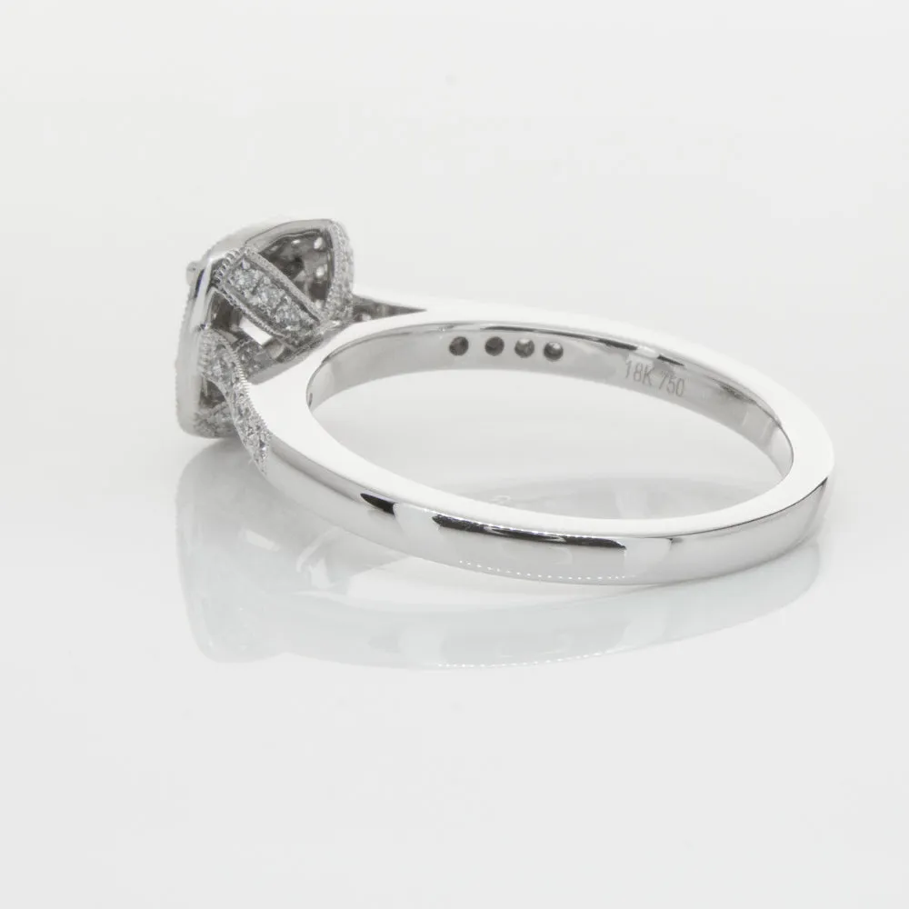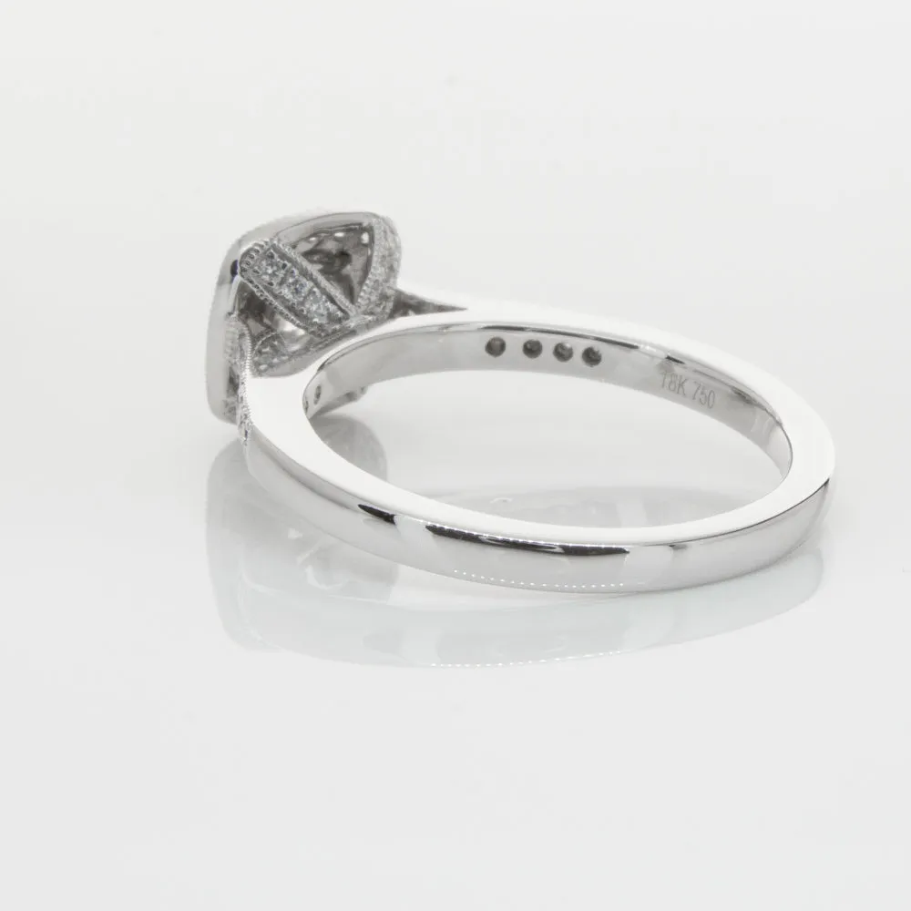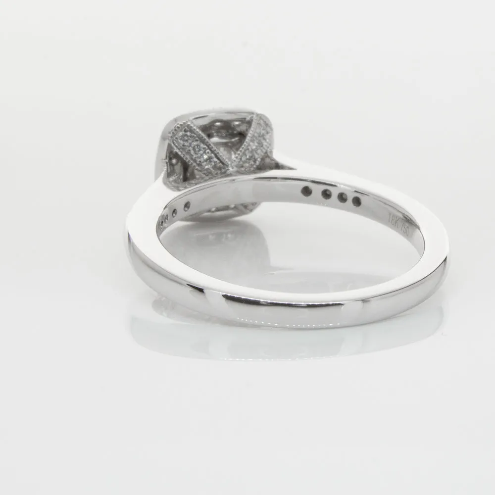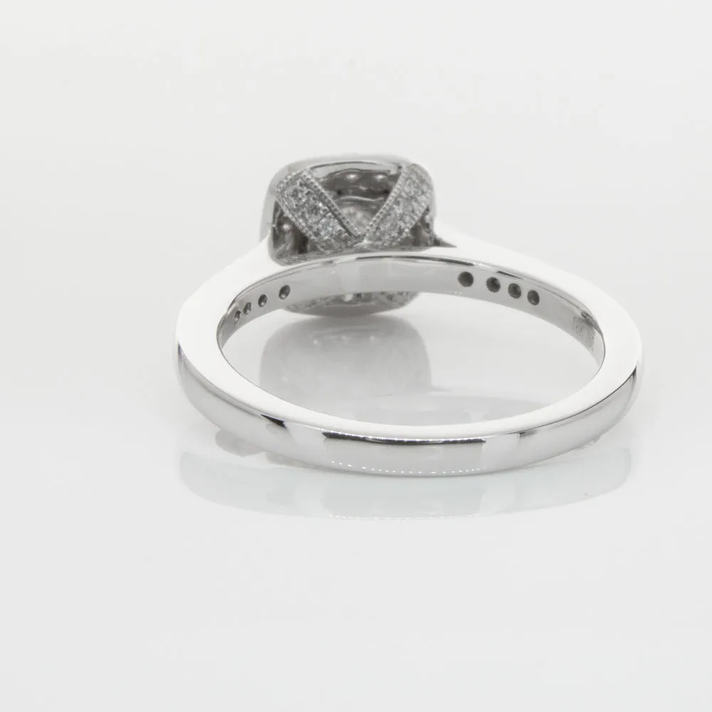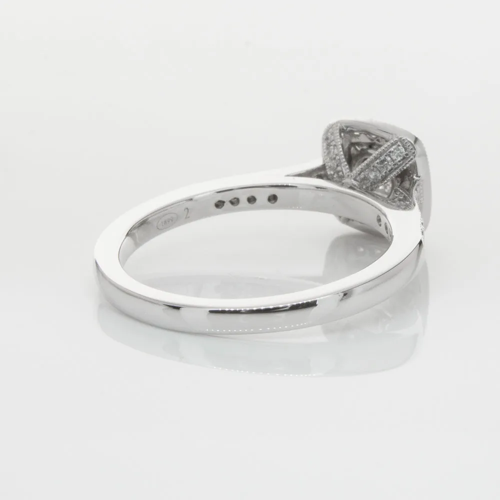 Surrounding the central diamond is a cushion shaped halo of bead set diamonds. These diamonds continue down half of each side of the band. The centre diamond is held with 4 claws and the main setting sits up to allow a band to rest against the ring and features tiny diamonds set in to the underside of the setting.