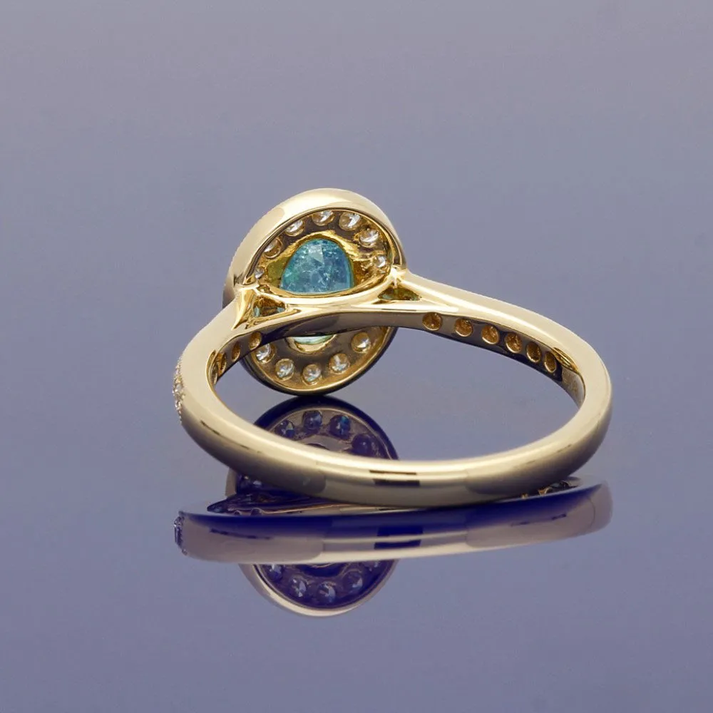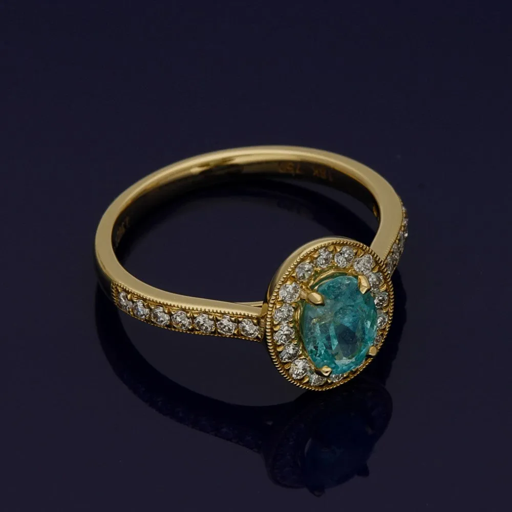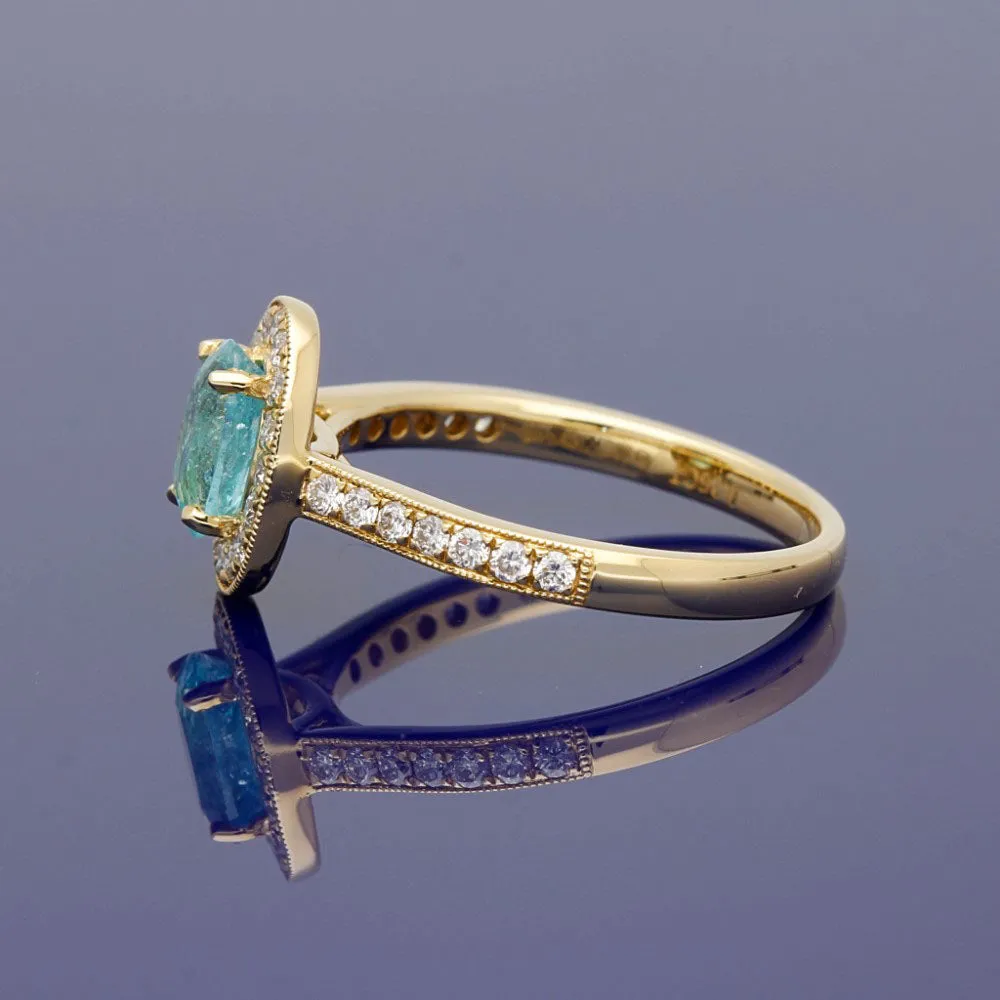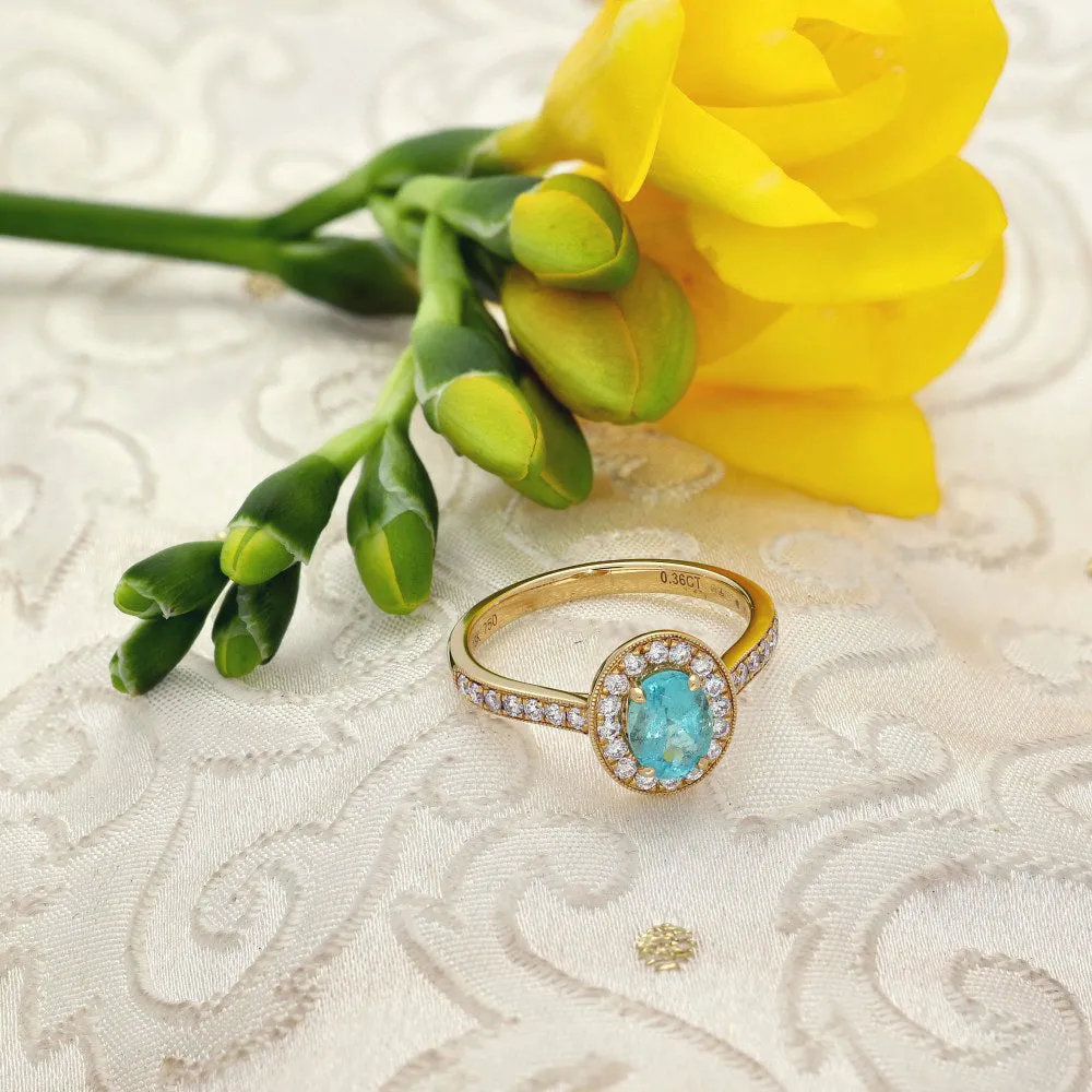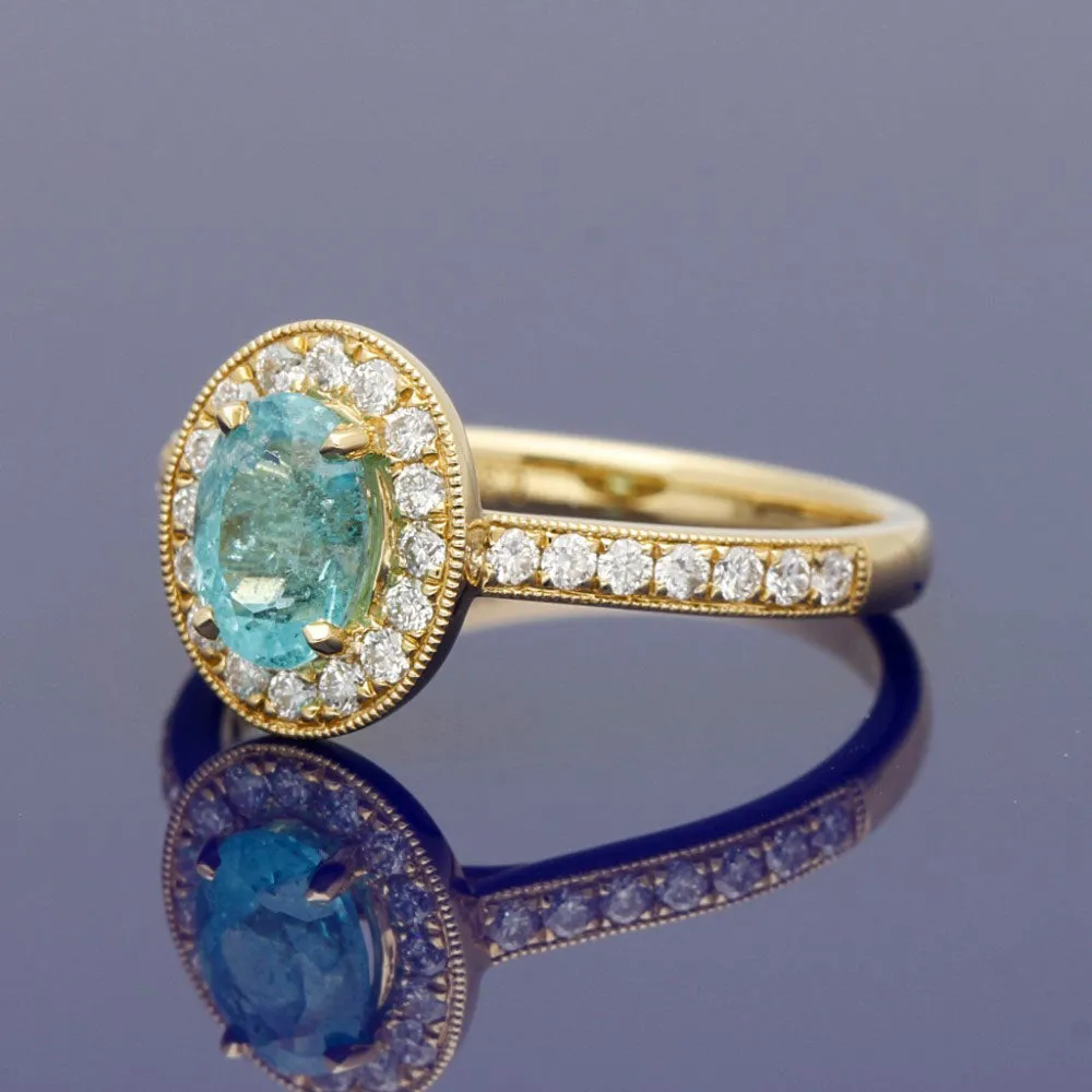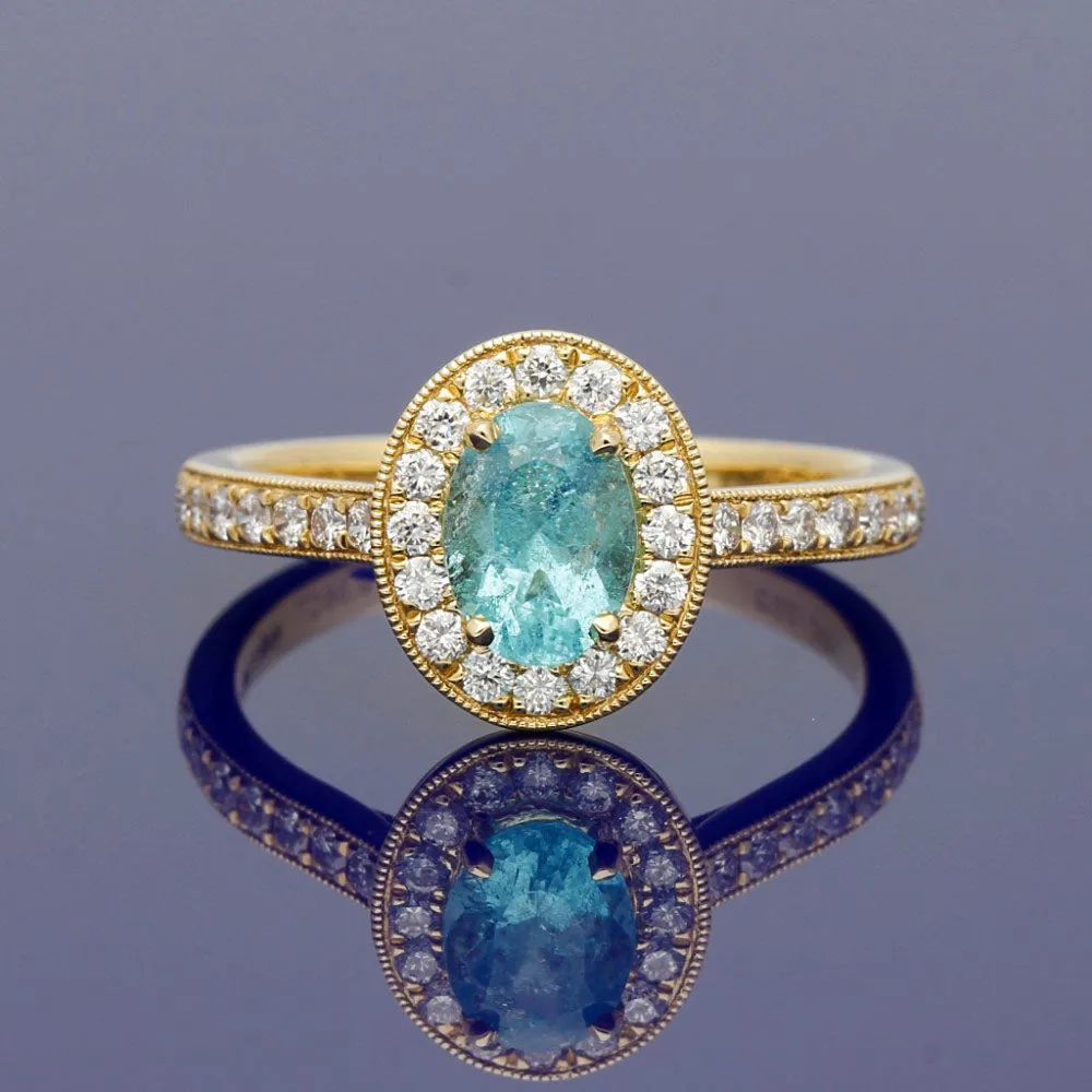 The Paraiba Tourmaline is a stunning gemstone, the vivid cyan blue is complemented by the white of the diamonds in this classic cluster ring.