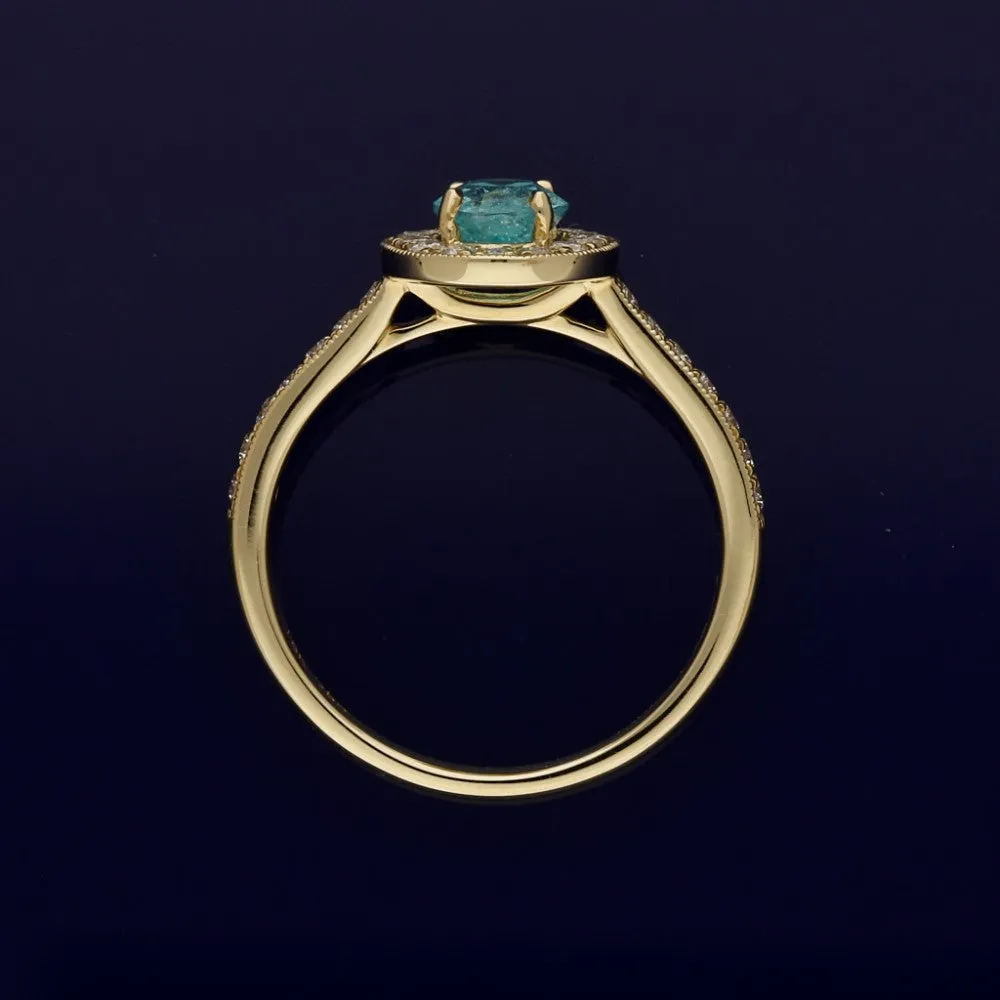 Beautifully made, the tiny twinkling diamonds are micro-grain set with a delicate bead edging, to both the halo and the shoulders, which gives a feminine dainty look to the ring.