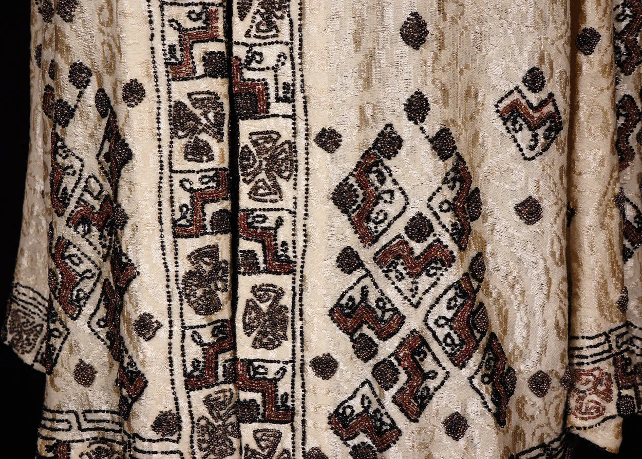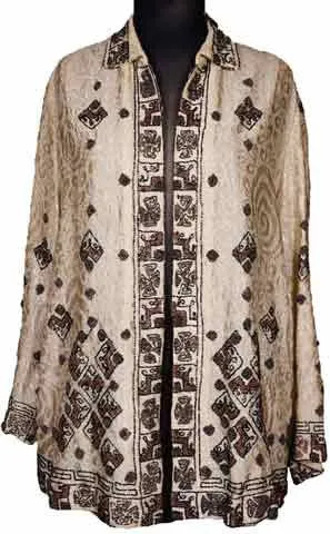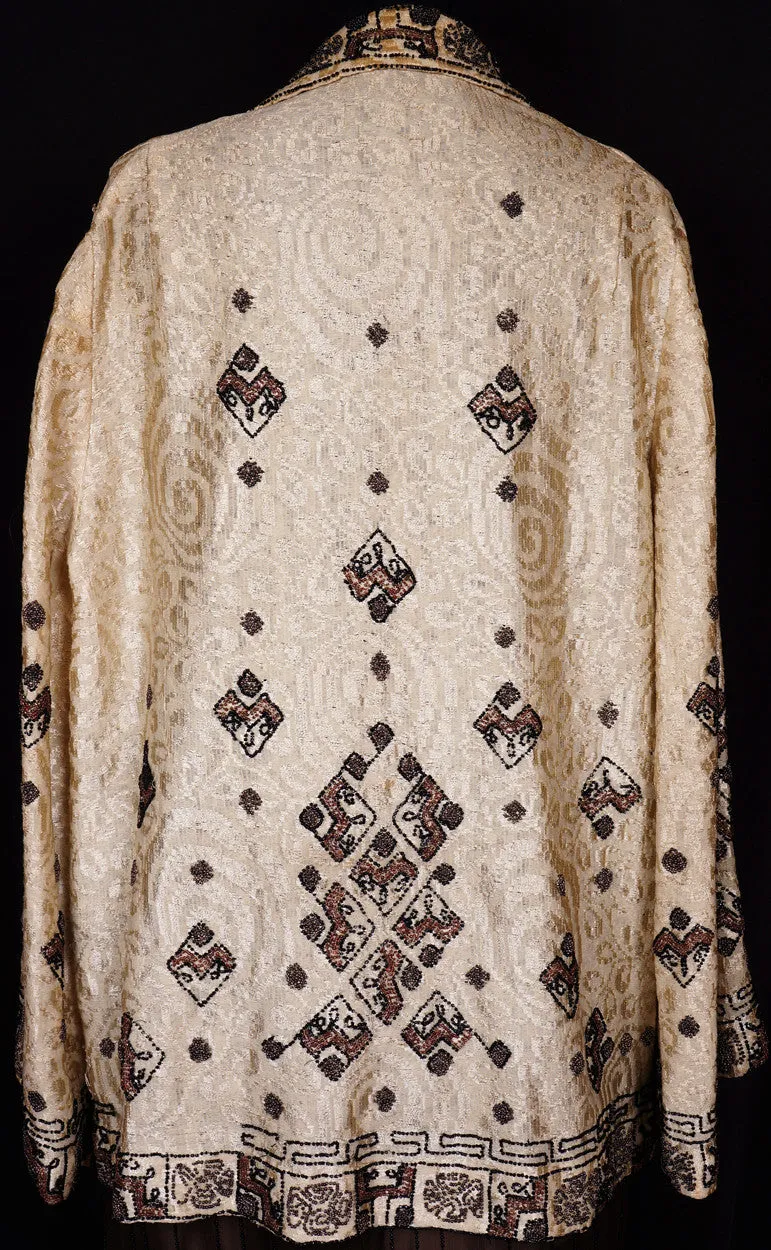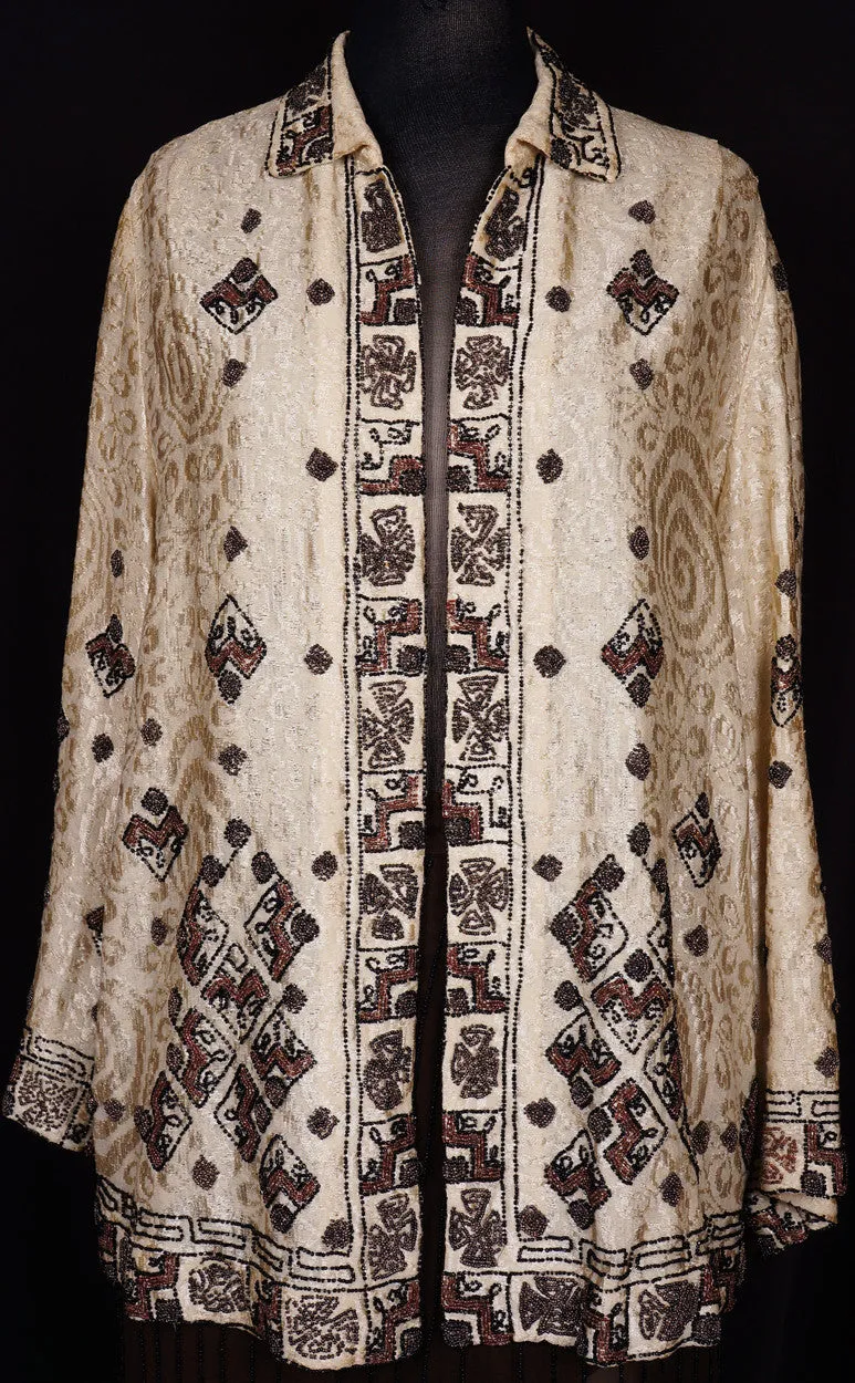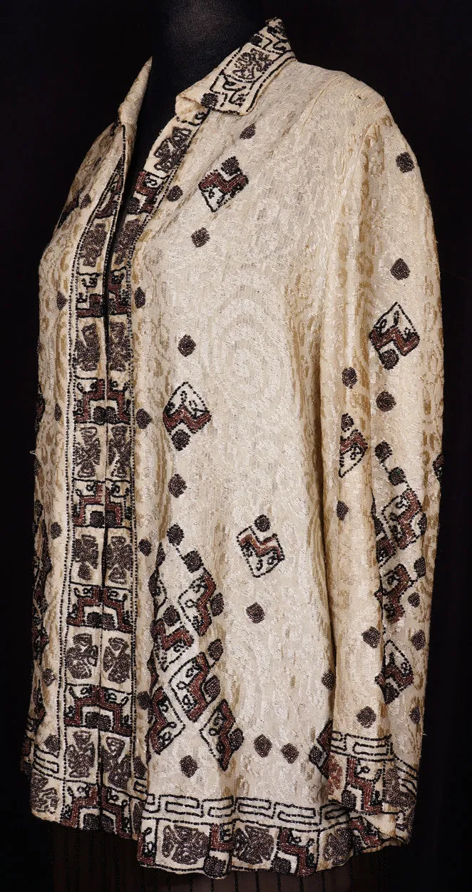 Gorgeous 1920s era beaded jacket that features an art deco inspired design on a woven silk and wool fabric. Woven silk forms a glossy pattern on the matte wool base. Beading is in black and brown geometric motifs, the principle one bearing resemblance to a lion rampant, originally used as the Royal Standard of Scotland, dating back to 1222. Jacket is made in a simple style with long sleeves, beaded collar and opening with no closures. No lining.