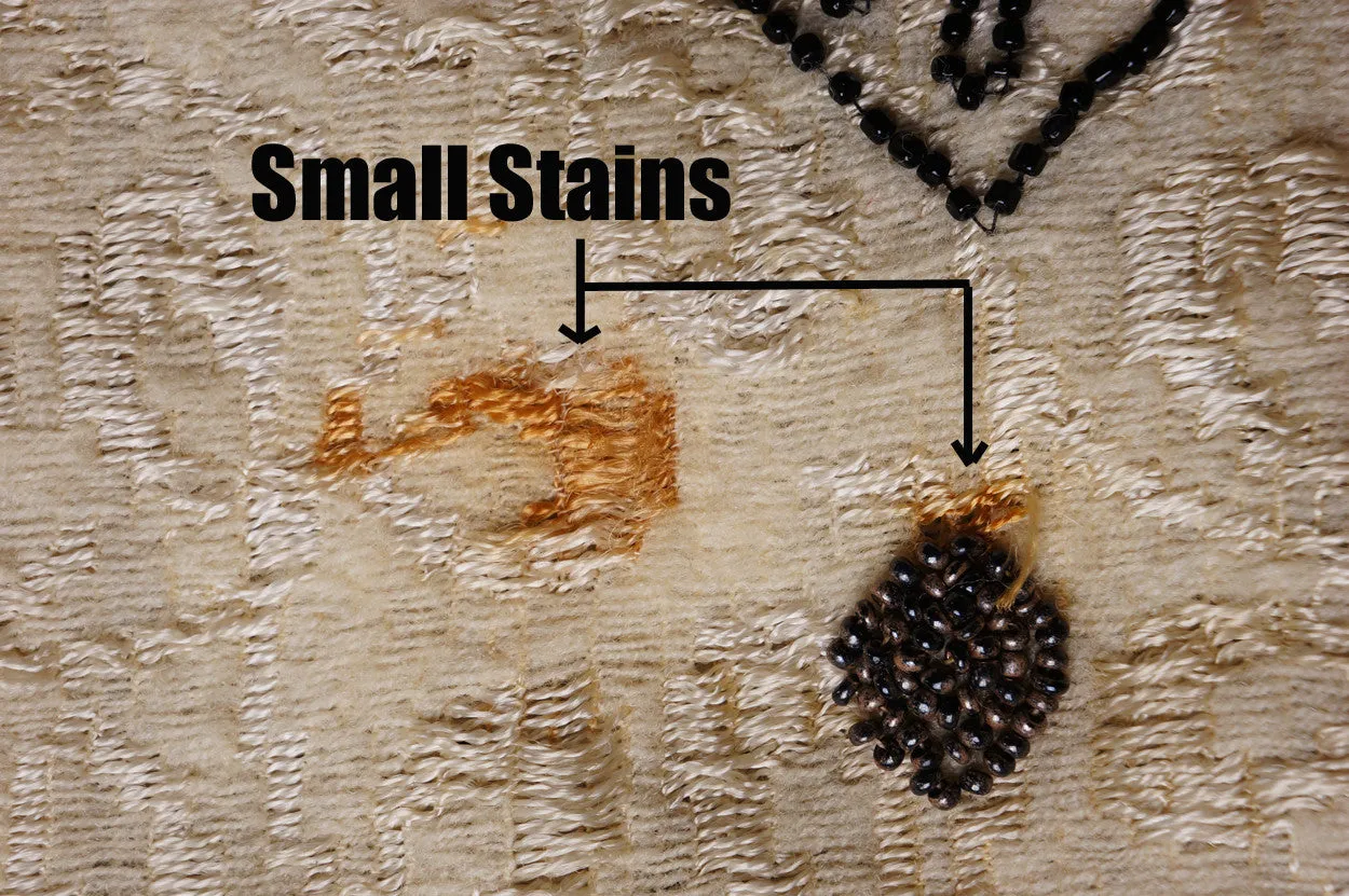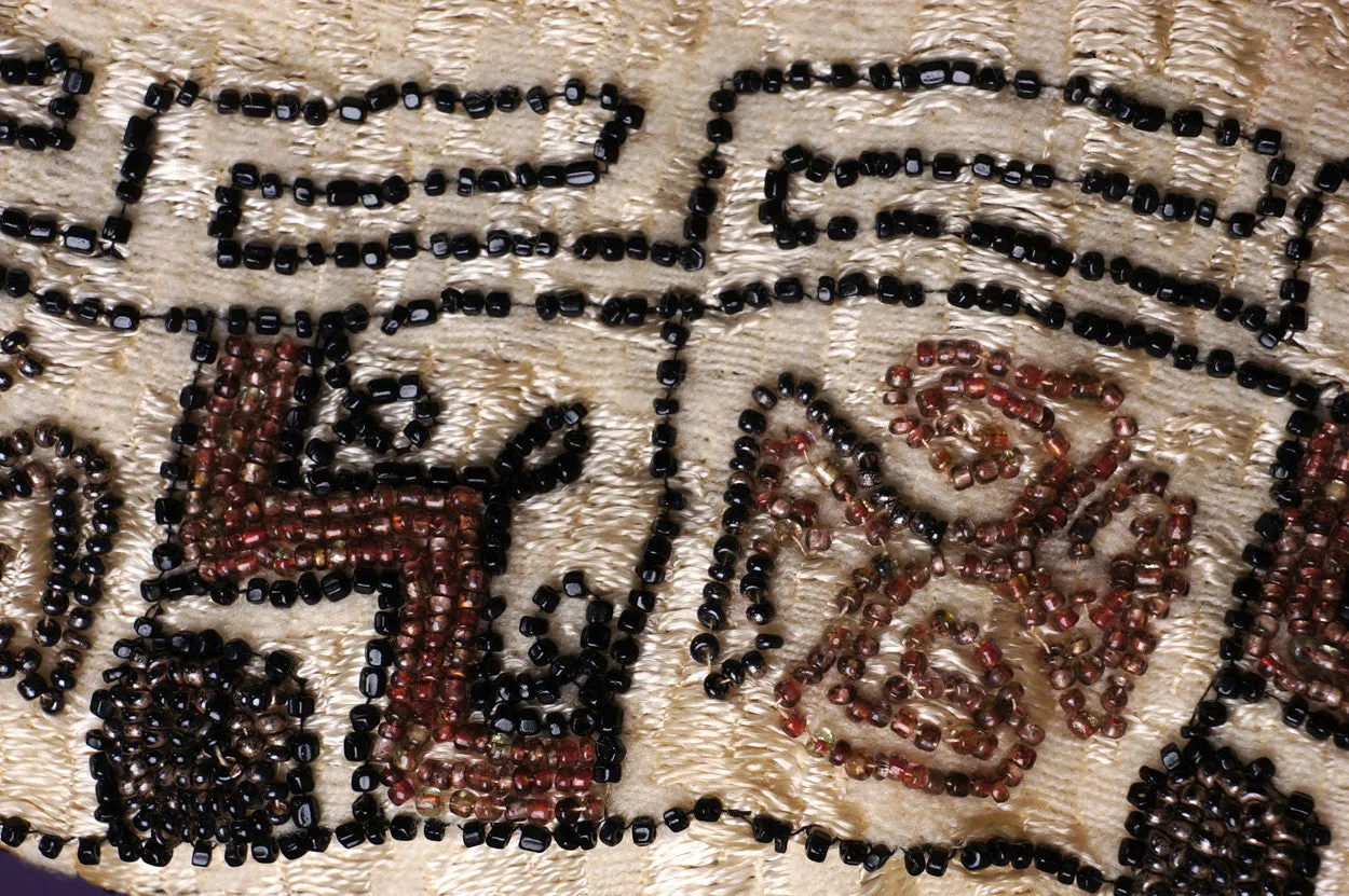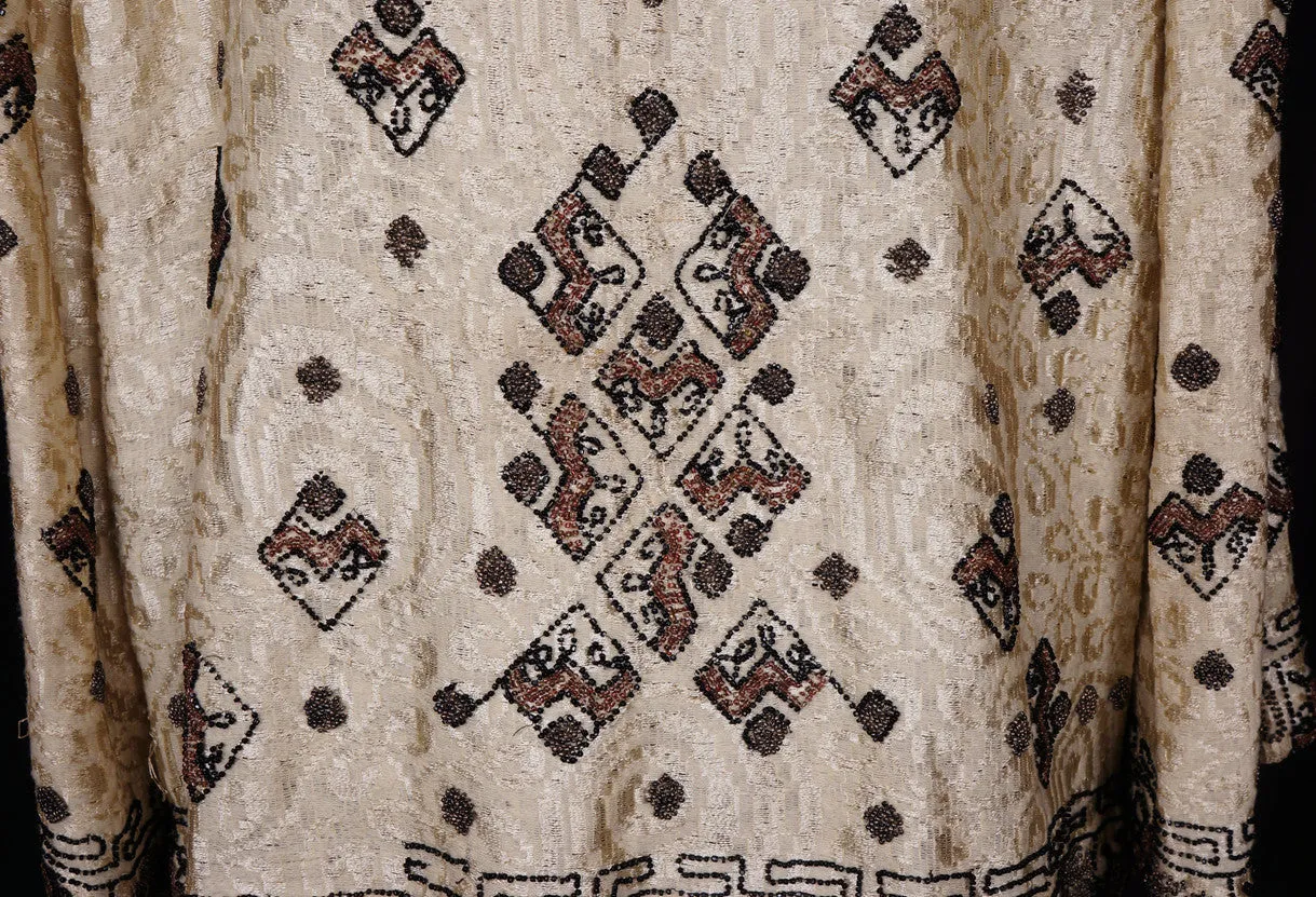Gorgeous 1920s era beaded jacket that features an art deco inspired design on a woven silk and wool fabric. Woven silk forms a glossy pattern on the matte wool base. Beading is in black and brown geometric motifs, the principle one bearing resemblance to a lion rampant, originally used as the Royal Standard of Scotland, dating back to 1222. Jacket is made in a simple style with long sleeves, beaded collar and opening with no closures. No lining.