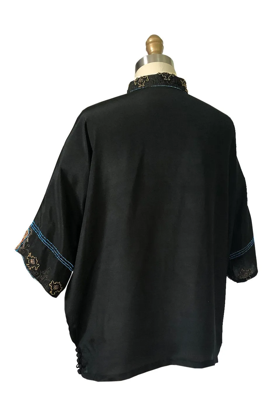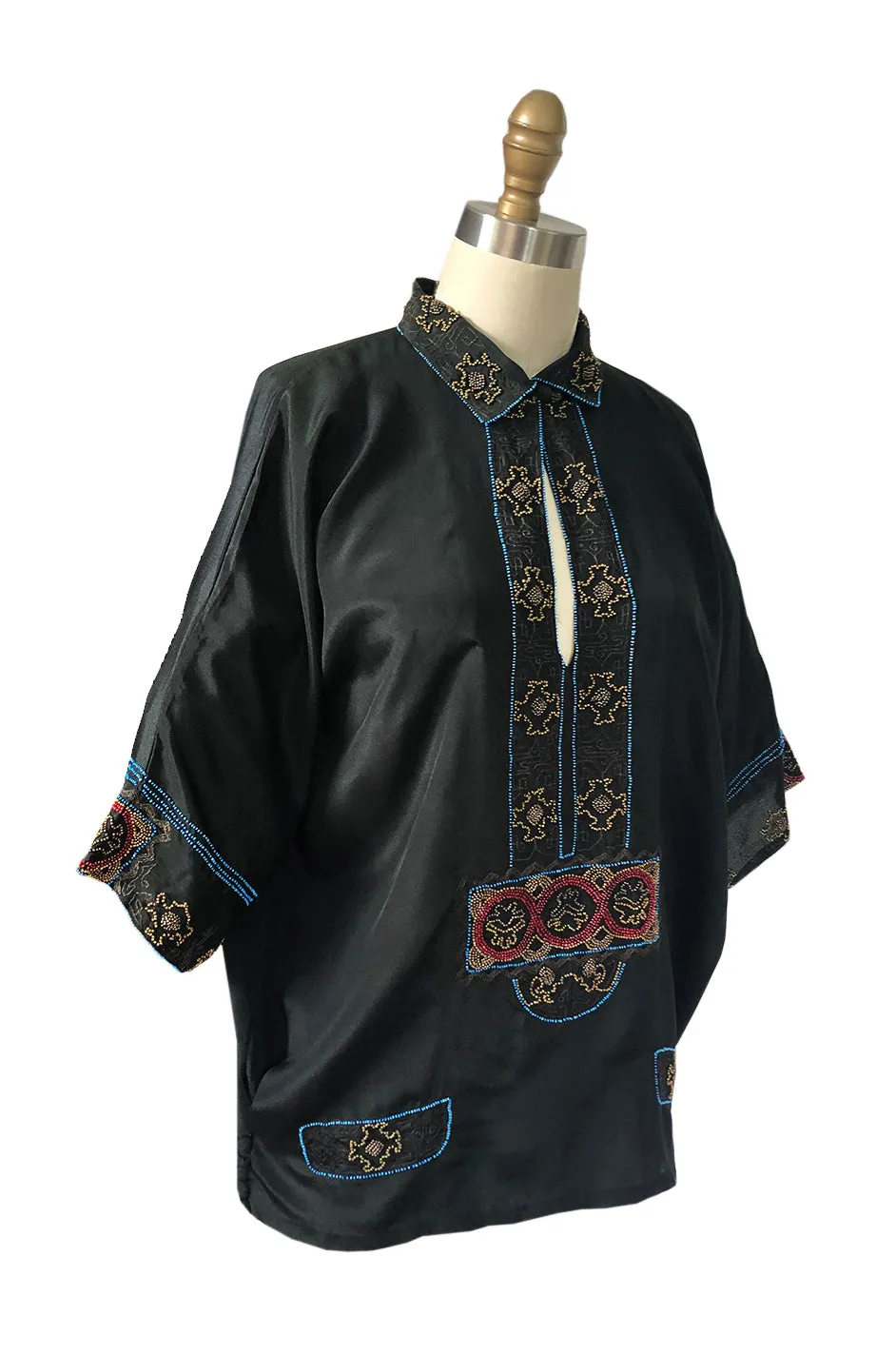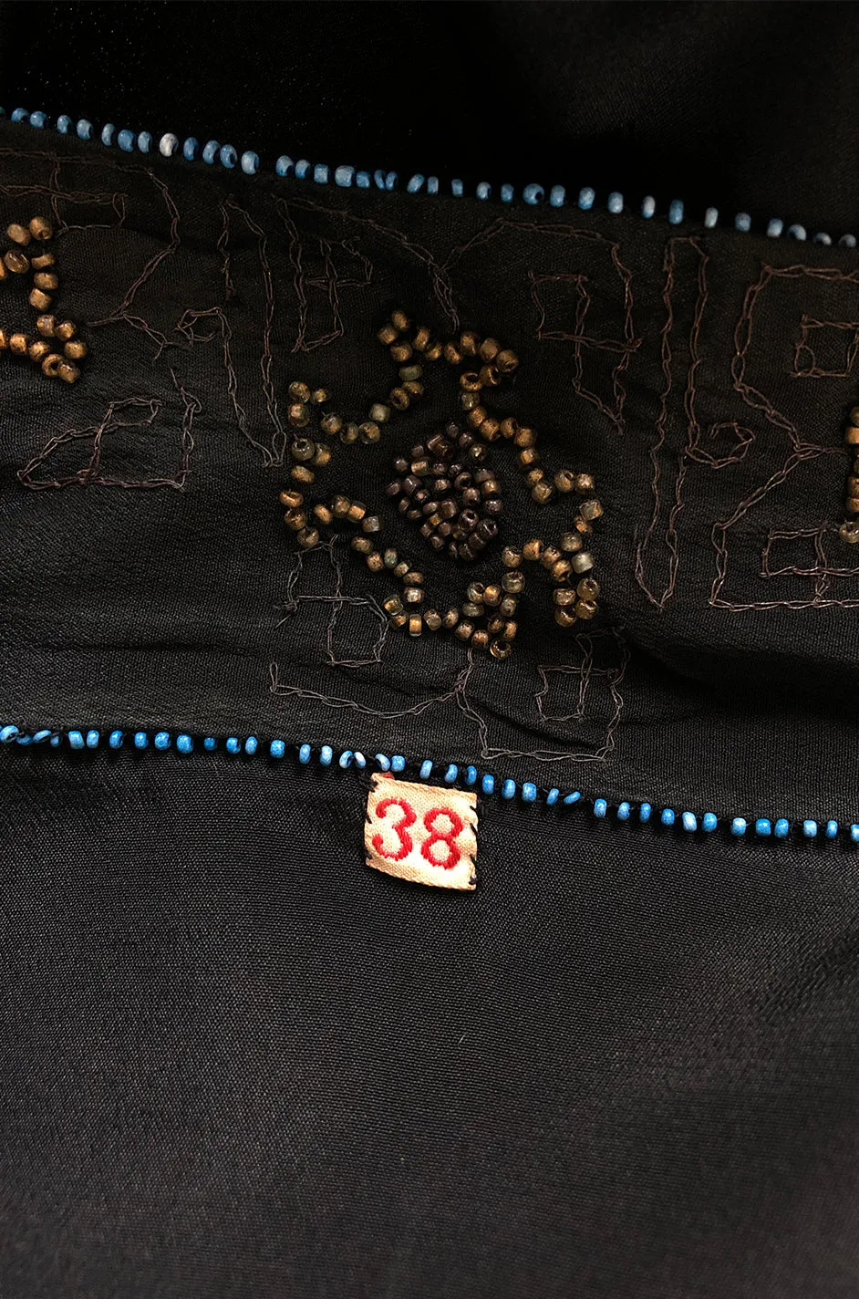 My photos come close but still cannot convey how special this top is. It looks so shockingly modern and fresh that it will literally blow you over when you see it in person. The workmanship is extraordinary. It was completely made by hand and the bead and metal thread embroidery work on it is amazing. Teeny tiny seed beads are hand applied to the collar, down the front and on each sleeve. Beads have also been used to make the decorative 'pocket' shapes at the front of each hip. The shape is perfectly twenties with a loose body that is brought in at each side of the hem by a series of silk covered buttons and loops. These fold the silk in under them so the bottom of the tunic is brought in to create the shape that you see. The bead work is placed to emphasize the silhouette and i love the mix of red, blue and gold glass seed beads used. Interspersed in the design is an embroidered metal thread that offers a subtle bit of texture to the top. If you love it in the pictures you will be extraordinarily happy when it arrives. It is in extremely good condition and has its Made in France tag and size tag intact and if someone told me it was a Chanel or the equivalent I would not be surprised. It is strong and wearable with care - it is after all almost 100 years old. A true work of art. Excellent condition.