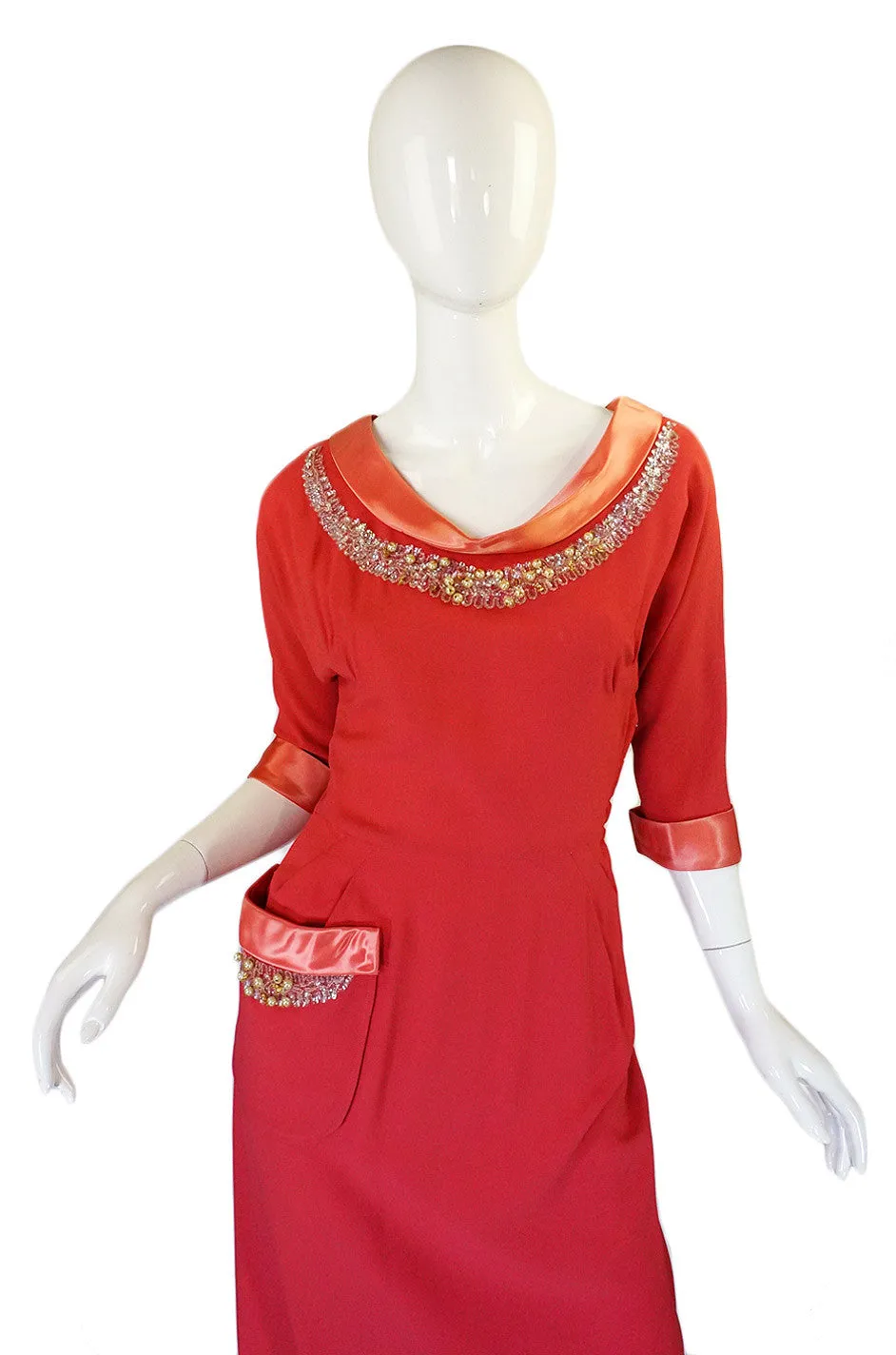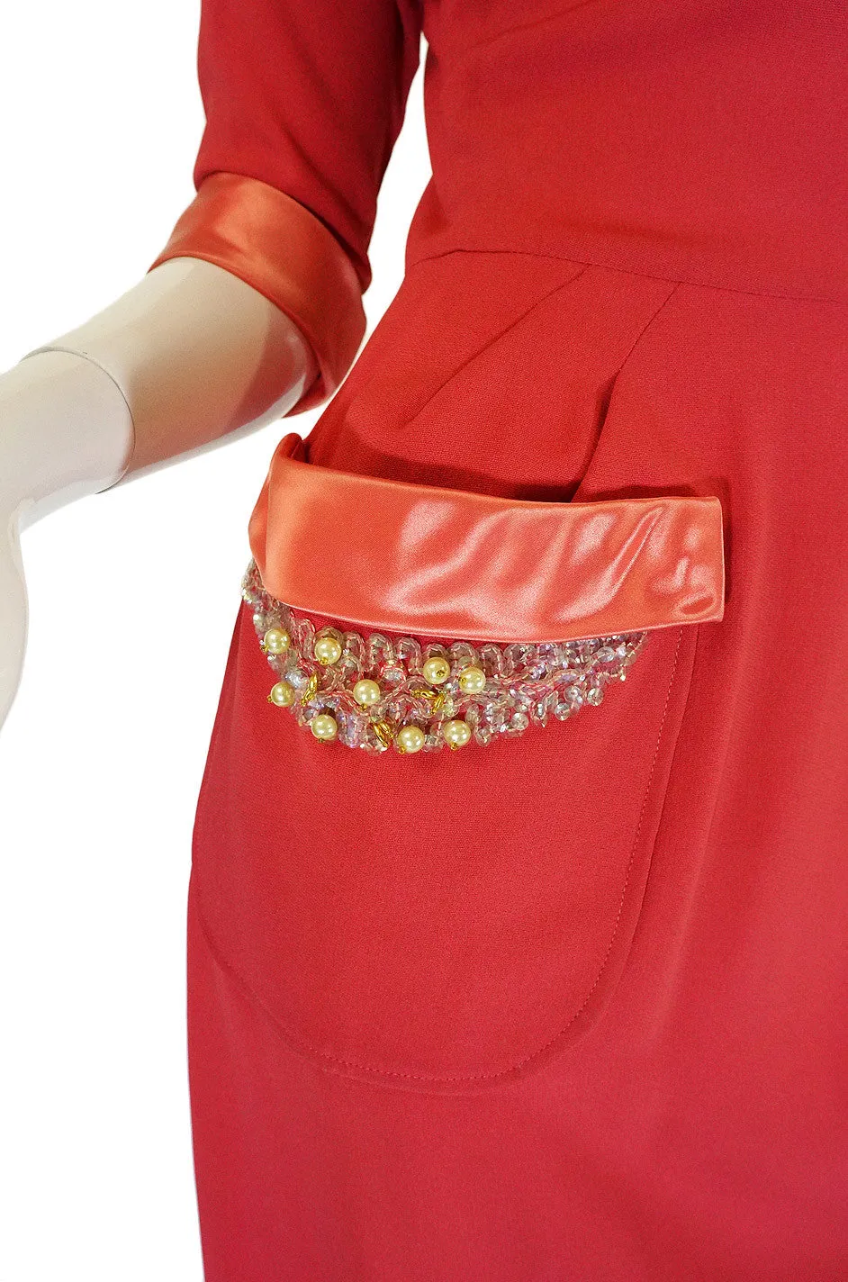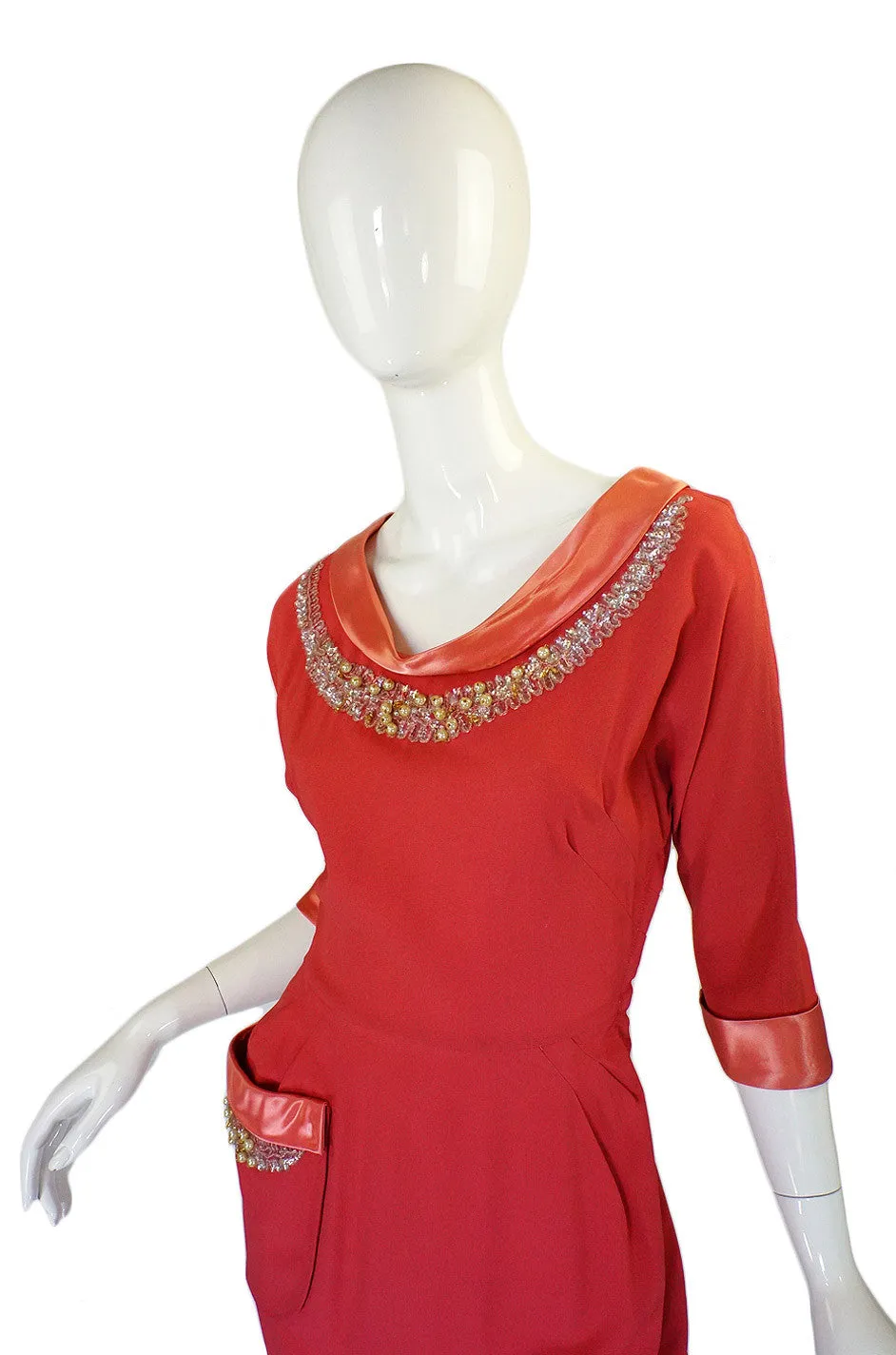 Absolutely gorgeous 1940s dress with superb detailing! Made of an unusual salmon pink hued silk crepe with crisp lines that are very flattering. The skirt is classic swing with a long lean cut and slight flare as it nears the hem. The waist nips in and a jaunty pearl and sequin encrusted pocket sits on one hip. I love the scooped neckline with its rounded silk satin collar. That same silk satin adorns each cuff and the pocket for a chic finish. The pearls and sequin detailing that sits under the collar is fantastic! Lovely lines, well made and a stunning details - all add up to a really wonderful example of how fabulous dresses were from this era! It is a beautiful, classic dress, that is wonderfully made and in excellent condition.