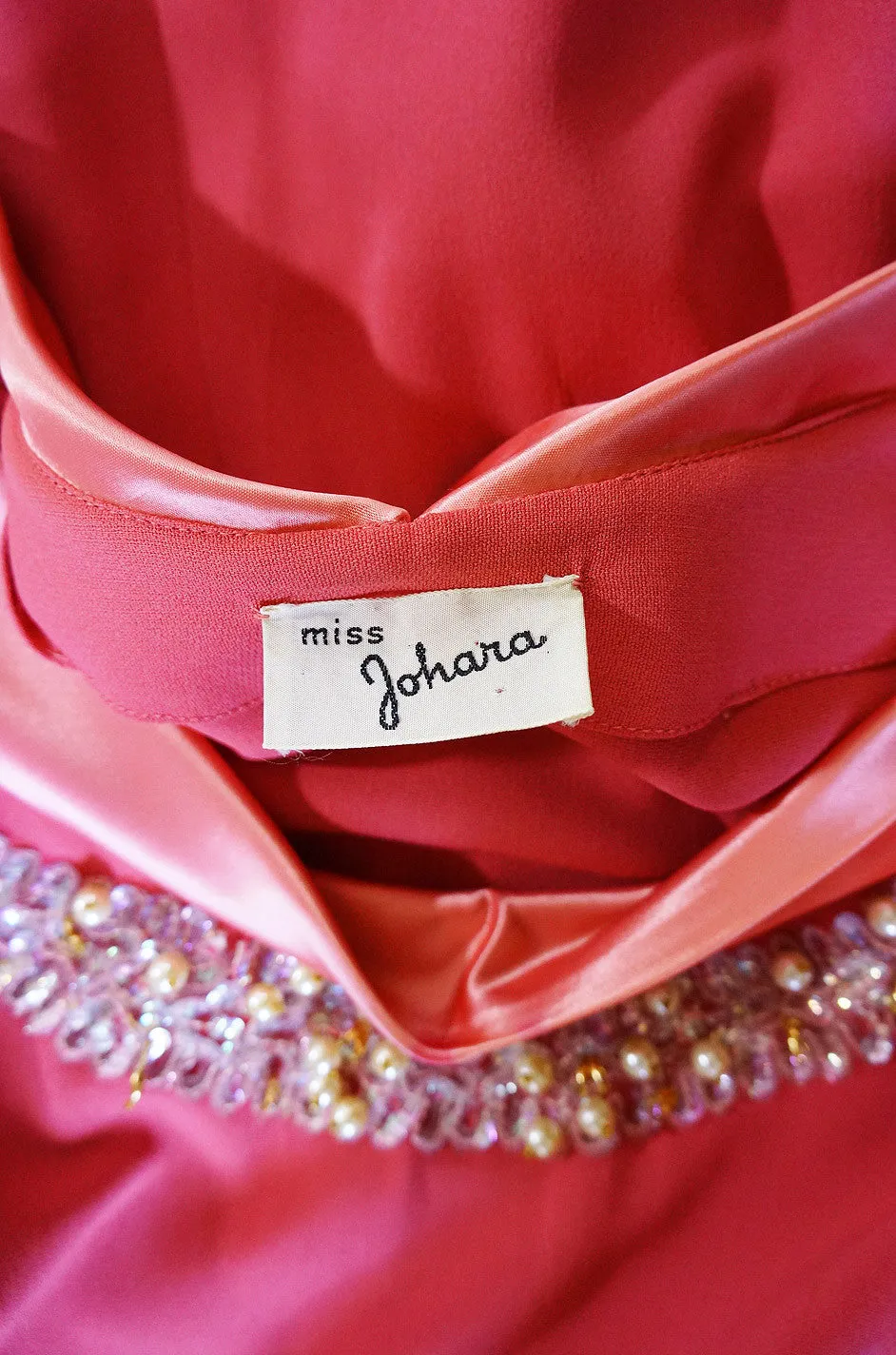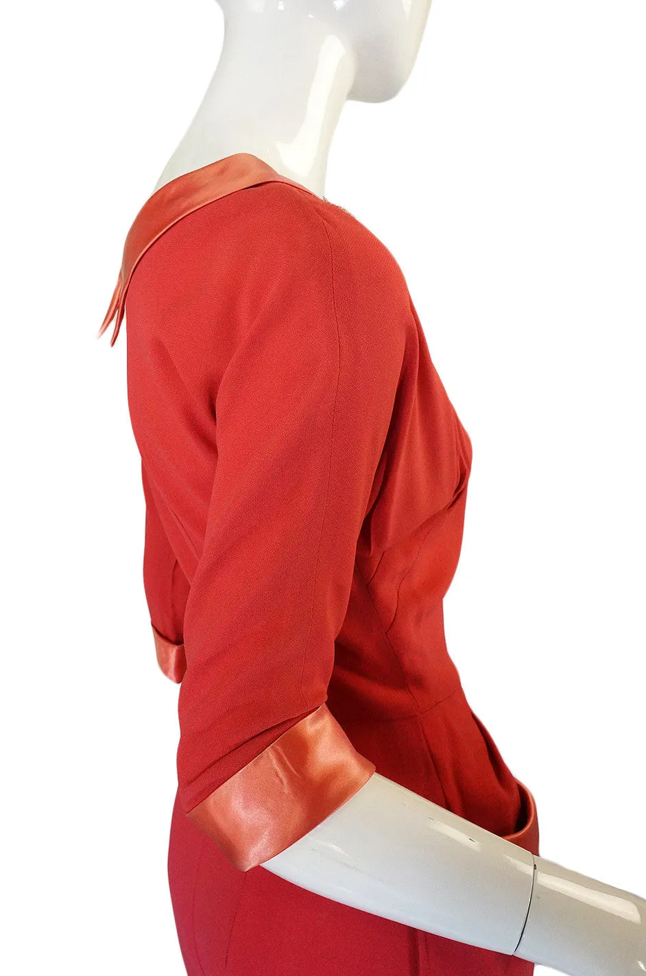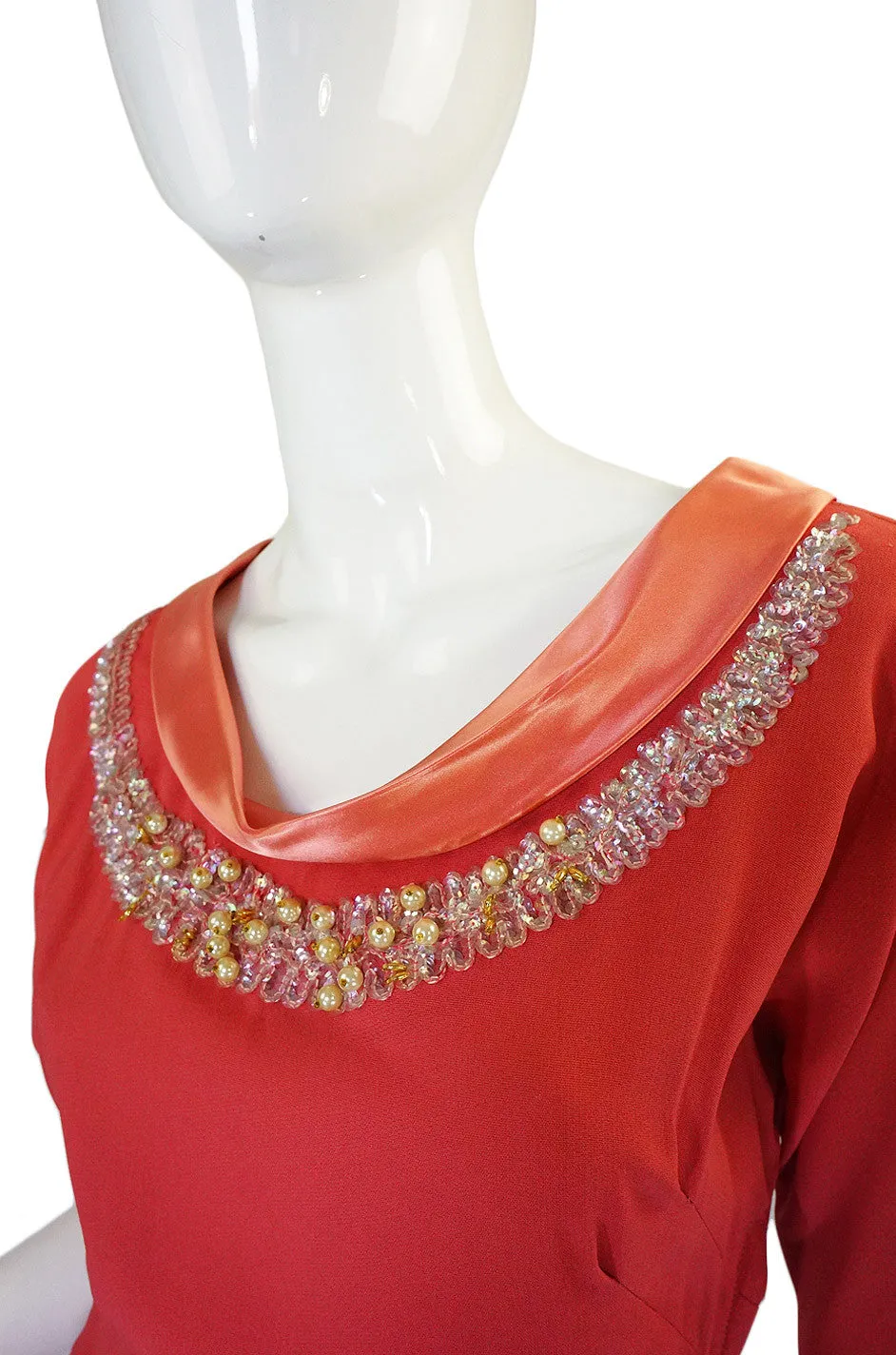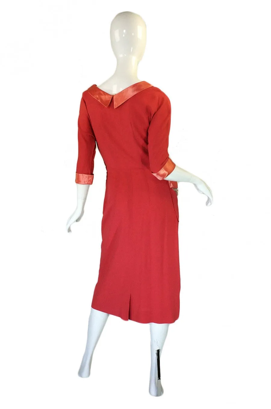 Absolutely gorgeous 1940s dress with superb detailing! Made of an unusual salmon pink hued silk crepe with crisp lines that are very flattering. The skirt is classic swing with a long lean cut and slight flare as it nears the hem. The waist nips in and a jaunty pearl and sequin encrusted pocket sits on one hip. I love the scooped neckline with its rounded silk satin collar. That same silk satin adorns each cuff and the pocket for a chic finish. The pearls and sequin detailing that sits under the collar is fantastic! Lovely lines, well made and a stunning details - all add up to a really wonderful example of how fabulous dresses were from this era! It is a beautiful, classic dress, that is wonderfully made and in excellent condition.
