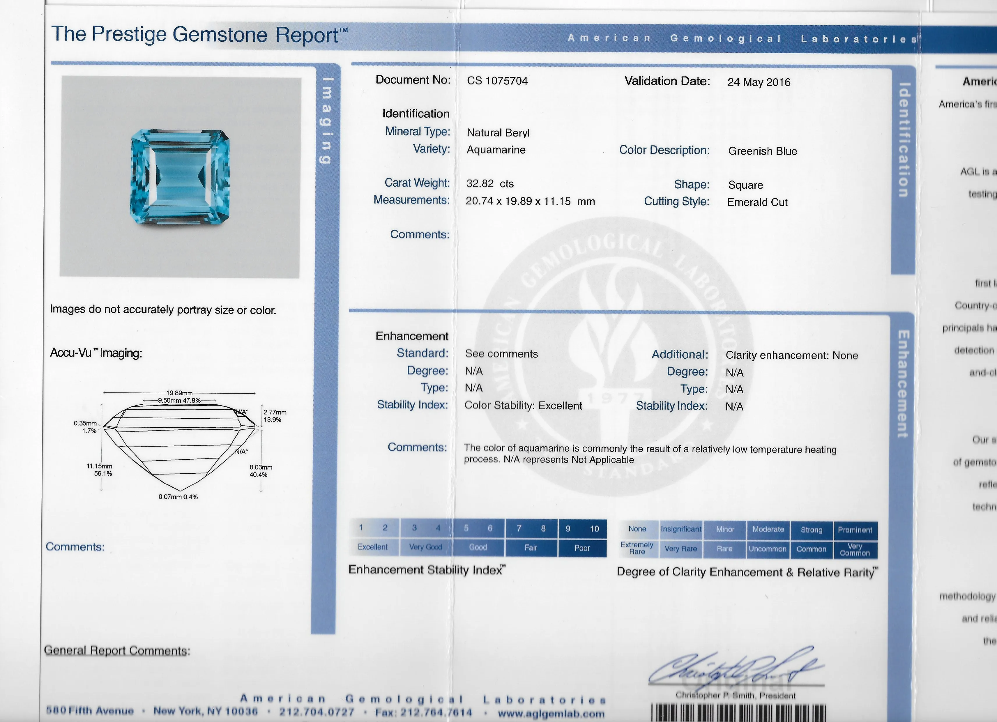 - Featuring an emerald cut aquamarine weighing approximately 32.82 carats