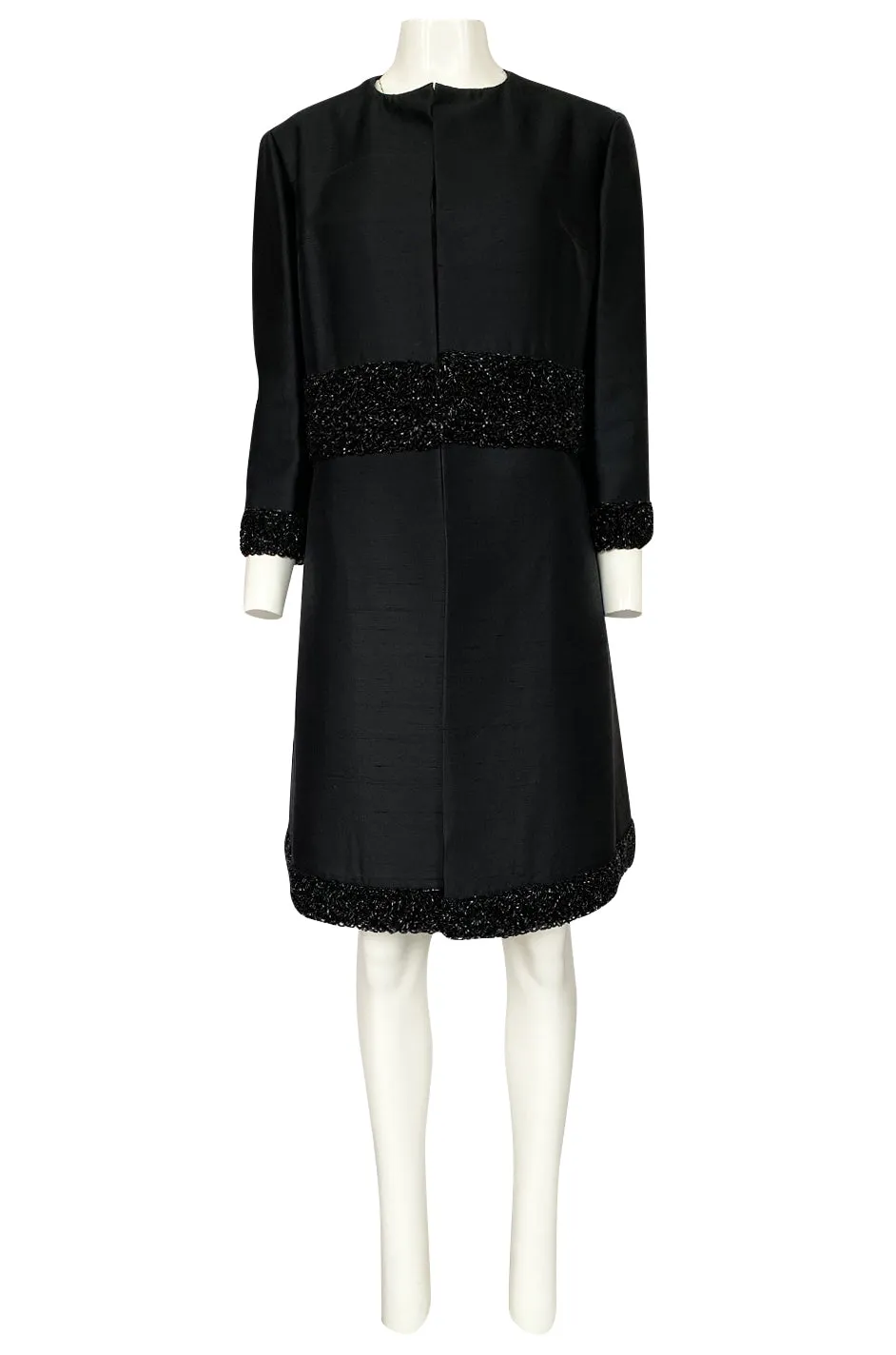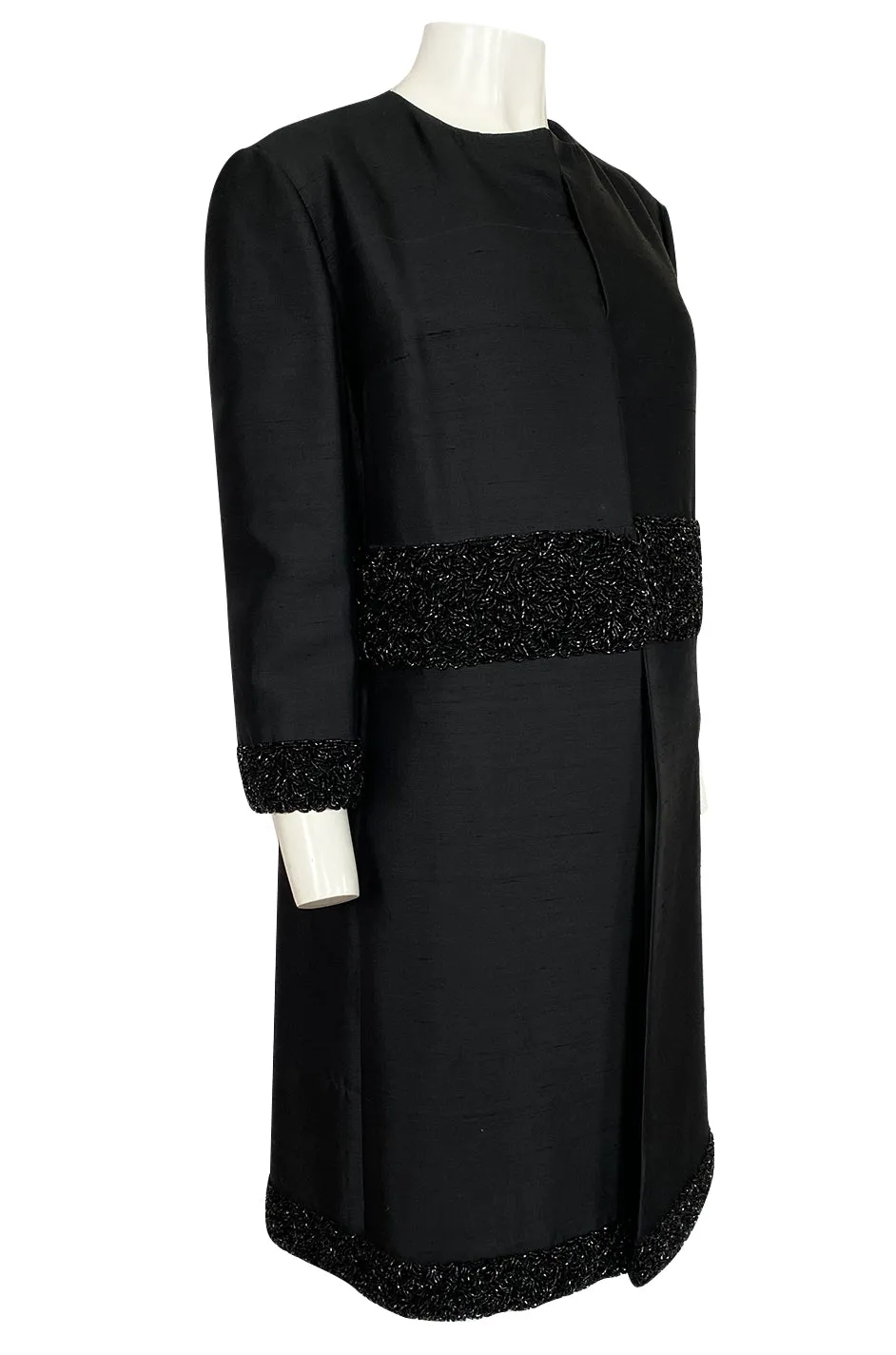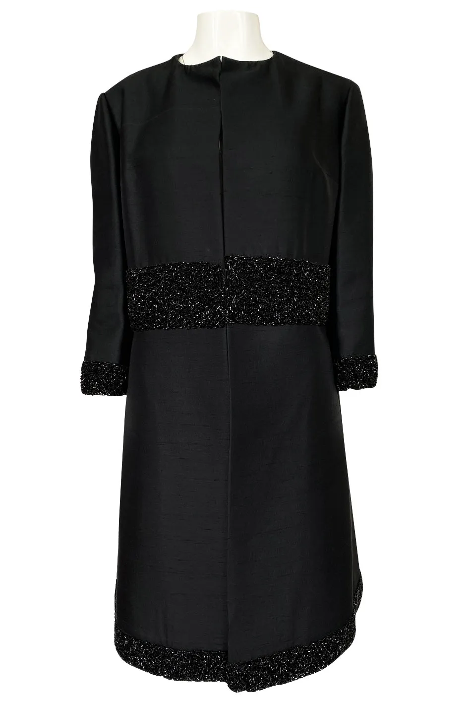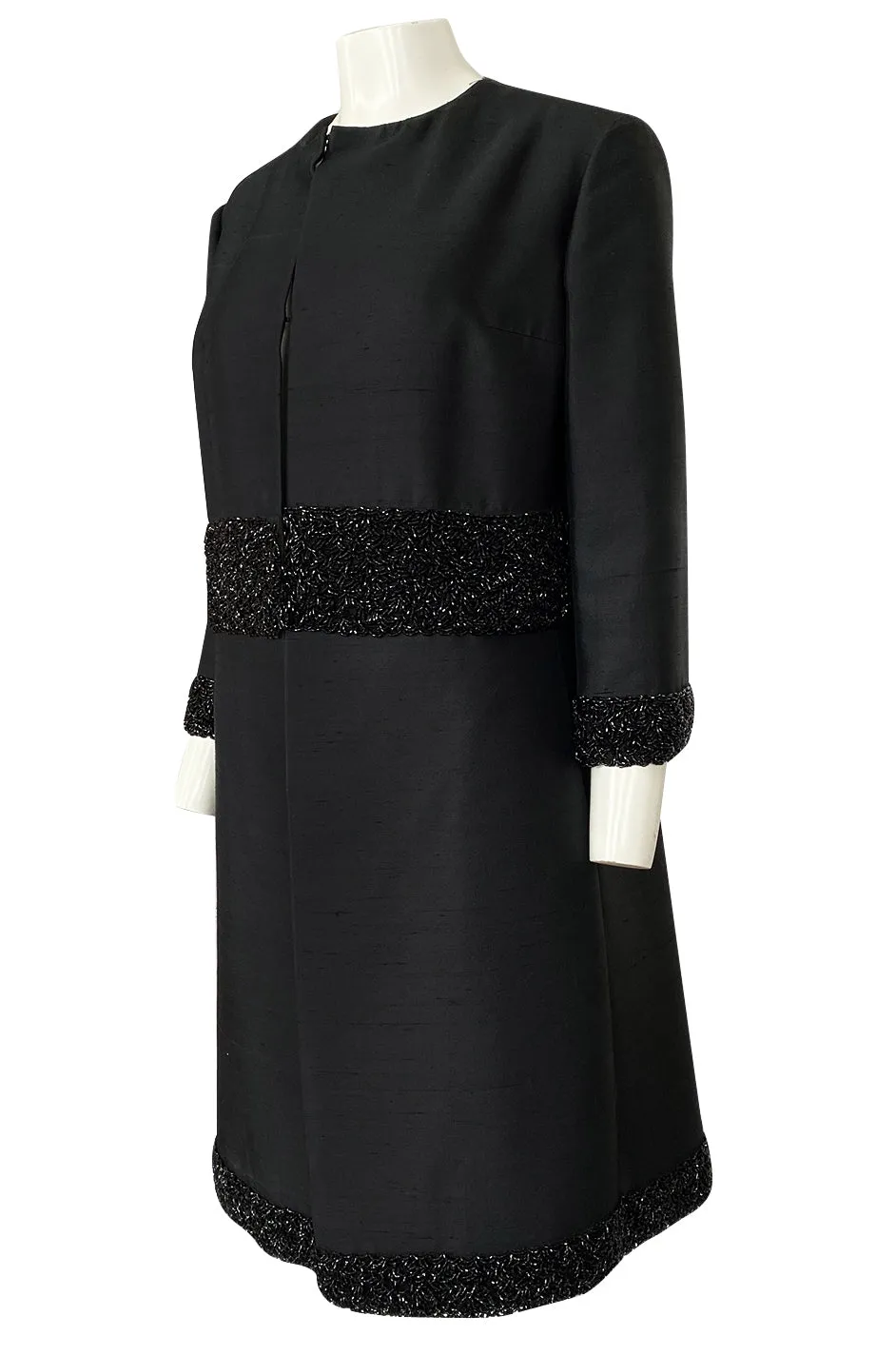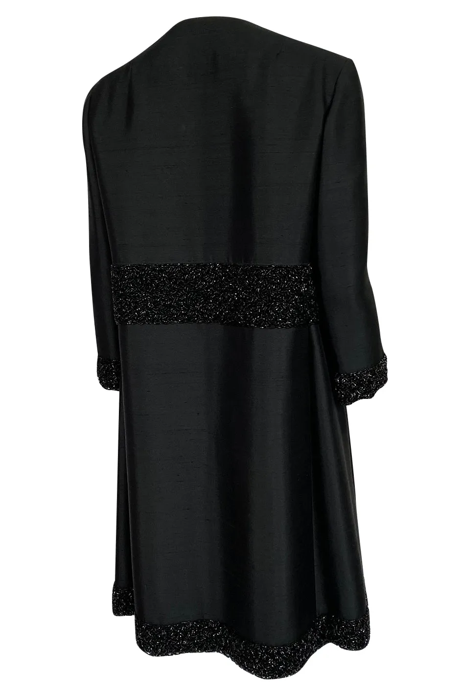 The choice of the black silk makes it very easy to wear for multiple occasions. It would have been considered a formal evening piece during its time period but now, a modern girl could wear almost anything with it. It is made from a very high end black silk that has some weight and structure to it. This allows it to keep that wonderful shape that you see. The cut of the coat is very simple and elegant. There is no collar or visible closures on the coat to break the lines of it. Instead it has a series of hidden hook & eye that run down the front and seem almost invisible whether it is closed or open. This highlights just how perfectly the beaded bands at the waist and hem line up to each other where they meet at the front. At the waist and hem there is a wise panel of bead work. Another wide band of the beads also circle each cuff of the sleeves. The beads are glossy black glass tube beads that are all set by hand. An incredible amount of work given that there are literally thousands of them. The sleeves are cut to just above the elbow and the coat is generous through the body. It is very beautiful. Excellent condition with one small note to review below
