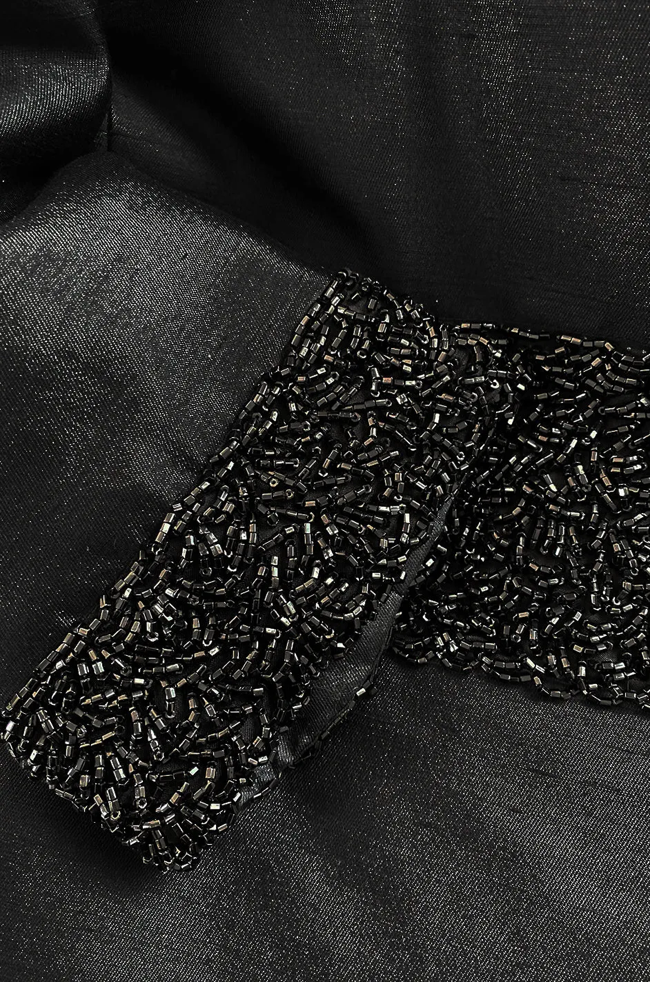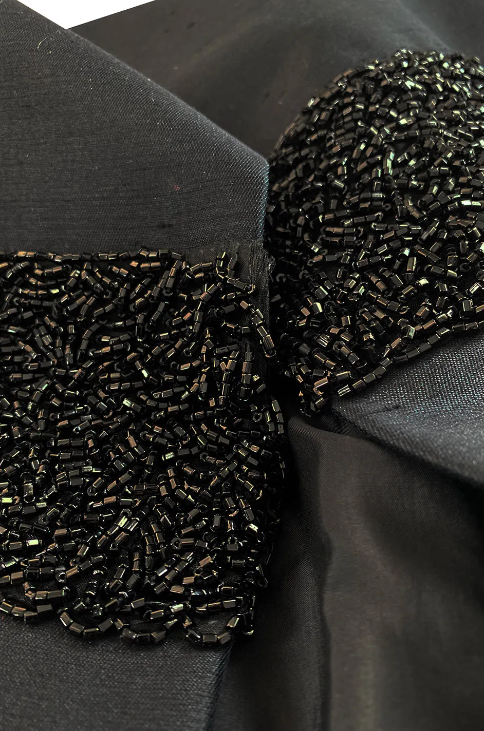 Fully lined in a fine black silk and closes with hidden hook & eye down the front. It is fairly heavy as the bead work is very thick and extensive but it sits well when on and does not actually feel heavy when worn. Hidden silk lined pockets at the front seams. Hand finished and hand beaded. Light padding in each shoulder under the lining. There is a tiny amount of bead work missing at the front waist on one side. Please see the photo after the label shot.
