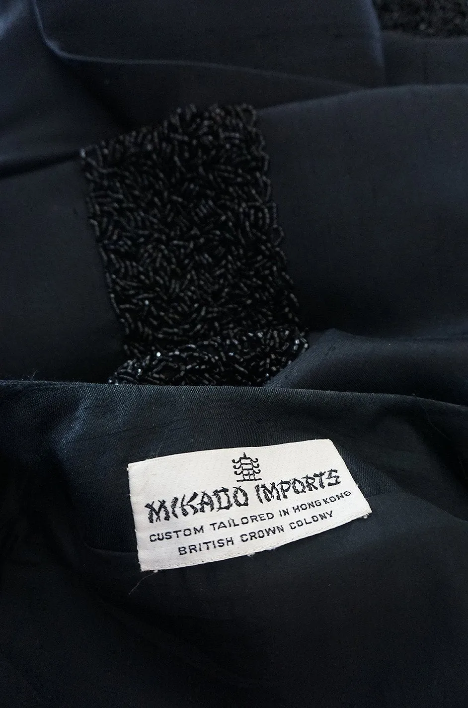 The construction on this coat is wonderful. It is hand made and the tailoring on it is really extraordinary. It's label tells us that is was a custom tailored piece that would have been specialty ordered out of the British Crown Colony of Hong Kong who were doing the best bead work & tailoring in the world during this time period.