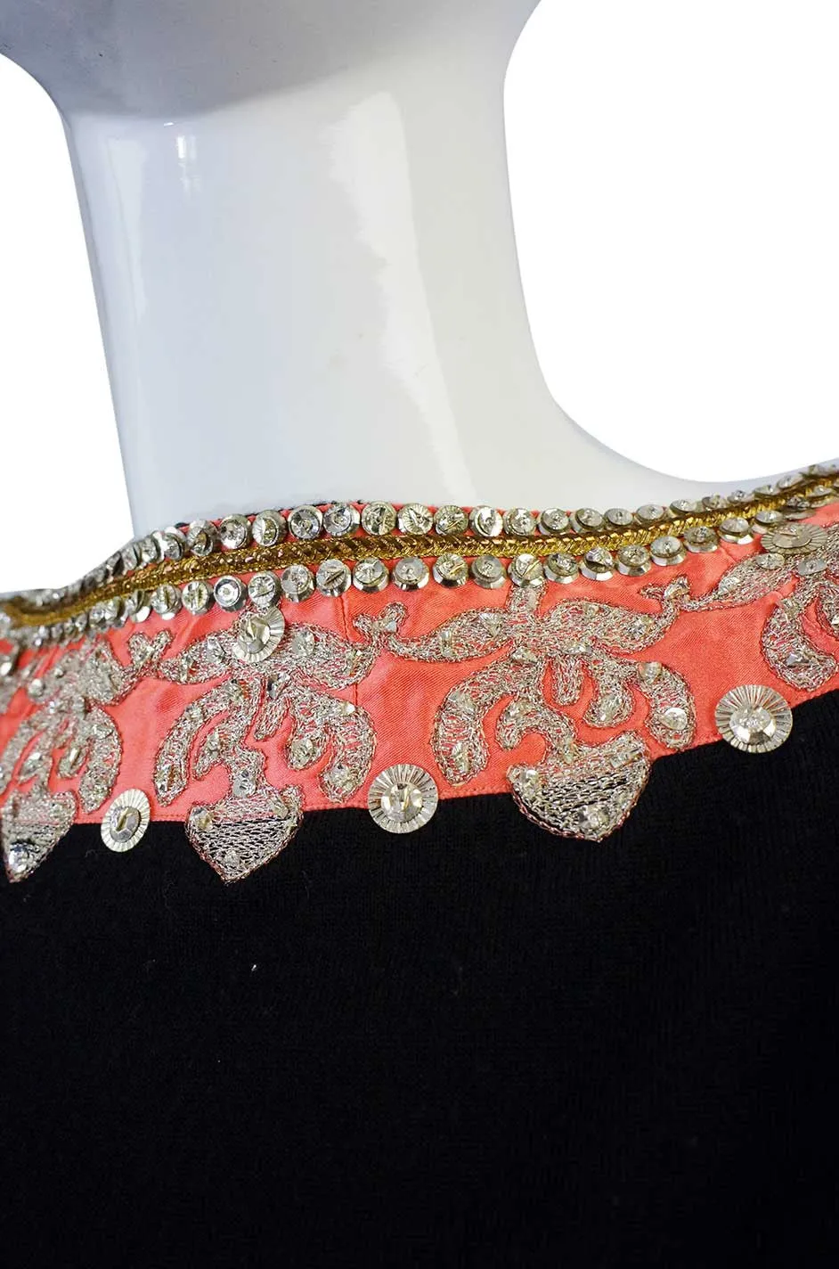 This came out of an estate and the woman had several labeled Lanvin pieces and a grouping of what was sold as unlabeled Lanvin as well (see the other listing for a similar top). It certainly has the look of it but other then the fact that I trust the source implicitly and that both tops I am listing today are very well made and have that look of Lanvin I must of course price it as amazing 1950s top in its own right. Made of a fine wool jersey, it is shaped and cut to follow the body. The detail work and elaborate collar really indicate its higher end construction. A deep salmon silk is extensively embroidered and then braids and bead work worked on top of that! I love the rich feel it gives the piece! Excellent condition.