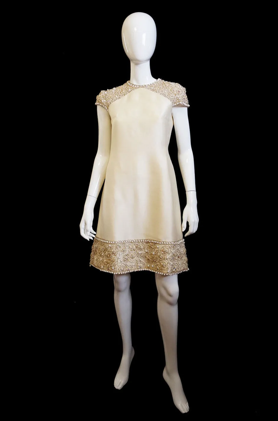 The bead work is so gorgeous on this dress! The entire shoulders and neckline is heavily beaded, sequined and the finsihed with rhinestones, all on a sheer white organdy. This same detailing is done on a 6" band on the bottom as well! Flowers are embroidered and then detailed with prong set rhinestones and white beads are used to create a band of separation between the silk and the bead work. It has photoed a tad yellowish but it a true cream silk - far brighter and creamier then the photos show. They really do not do the piece justice! It's an easy fit and if you wanted you could probably move the band up to make it shorter and more of a mini. Top notch quality and the chic, luxe sixties feel that Malcolm Starr pieces can do so well. Excellent condition.