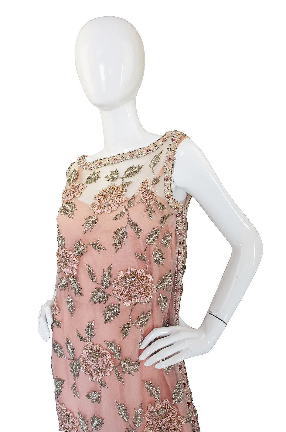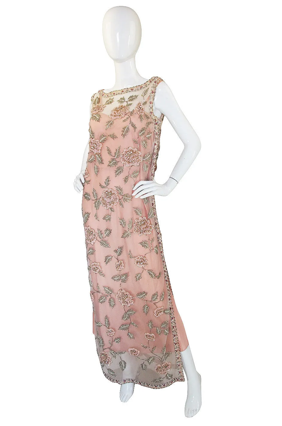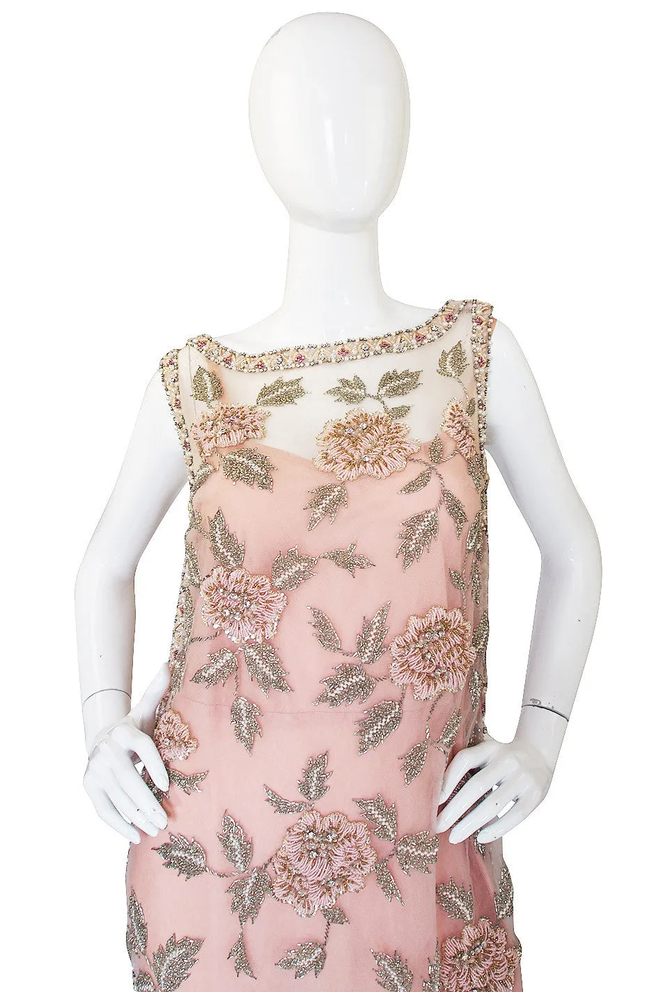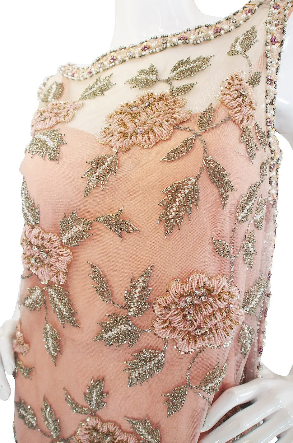 This is an exquisite 1960s net sheath whose exterior is covered with hand done bead work. Made of two layers of a fine pale pink net with flowers adoring its surface. You would rarely see this level of handwork on a piece today and if you did it would cost far more! ! Each flower is a beautiful dense portrait with tube beads, faux pearls, sequins and rhinestones forming a raised 3D effect blossom. These cover the entire dress on both the front and back. Along each side on both the front and back and around the collar is a thick banding of pearls, rhinestones and beads. There is a high slit on either side of the leg and it otherwise falls in a perfect column. This was purchased in France and worn one time and stored flat since. It is a remarkable example of the fined hand work being done during this time period and is quite beautiful. You can change the look depending on the hue you wear under the netting. Excellent condition.