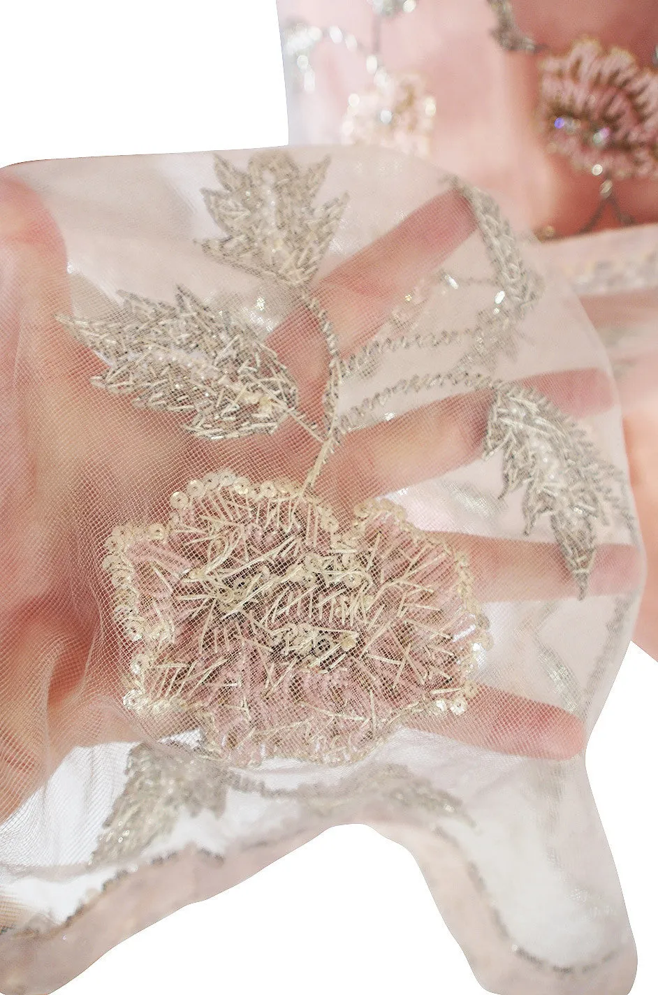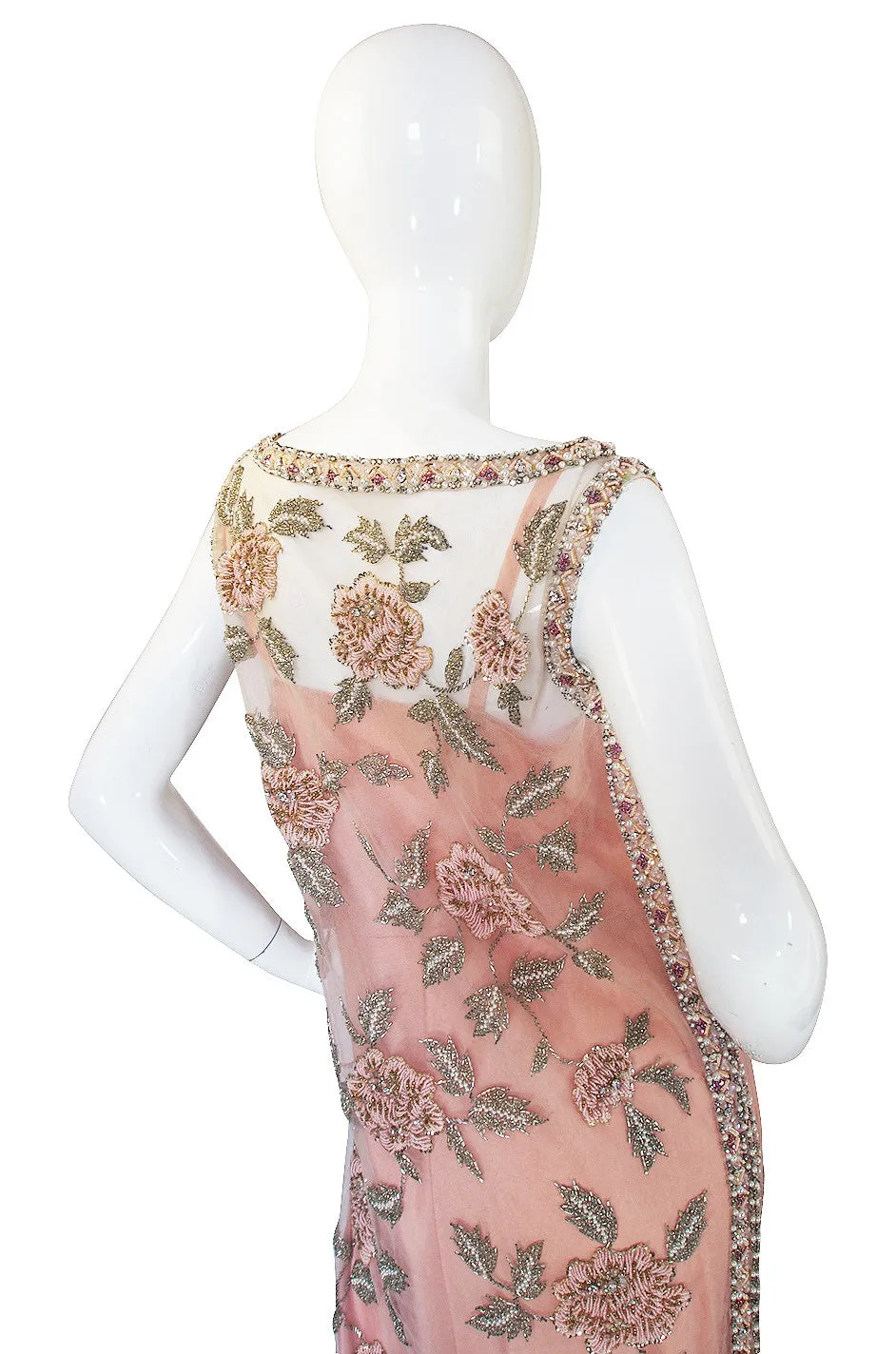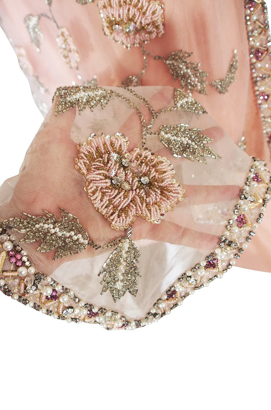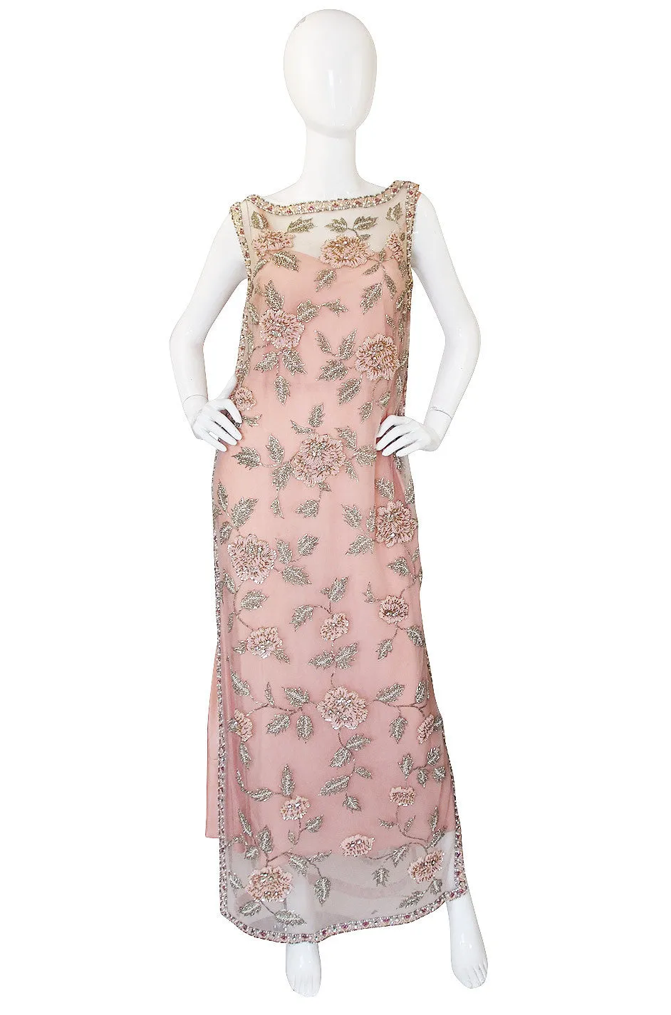 This is an exquisite 1960s net sheath whose exterior is covered with hand done bead work. Made of two layers of a fine pale pink net with flowers adoring its surface. You would rarely see this level of handwork on a piece today and if you did it would cost far more! ! Each flower is a beautiful dense portrait with tube beads, faux pearls, sequins and rhinestones forming a raised 3D effect blossom. These cover the entire dress on both the front and back. Along each side on both the front and back and around the collar is a thick banding of pearls, rhinestones and beads. There is a high slit on either side of the leg and it otherwise falls in a perfect column. This was purchased in France and worn one time and stored flat since. It is a remarkable example of the fined hand work being done during this time period and is quite beautiful. You can change the look depending on the hue you wear under the netting. Excellent condition.