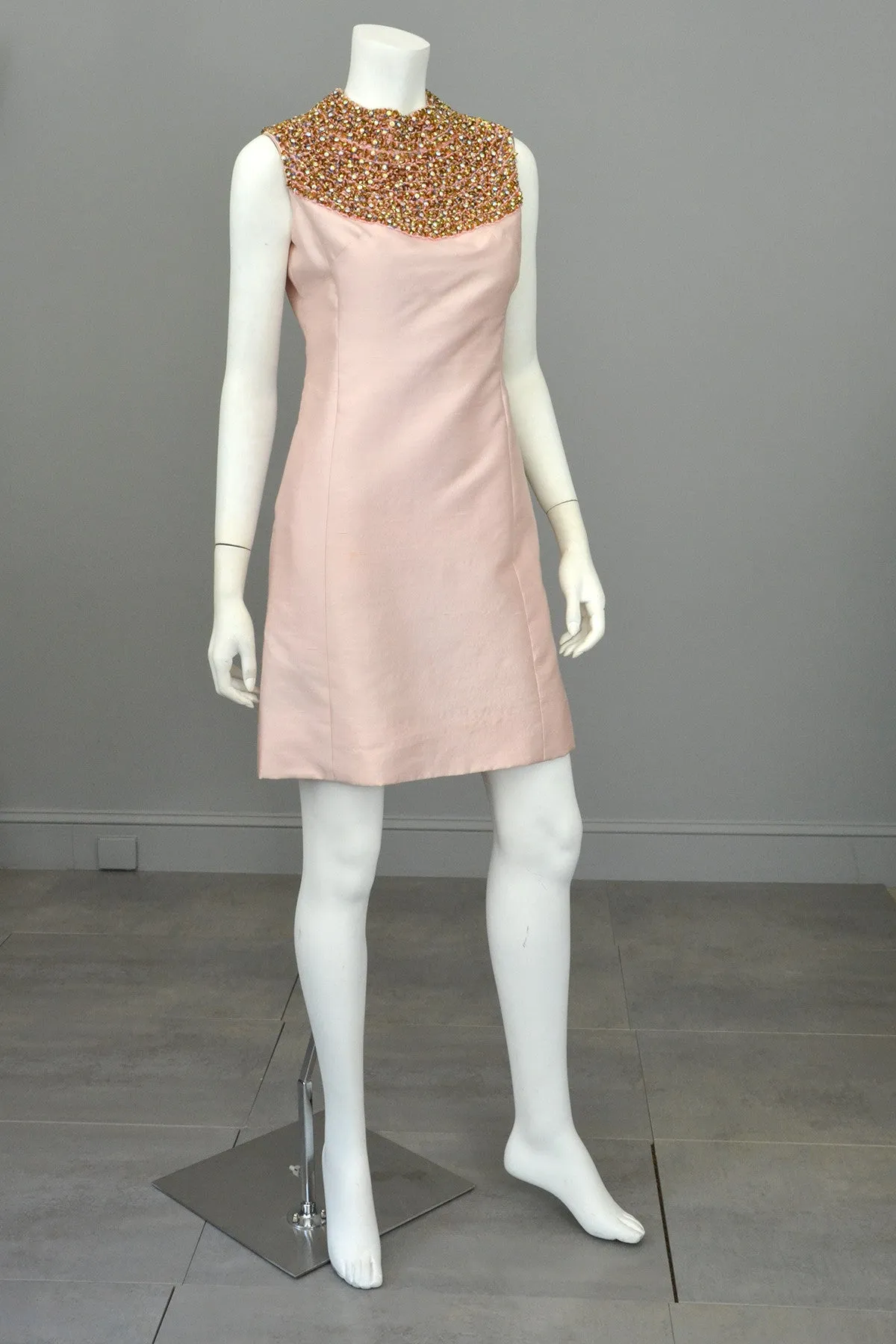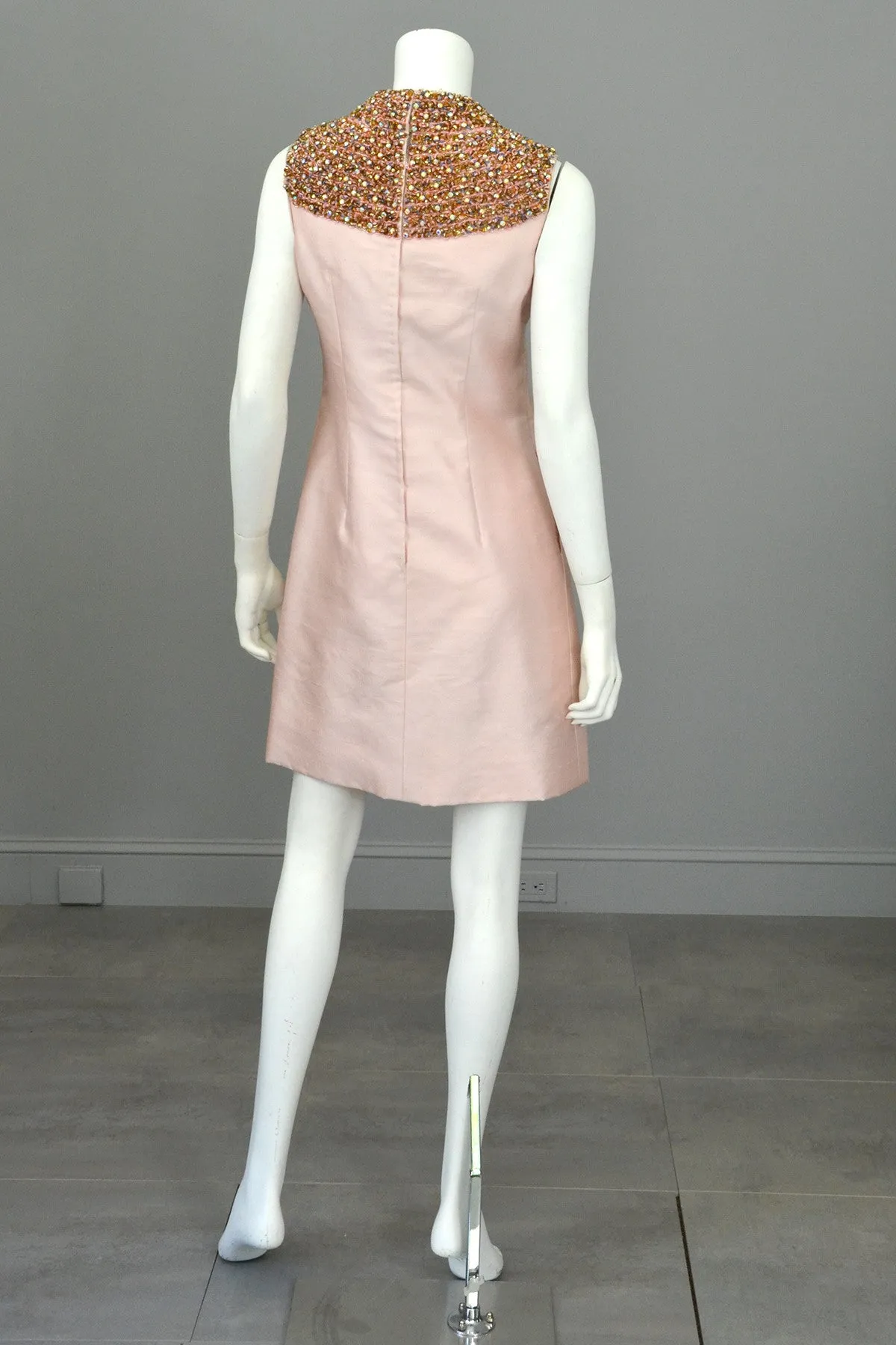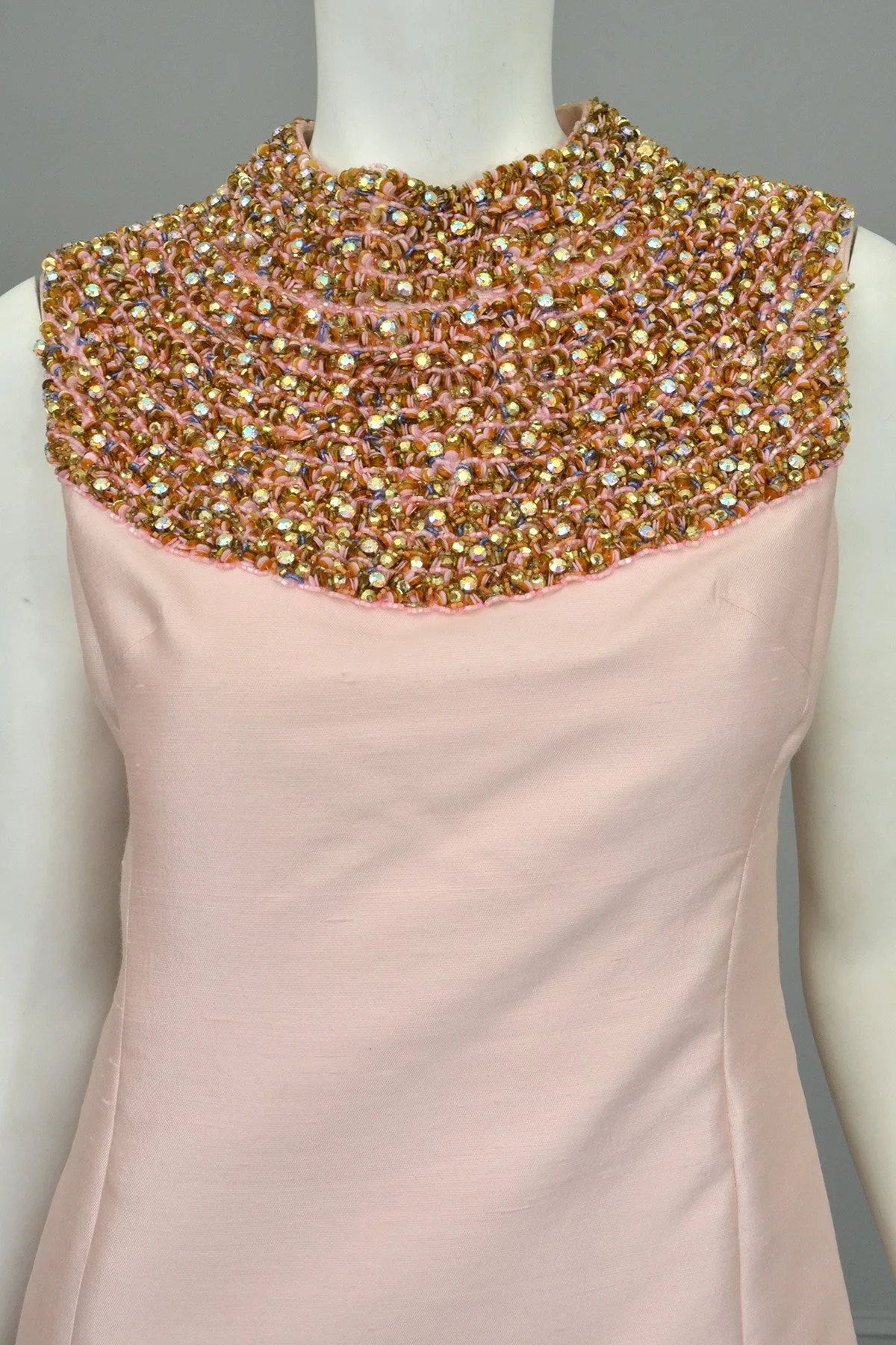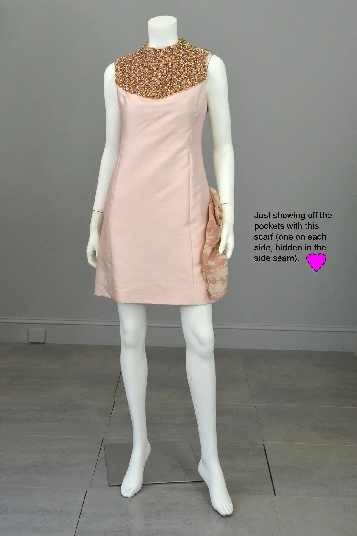 Be sure to zoom around the beadwork on this amazing vintage 60s Egyptian Revival Mini Dress. Lovely pale pink color featuring a bold gold tone Beaded Egyptian Collar Neckline, short A-line Silhouette with elongated seams to flatter the shape. Notice the hidden pockets. Fabulous on!