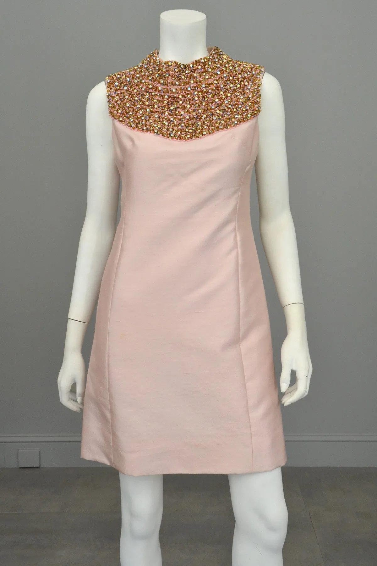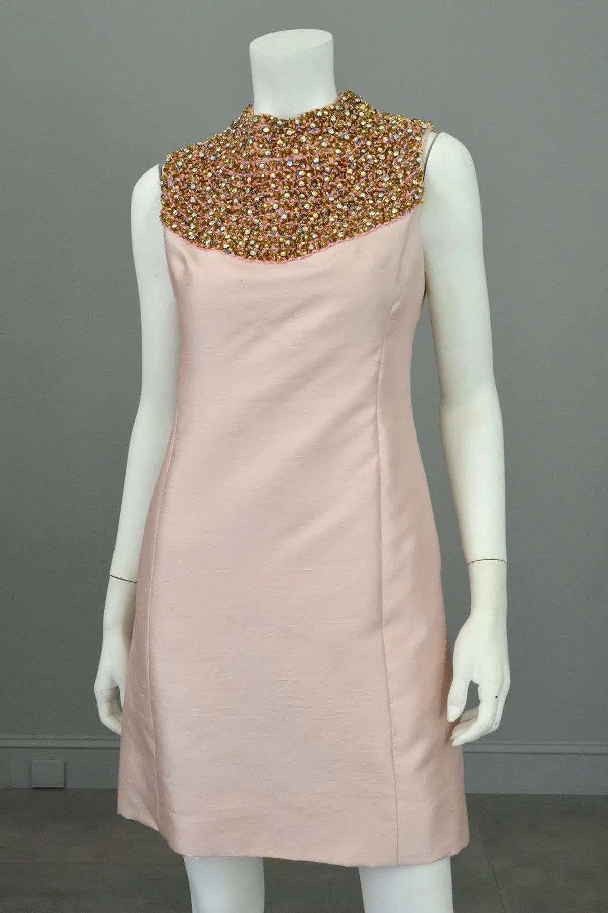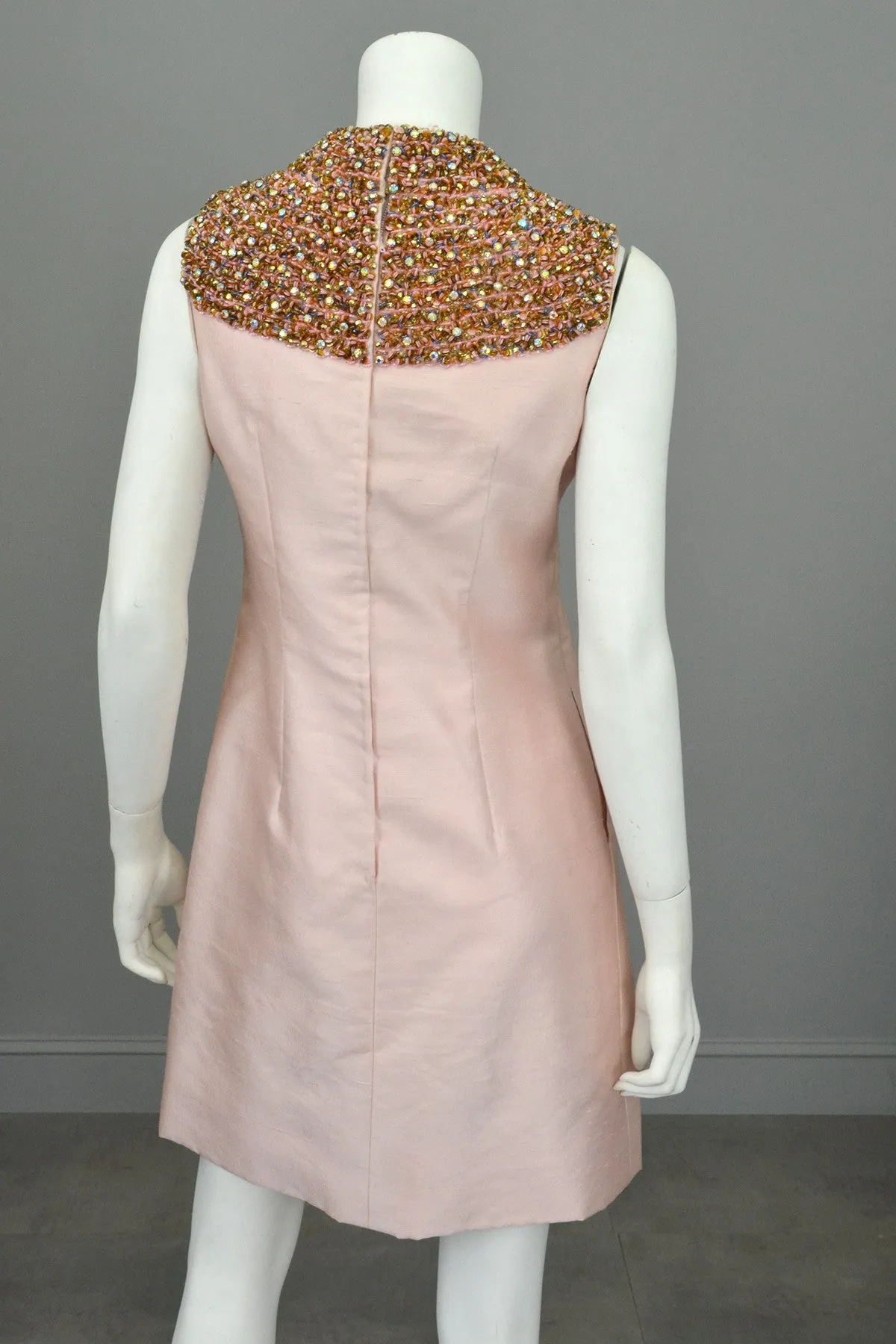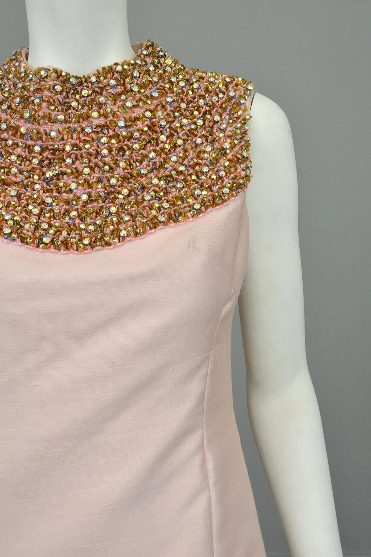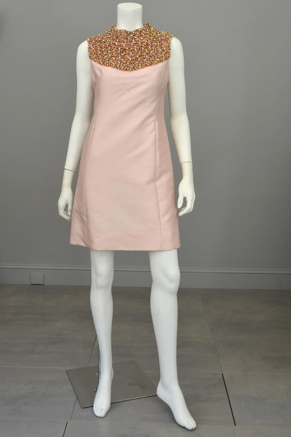 Be sure to zoom around the beadwork on this amazing vintage 60s Egyptian Revival Mini Dress. Lovely pale pink color featuring a bold gold tone Beaded Egyptian Collar Neckline, short A-line Silhouette with elongated seams to flatter the shape. Notice the hidden pockets. Fabulous on!