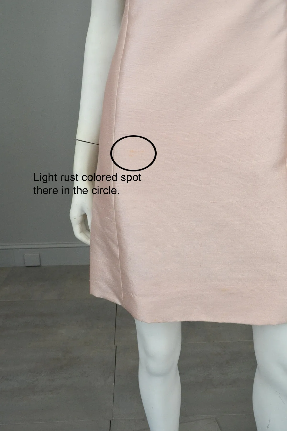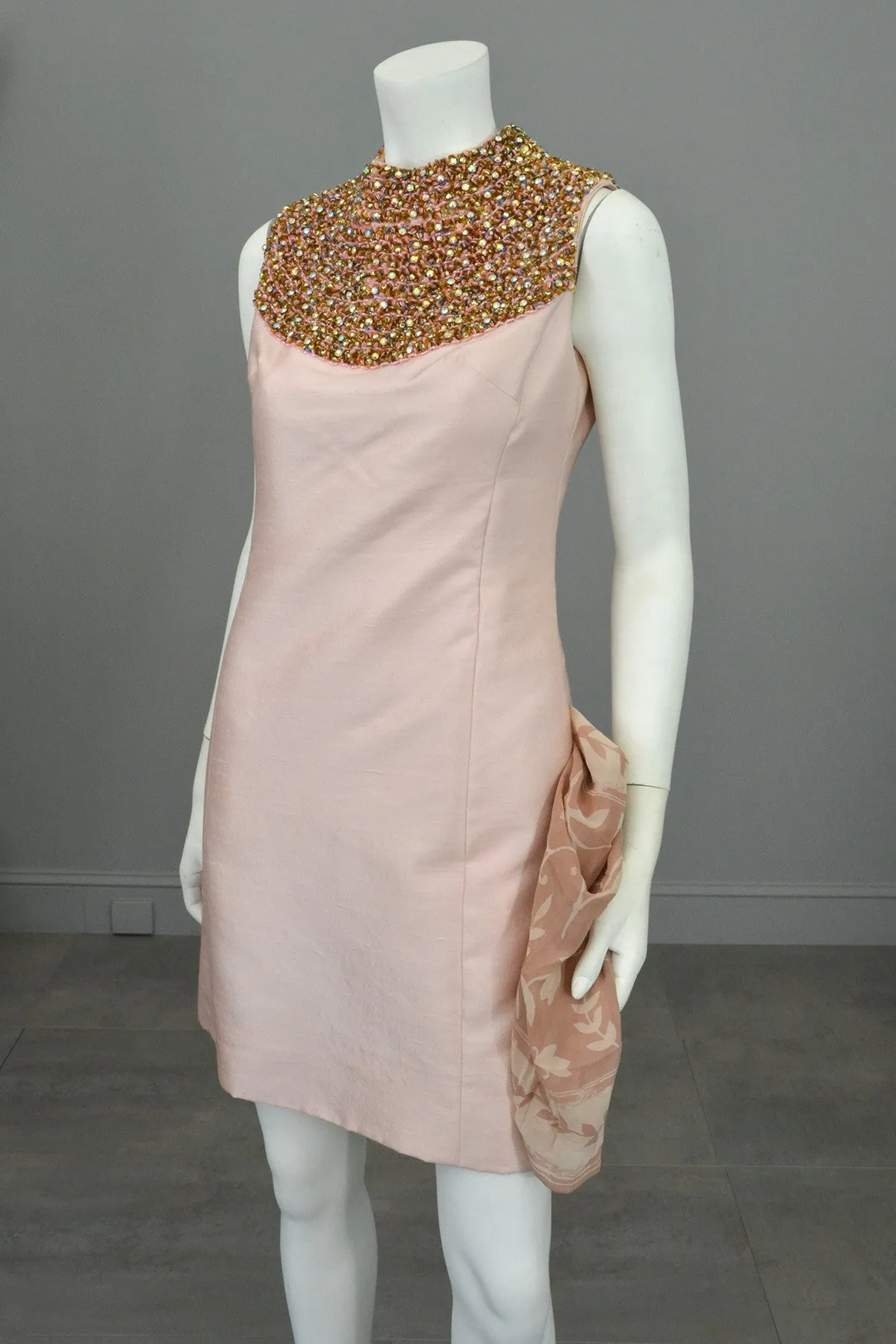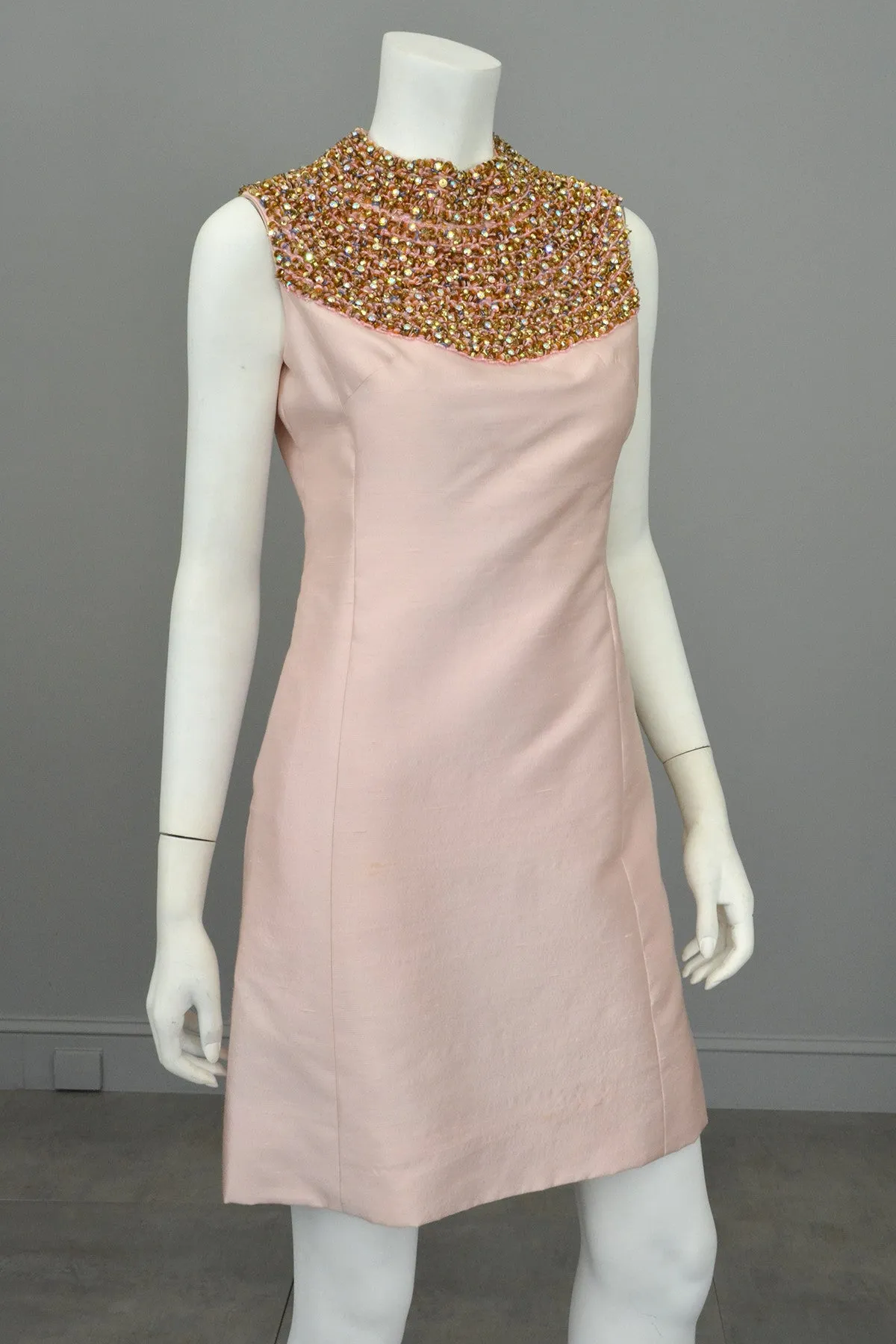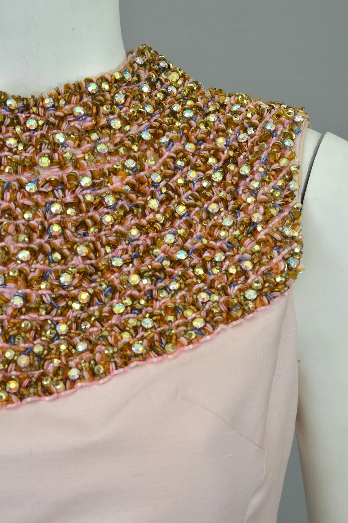 Be sure to zoom around the beadwork on this amazing vintage 60s Egyptian Revival Mini Dress. Lovely pale pink color featuring a bold gold tone Beaded Egyptian Collar Neckline, short A-line Silhouette with elongated seams to flatter the shape. Notice the hidden pockets. Fabulous on!