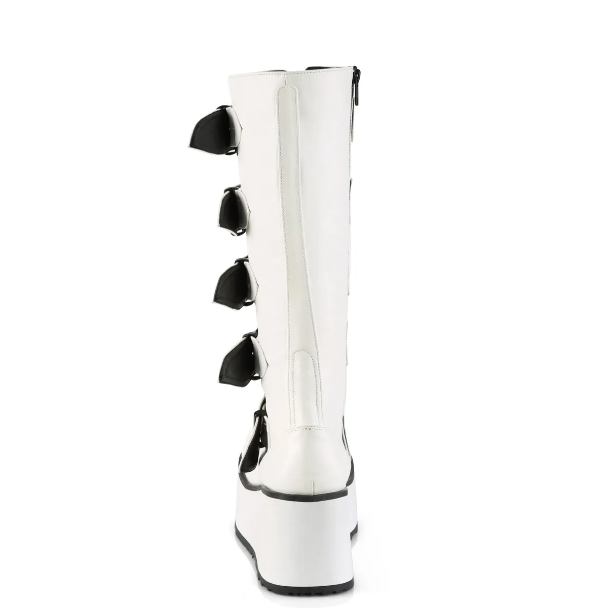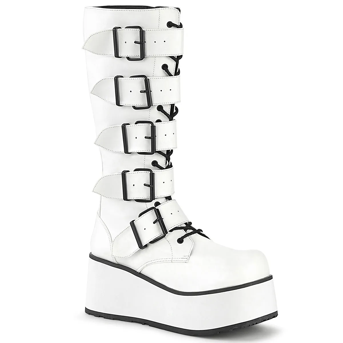 Demonia TRASHVILLE-518 White Vegan Leather 3 1/4"" (83mm) Platform Lace-Up Knee High w/ Buckle Straps, Full Inner Metal Zipper
