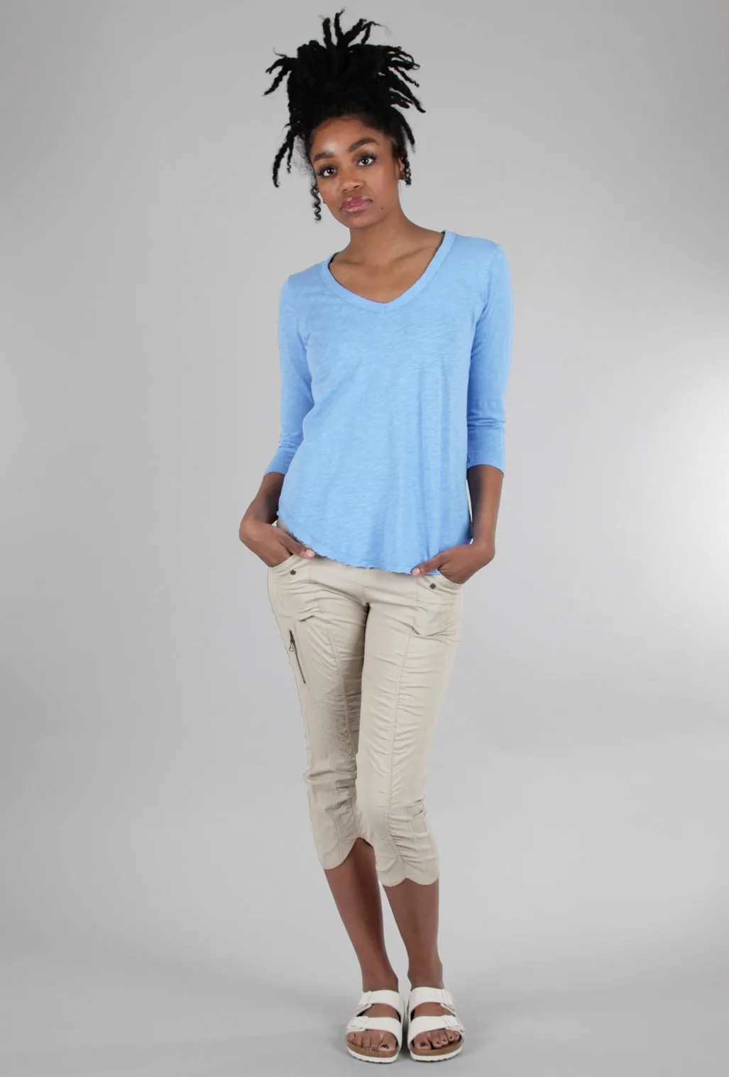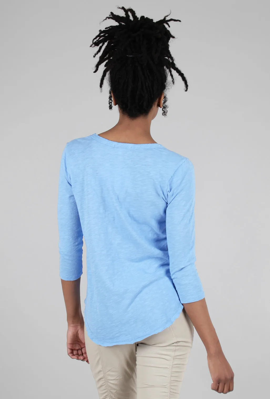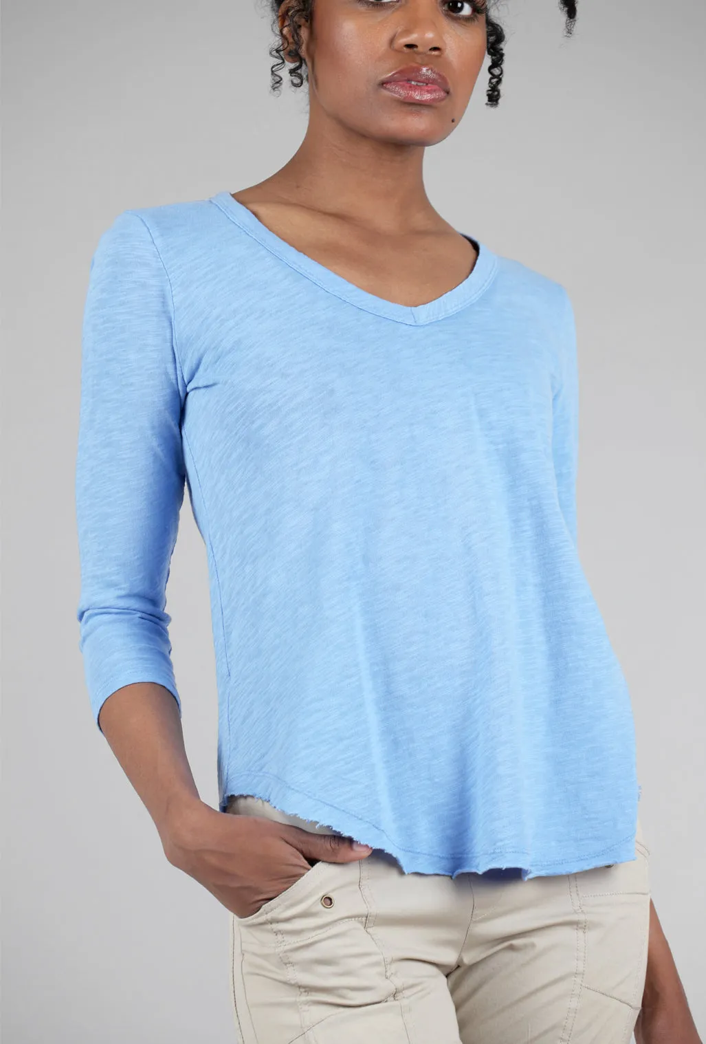 This three-quarter-sleeved T-shirt is done in a soft cotton slub knit; it has a V neckline and a rounded, shirttail hemline. The fit is relaxed, but still tailored in its silhouette. A good choice for those who love Wilt T-shirts but not the Wilt price tags!