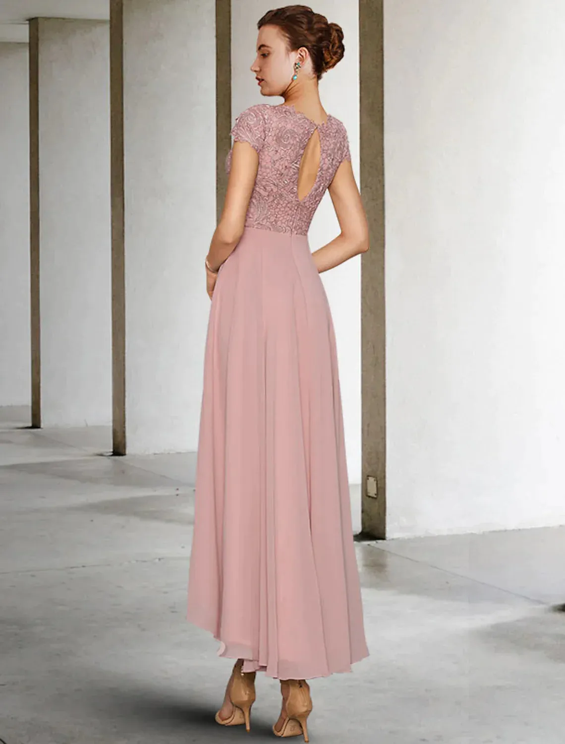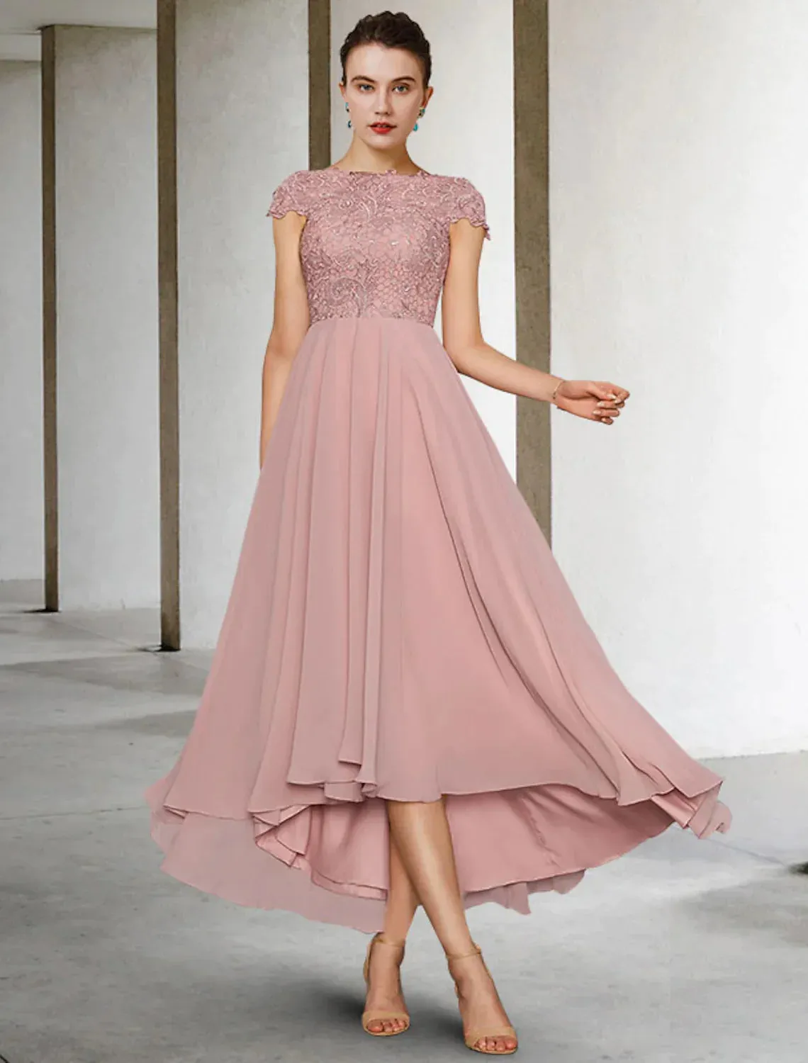 A-Line Mother of the Bride Dress Elegant Asymmetrical Chiffon Lace Sleeve Ruching