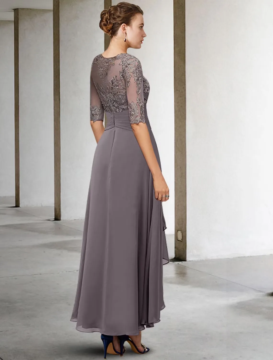 A-Line Mother of the Bride Dress Plus Size Elegant High Low V Neck Asymmetrical Ankle Length Chiffon Lace Half Sleeve with Beading Appliques