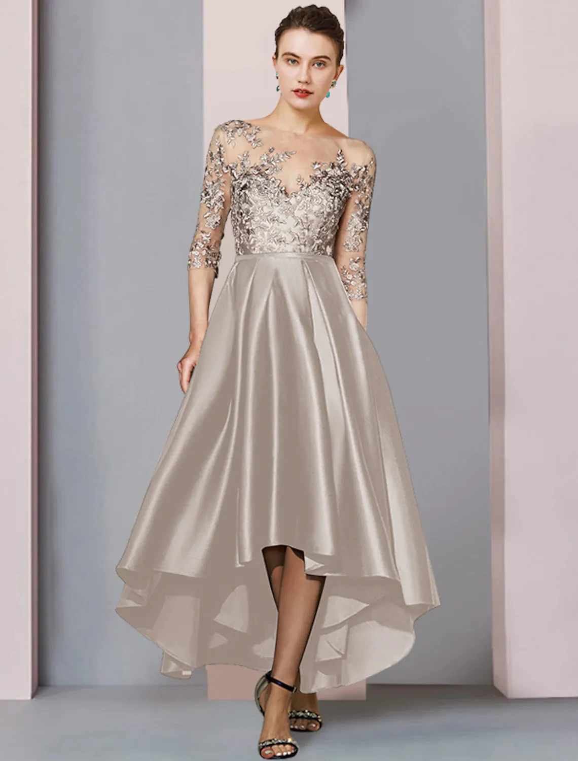 A-Line Mother of the Bride Dress Wedding Guest Elegant High Low Scoop Neck Asymmetrical Tea Length Satin Lace Half Sleeve with Pleats Appliques