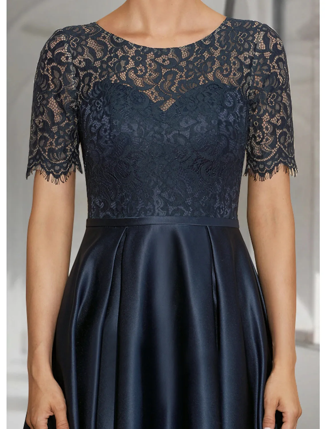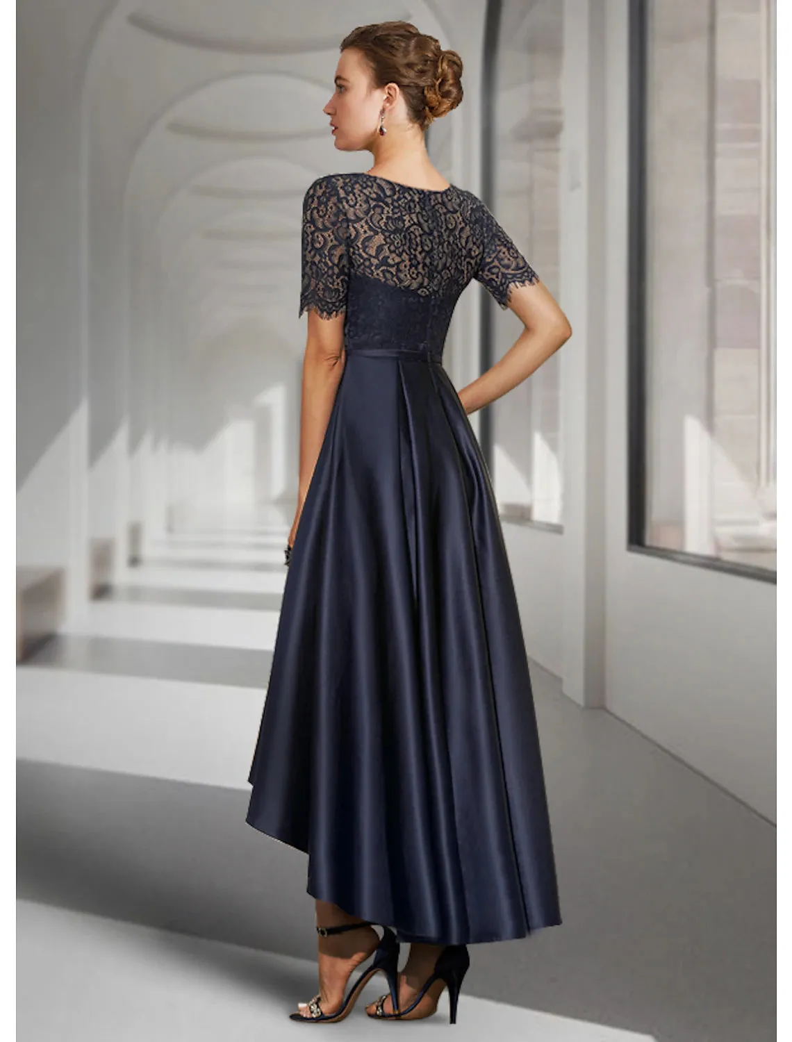 A-Line Mother of the Bride Dress Wedding Guest Elegant High Low Scoop Neck Asymmetrical Tea Length Satin Lace Short Sleeve with Pleats