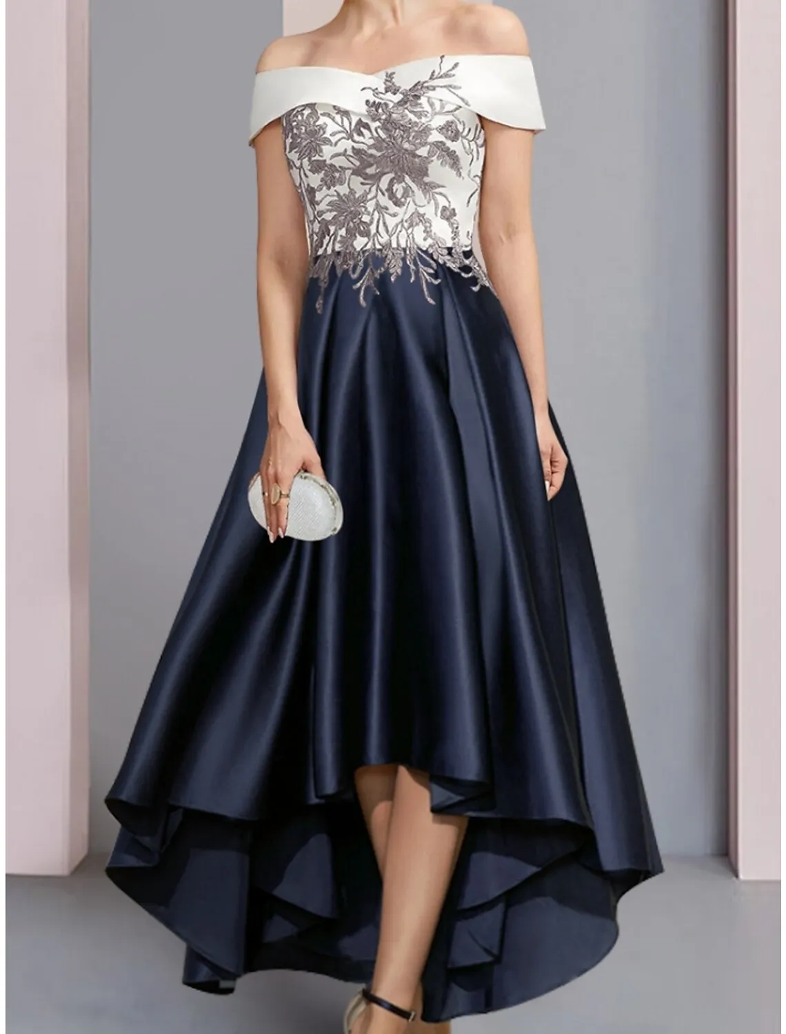 A-Line Mother of the Bride Dress Wedding Guest Elegant Off Shoulder Asymmetrical Ankle Length Satin Lace Short Sleeve with Ruching