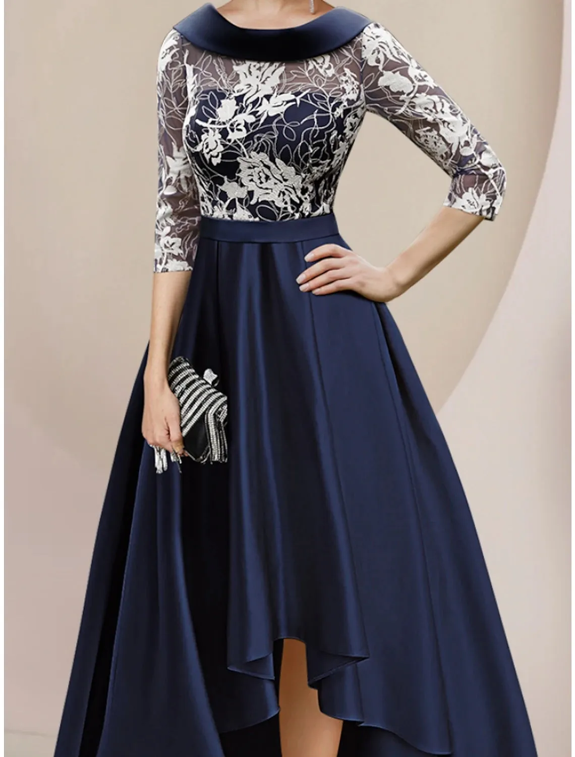 A-Line Mother of the Bride Dress Wedding Guest Elegant Scoop Neck Asymmetrical Ankle Length Satin Lace Half Sleeve with Ruching
