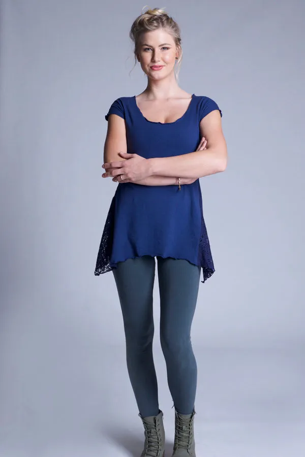 Ultra feminine tunic with asymmetrical hem that is longer on the sides. Has airy lace accents on the sides for a breezy summery feel. Fitted in the chest and loose in stomach and hips.