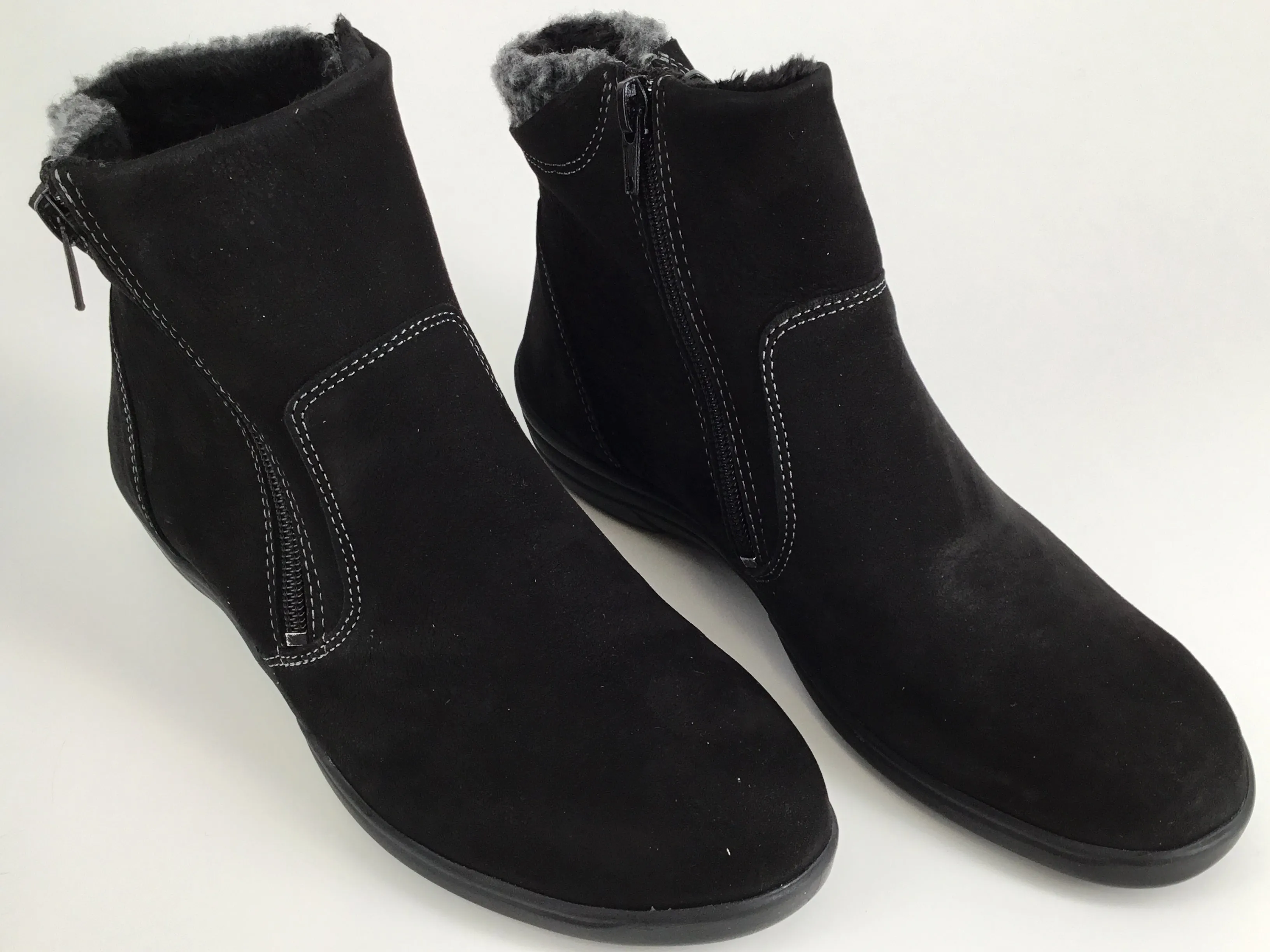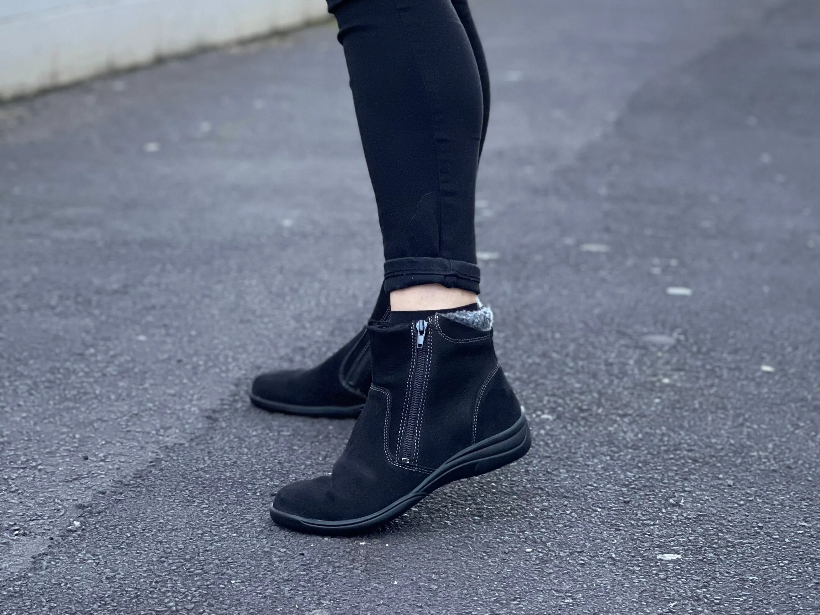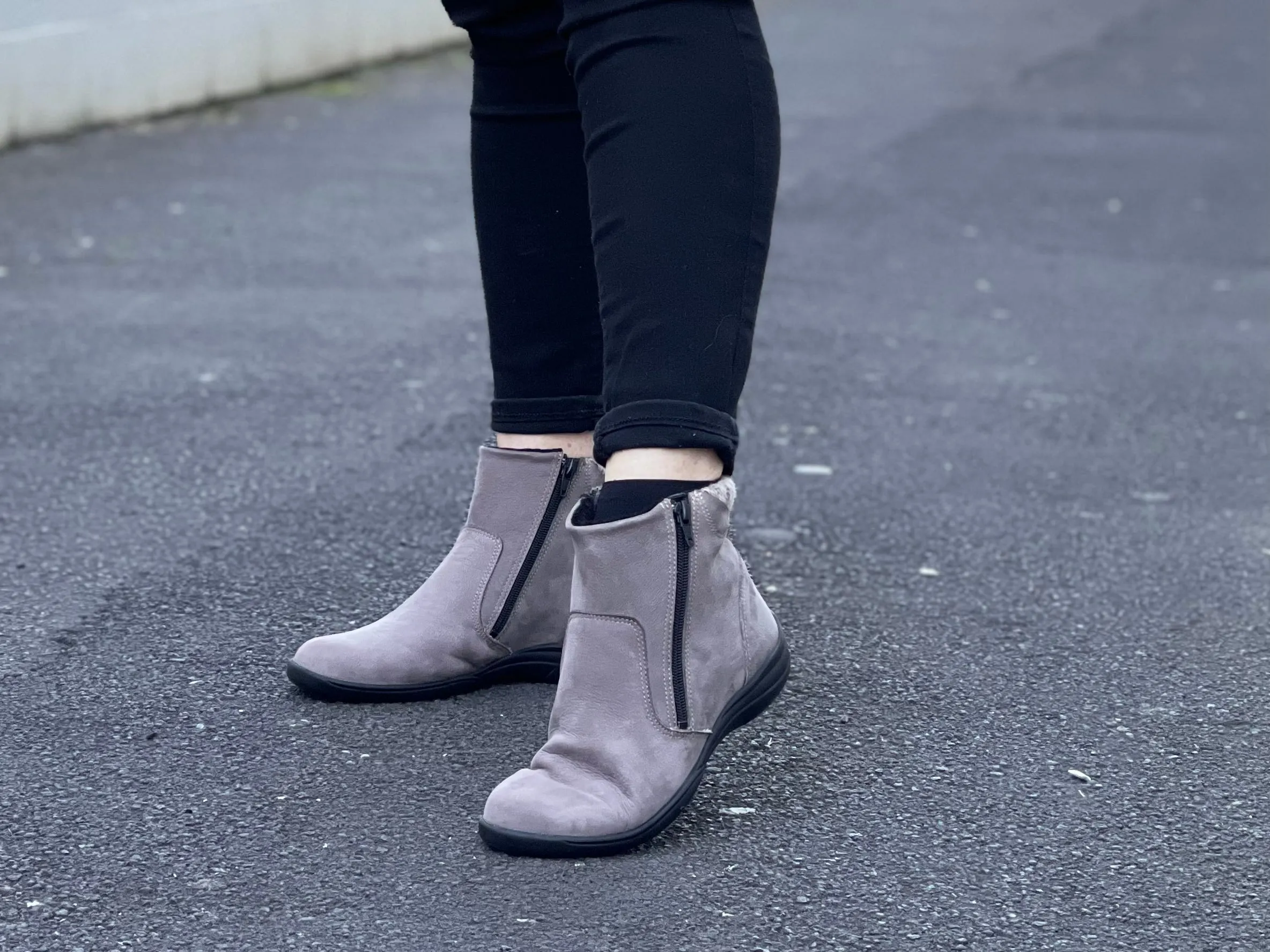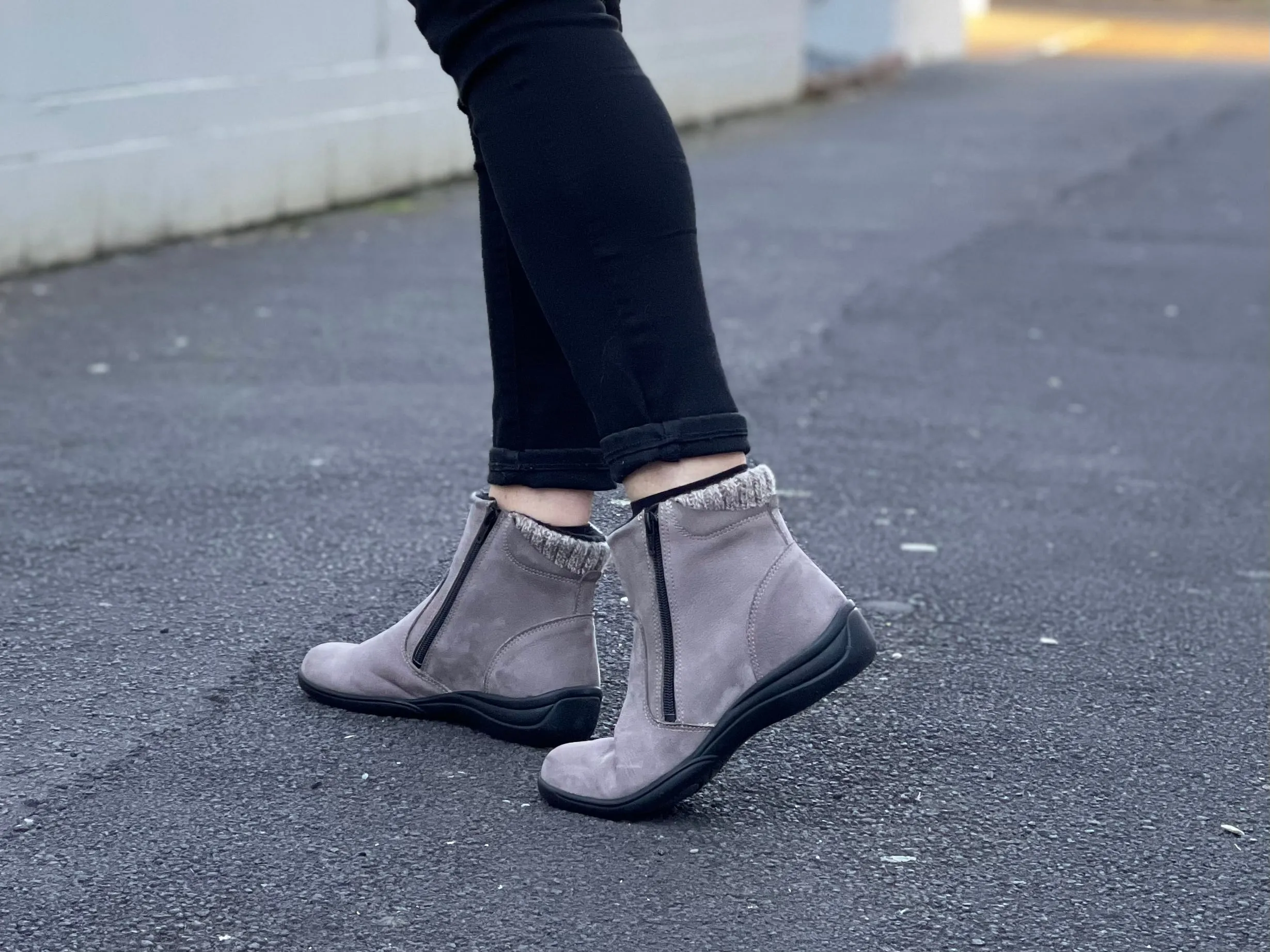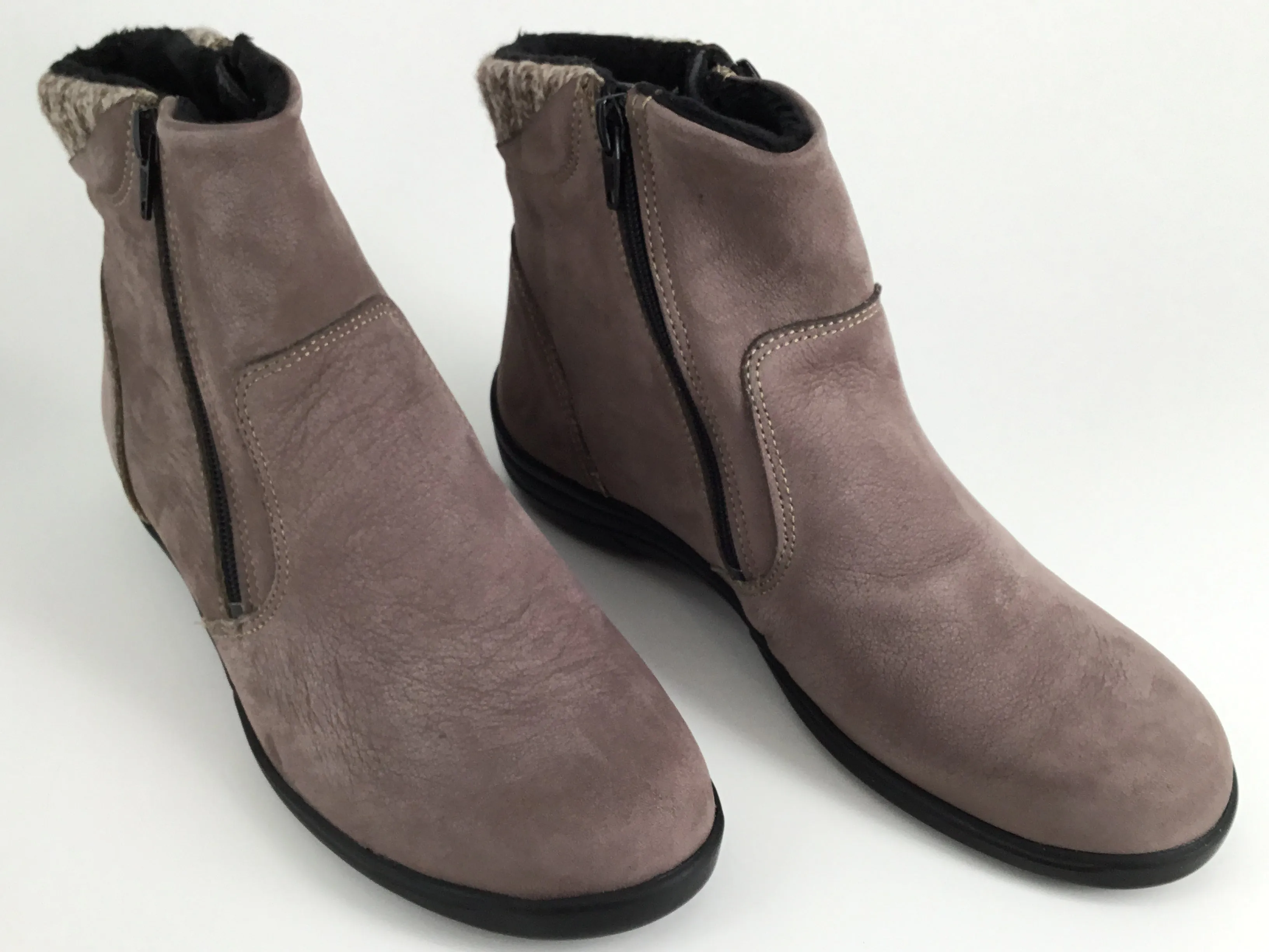 Aco Comfort Fossil from Portugal ticks all the boxes when it comes to style and comfort. Suede leather upper with cozy faux fur lining. Cute knitted cuff giving your ankle extra cushioning. Comfortable lightweight wedge rubber sole unit and twin zip for easy entry.