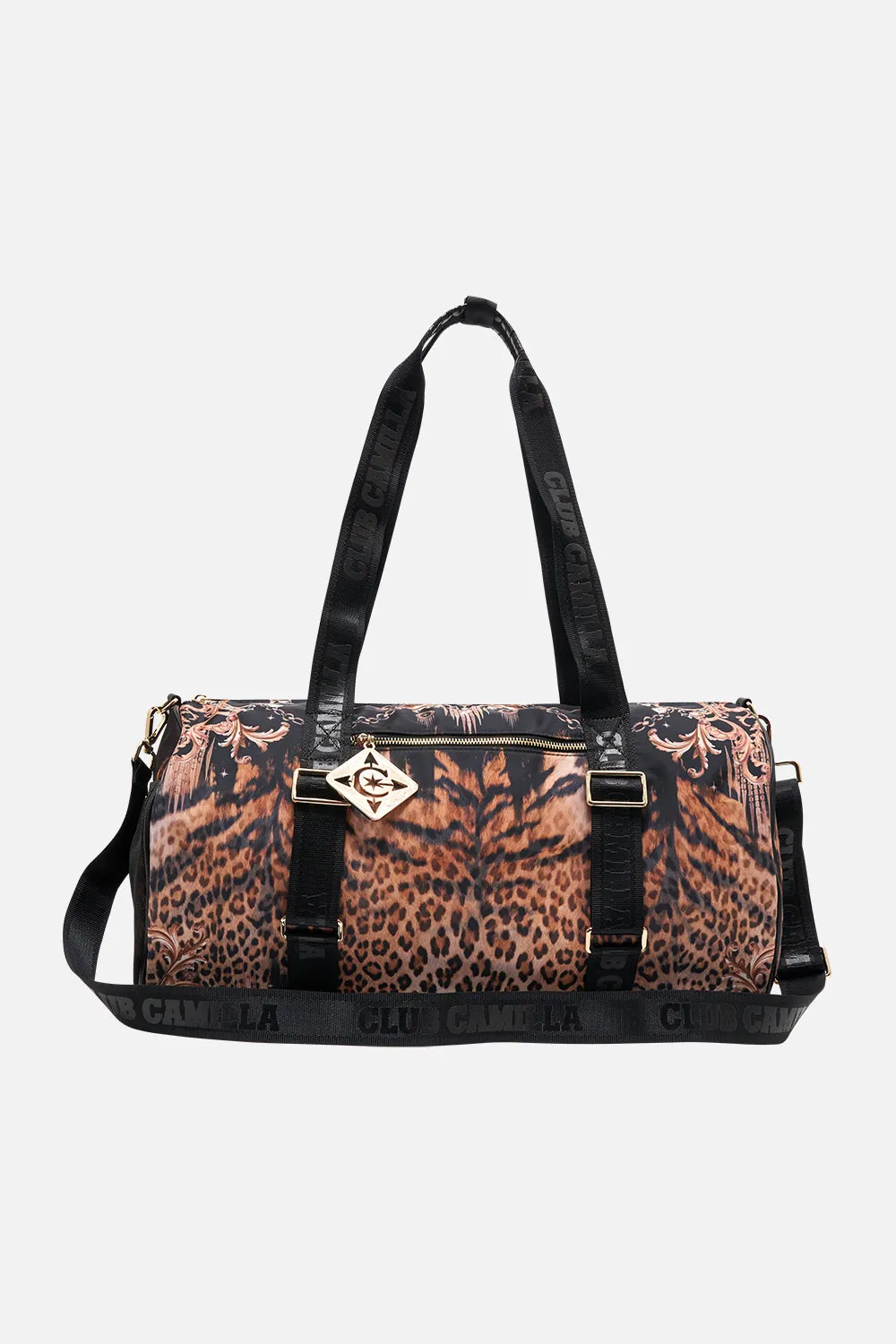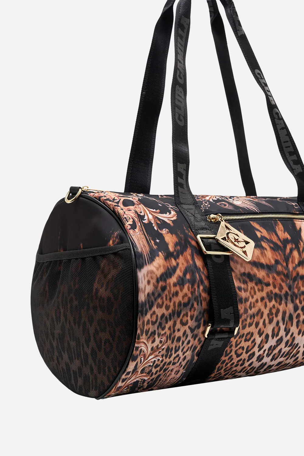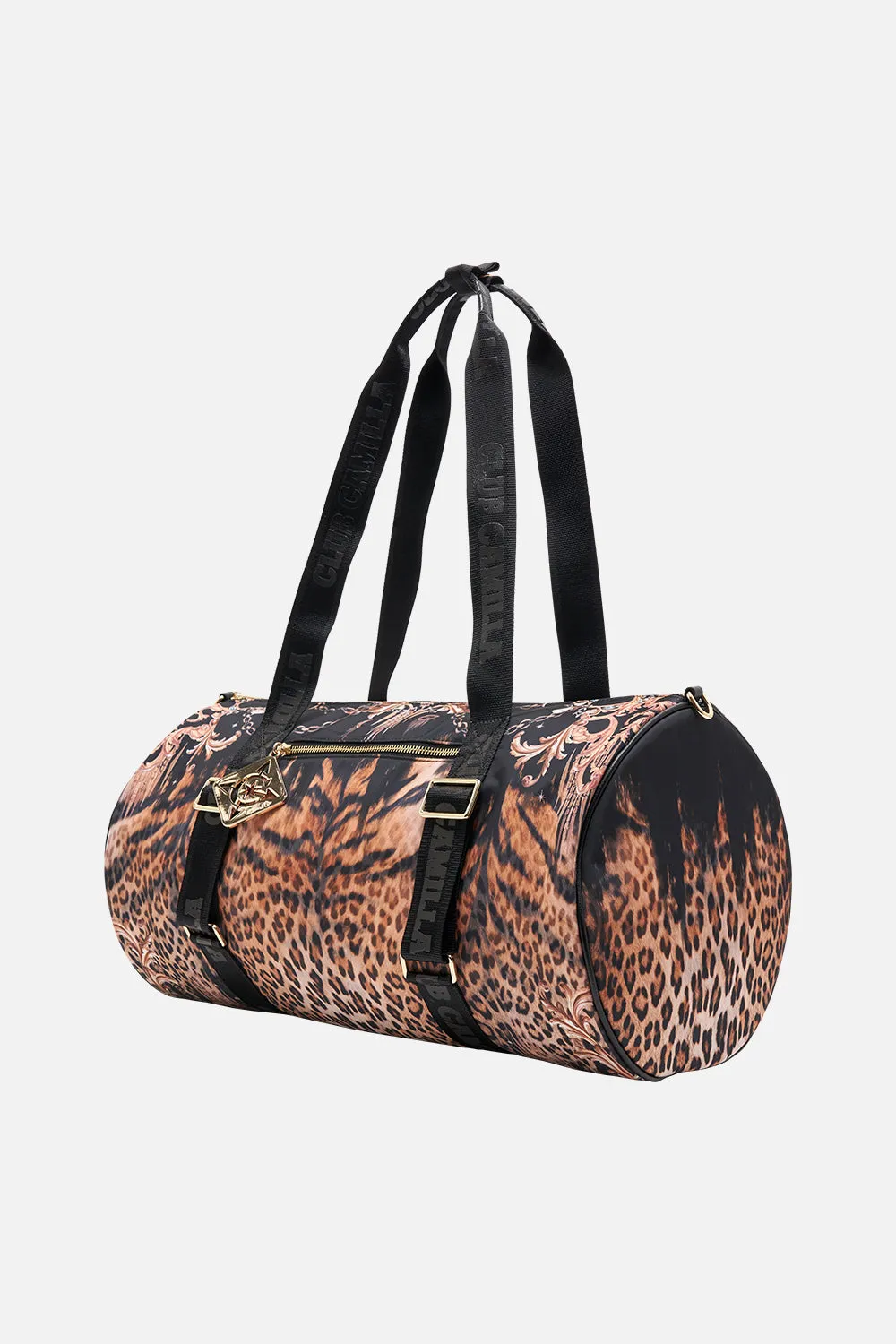The Running In The Wild Active Barrel Bag embodies a classic leopard print highlighted by golden baroque flourishes intertwined with find chain and precious charms. Designed for ultimate utility this luxury gym bag features a sleek barrel silhouette with compartments to secure your water bottle, yoga mat, with plenty of room for additions, and finished with a sturdy cross body strap to keep you effortlessly on the move.Lovingly handcrafted and designed in Australia, explore more from The Moral Of The Story: Act II collection.