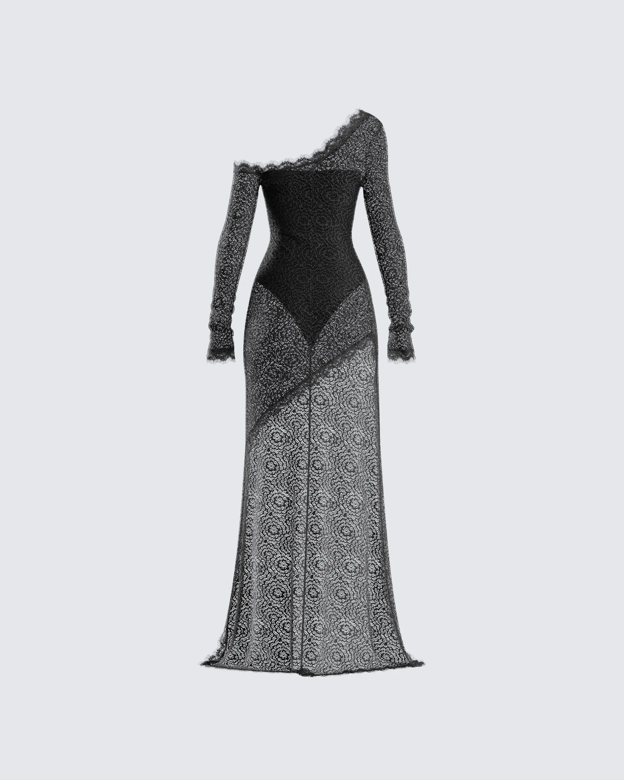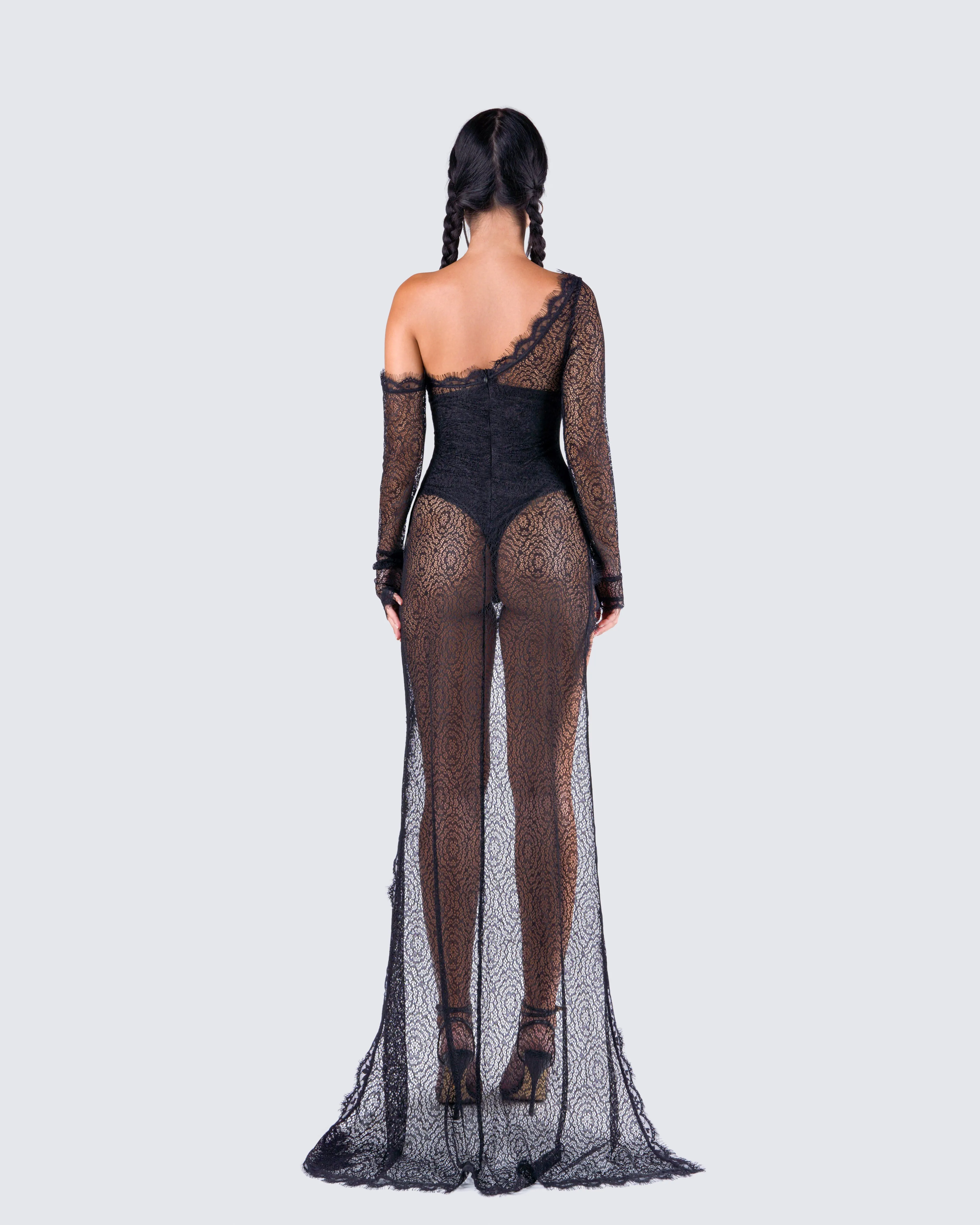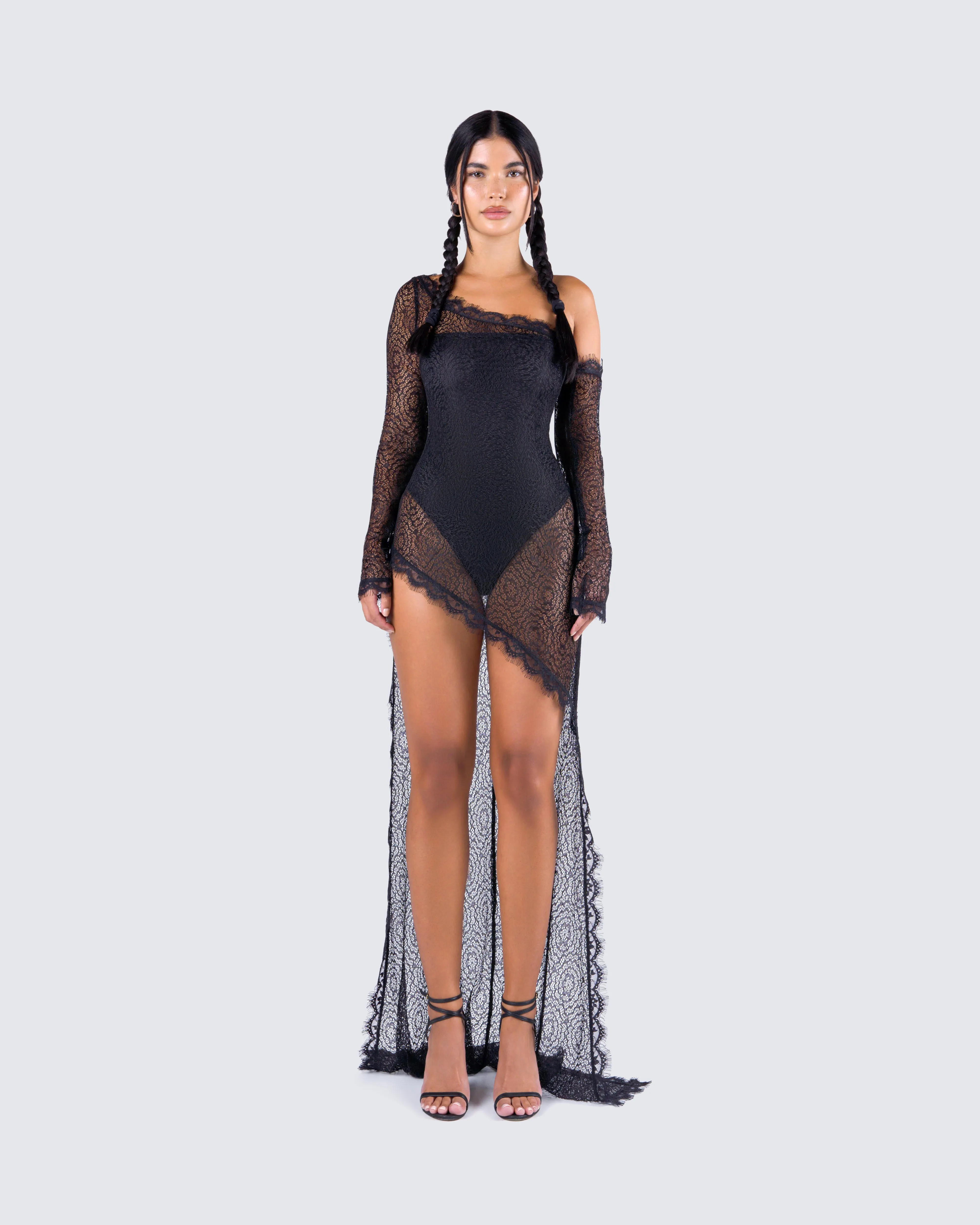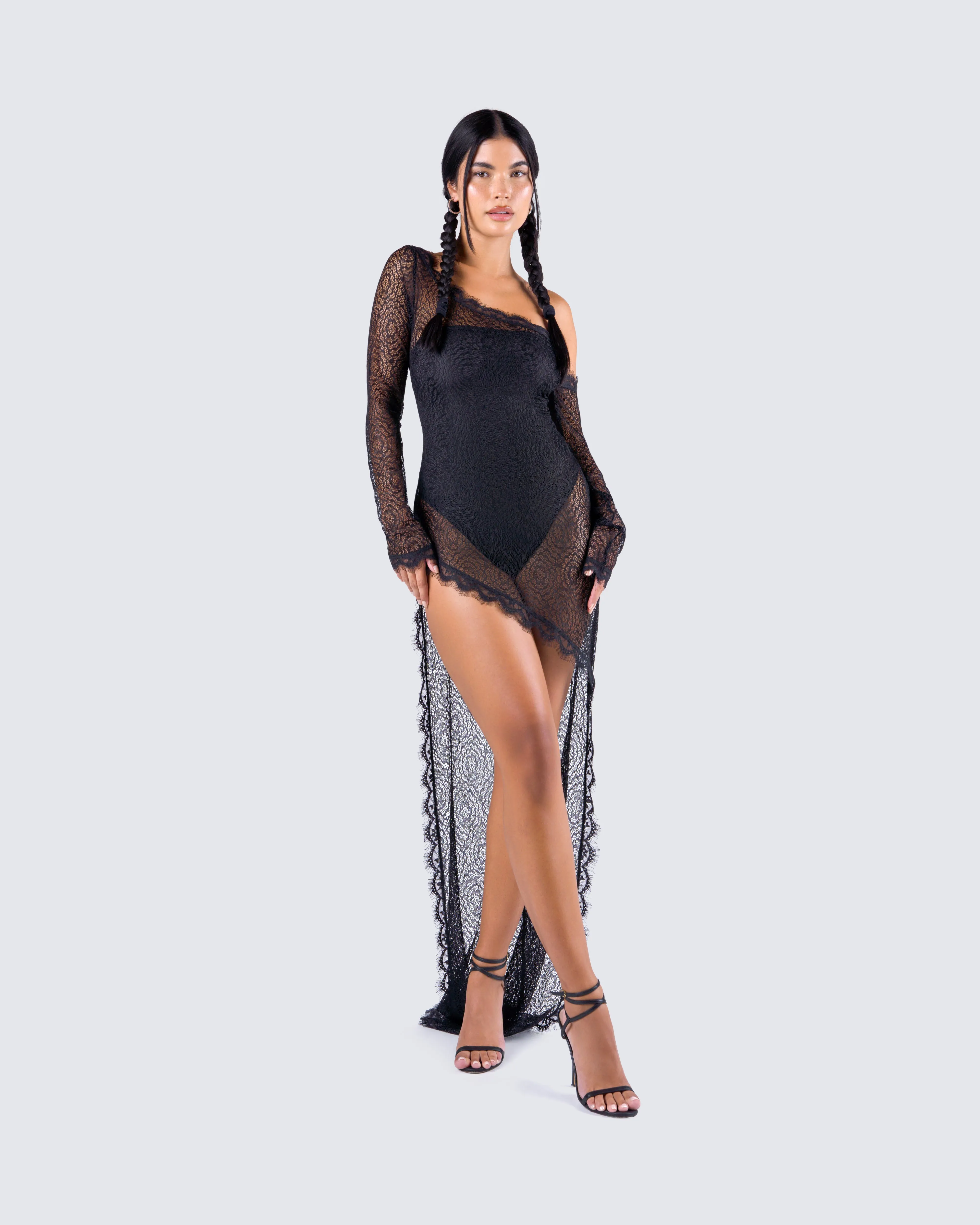 Draped in the darkness of desire, this black lace maxi dress exudes seductive elegance 🖤 Made from a stretch lace fabric, and complete with a built-in bodysuit, an asymmetrical hem, and a center back zipper - this look will have everyone worshipping you 😏