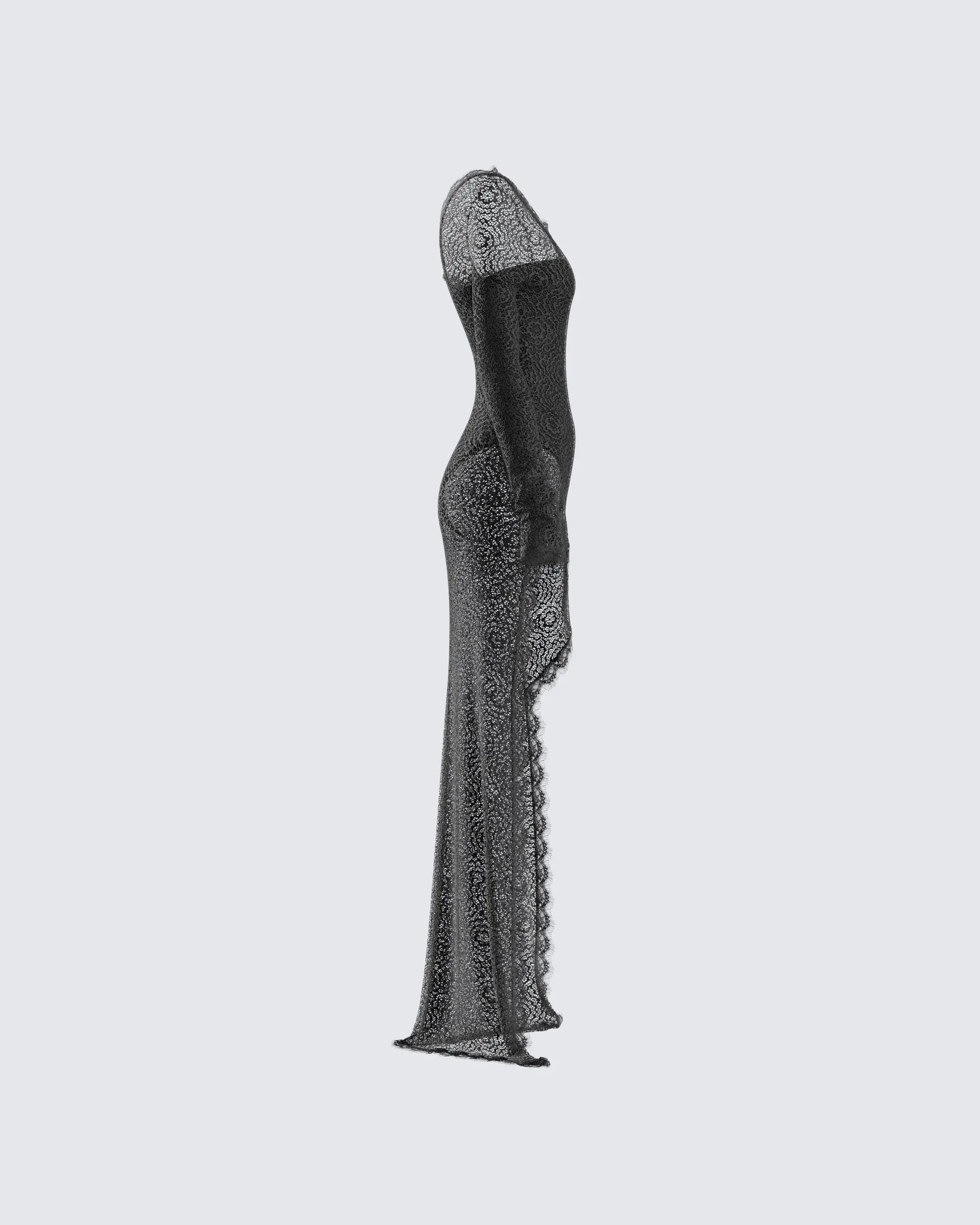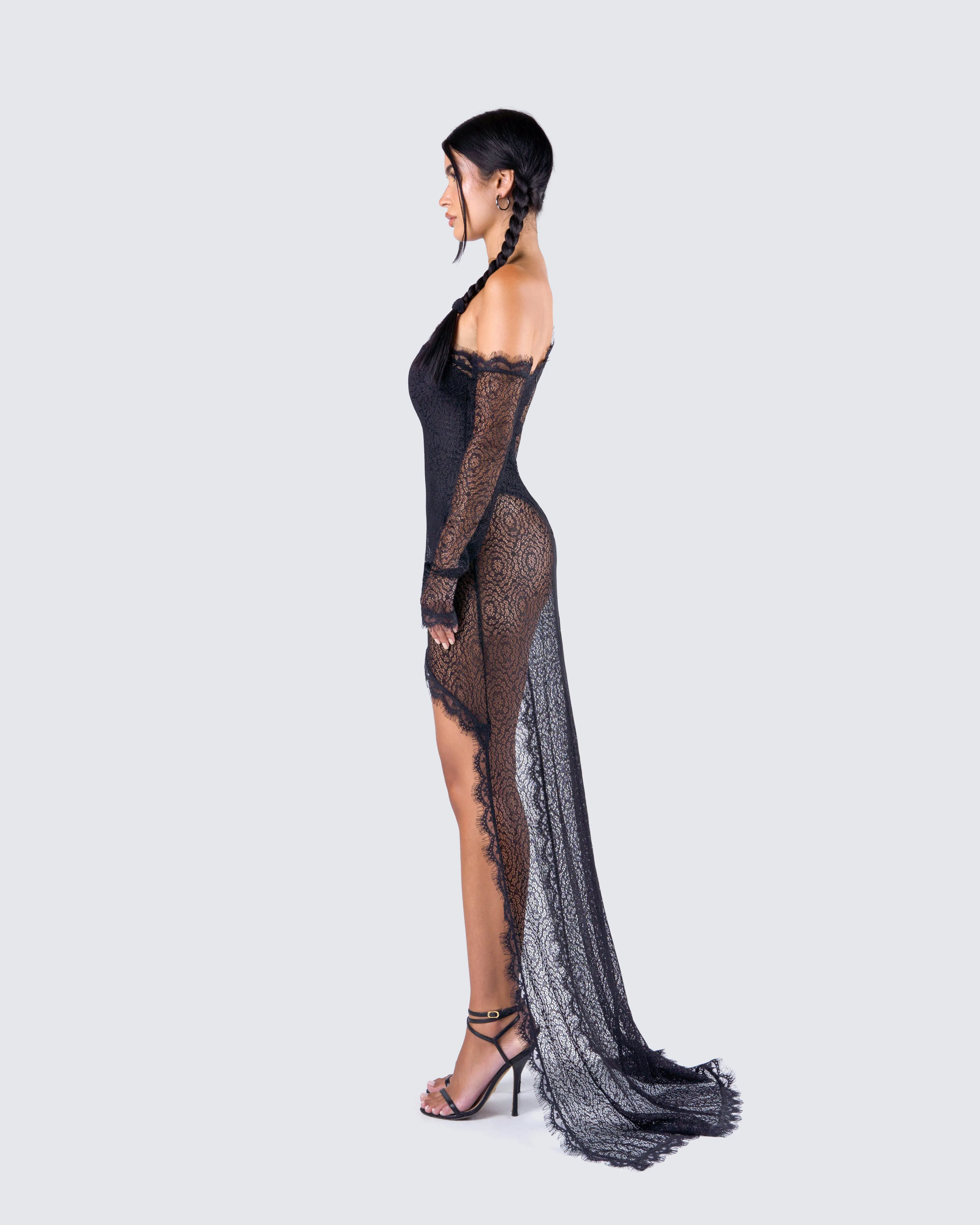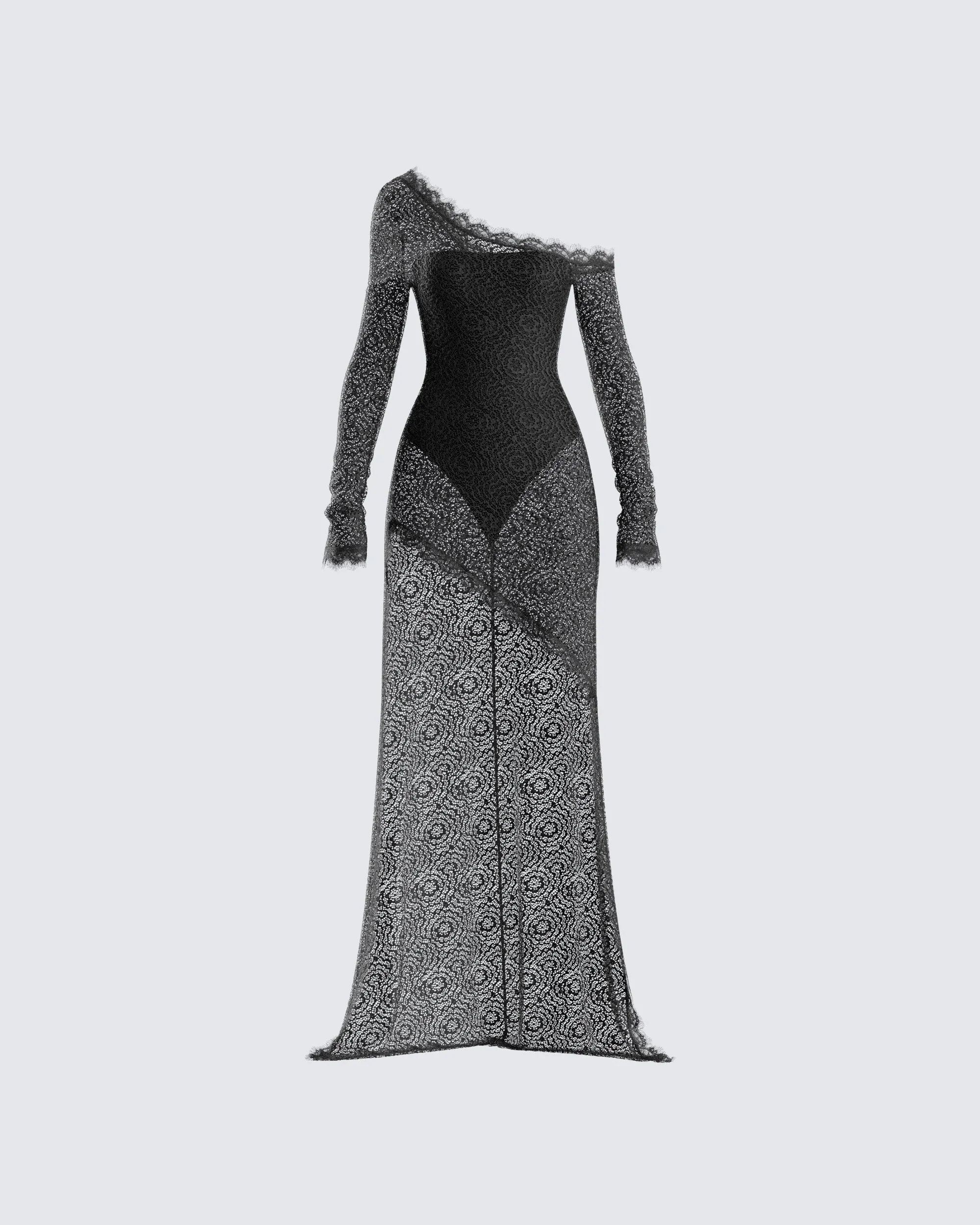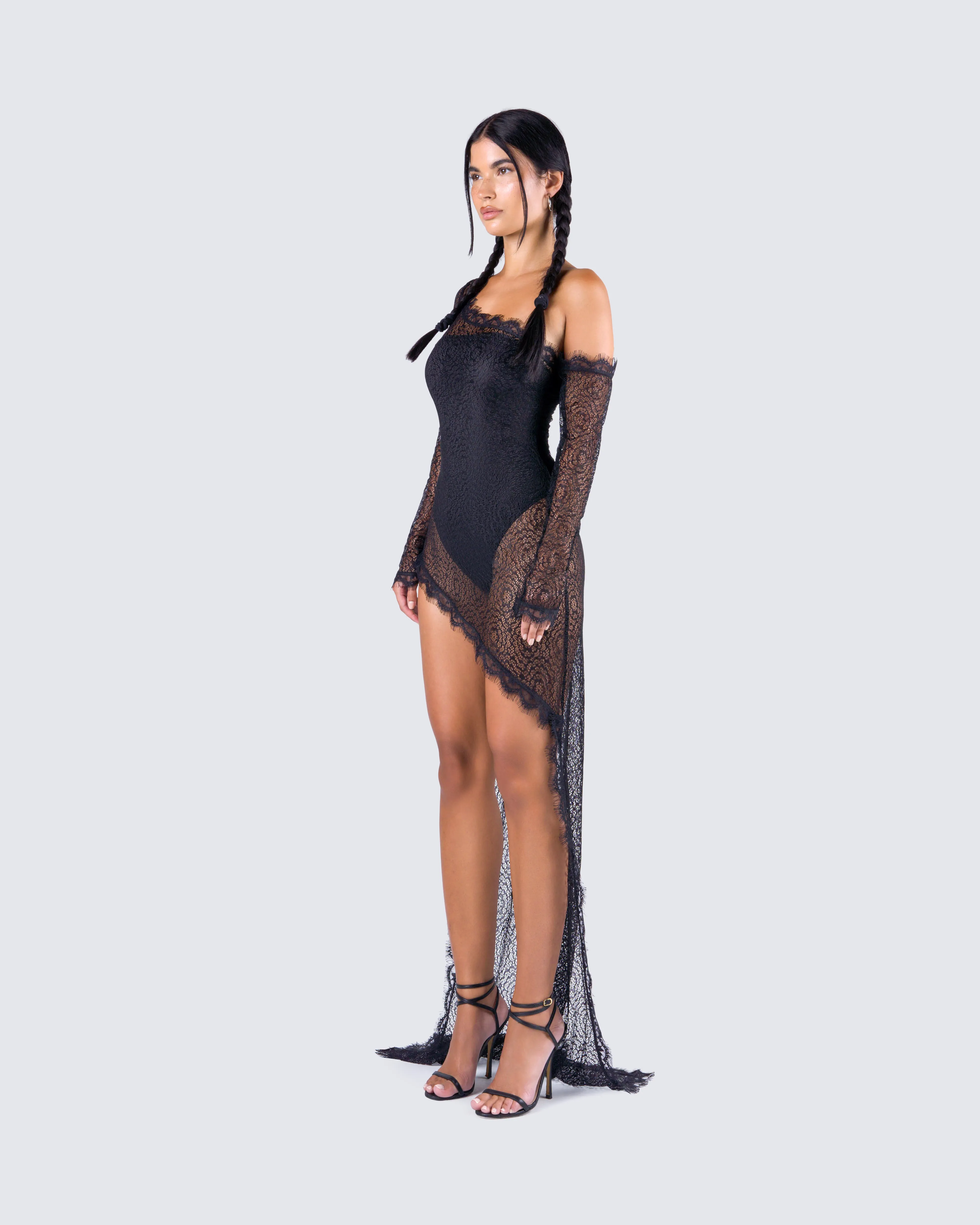 Draped in the darkness of desire, this black lace maxi dress exudes seductive elegance 🖤 Made from a stretch lace fabric, and complete with a built-in bodysuit, an asymmetrical hem, and a center back zipper - this look will have everyone worshipping you 😏