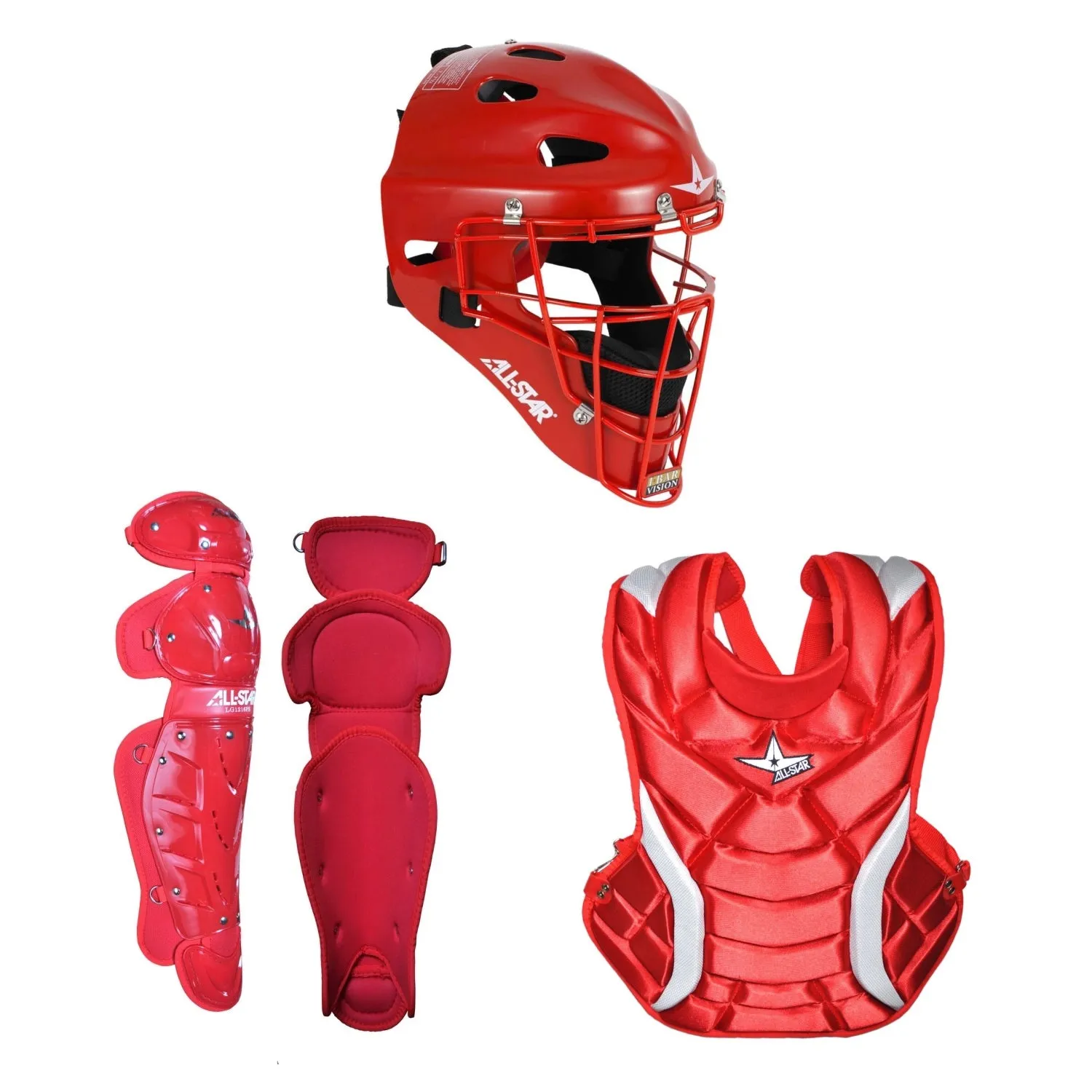 The All Star Fastpitch Series Intermediate Catchers Set is a complete, player-preferred compilation containing some of finest catcher s equipment in All Star s extensive repertoire. The helmet, a MVP2310, is a high-quality catcher s helmet that uses both dual density foam liners and layers of padding. The helmet uses these for absorbing impact strain and reducing pressure. Both of which are very important in the protection of your head behind the plate. The helmet also contains special moisture wicking technology that aids in keeping players cool, dry and comfortable for a more complete fit and feel. The CPW13PS chest protector is part of the exclusive Women s Player s Series. It is given the same care and design as All Star s signature System Seven series. This set comes without all of the bulk and flare that increases the weight as well as the price tag in the Seven Series. Padding systematically surrounds fragile areas of the torso and moves as one piece with the player instead of around them. The LGW13FP leg guards incorporate a double-knee design that are better for surrounding and supporting the fragile areas of the leg. This allows for optimal mobility and quick movements behind the dish. This is very important for catchers when they are doing things such as blocking balls in the dirt or fielding bunts. All Star is a baseball and softball company that specializes in the manufacturing of catcher s equipment. They have been making high quality gear for years now. They pride themselves on their ability to please ballplayers looking for the finest equipment, specifically catcher s. All Star is a very reliable company that you know you will never go wrong buying catcher s equipment from them. So, make sure you go buy yourself one of these spectacular sets of gear from Baseball Bargains today!
