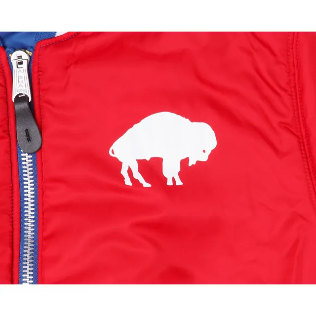 The Alpha Industries X Buffalo Bills Alternate MA-1 Bomber Jacket features embroidered Bills patches throughout the chest and sleeves with an embroidered applique team wordmark at the rear. Additional details include a utility pocket with the Alpha Industries ribbon at the left sleeve. The reversible jacket features a black interior with a screen-printed team logo at the left chest and a multi-lingual message at the rear.