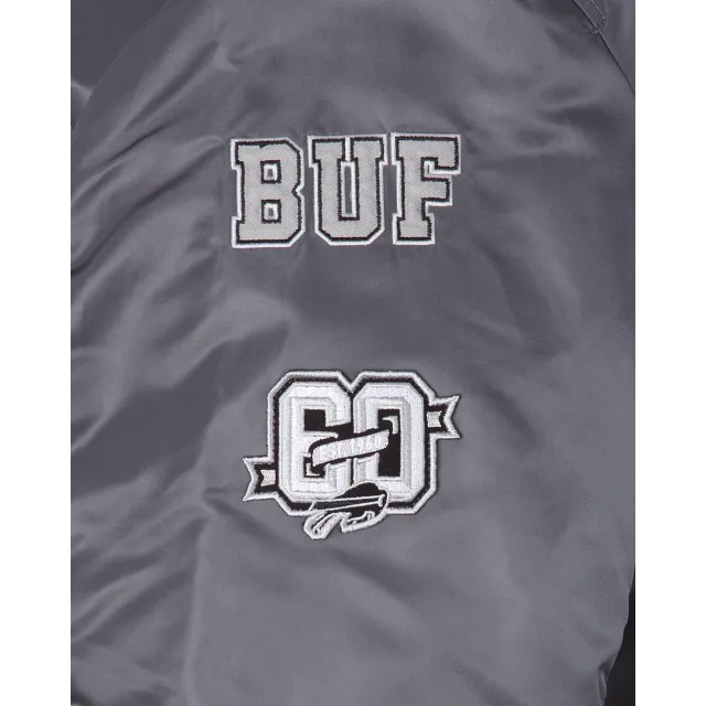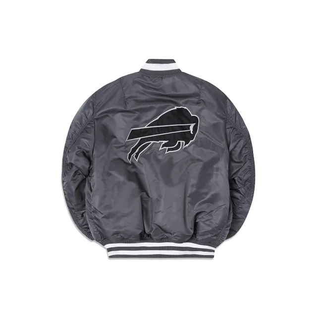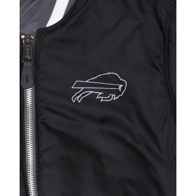 The Alpha Industries X Buffalo Bills Gray MA-1 Bomber Jacket features embroidered Bills patches throughout the chest and sleeves with an embroidered applique team wordmark at the rear. Additional details include a utility pocket with the Alpha Industries ribbon at the left sleeve. The reversible jacket features a black interior with a screen-printed team logo at the left chest and a multi-lingual message at the rear.