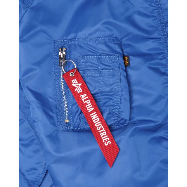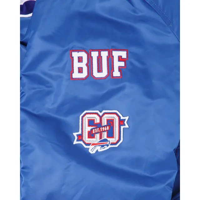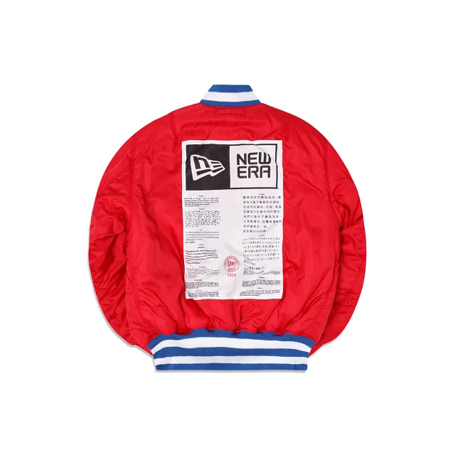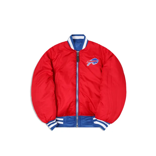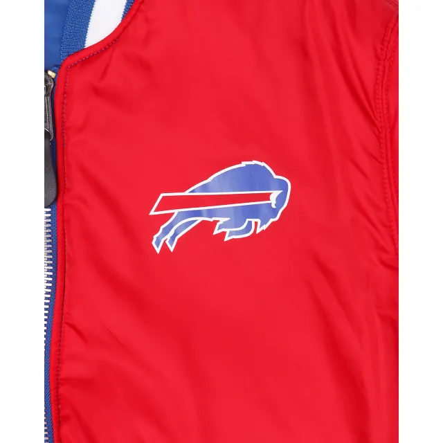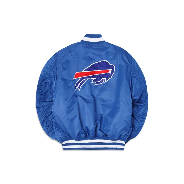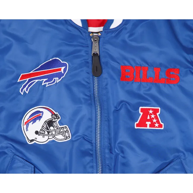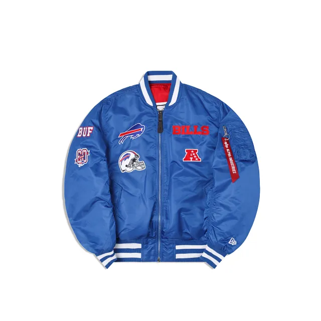 The Alpha Industries X Buffalo Bills MA-1 Bomber Jacket features embroidered Bills patches throughout the chest and sleeves with an embroidered applique team wordmark at the rear. Additional details include a utility pocket with the Alpha Industries ribbon at the left sleeve. The reversible jacket features a black interior with a screen-printed team logo at the left chest and a multi-lingual message at the rear.