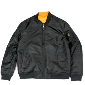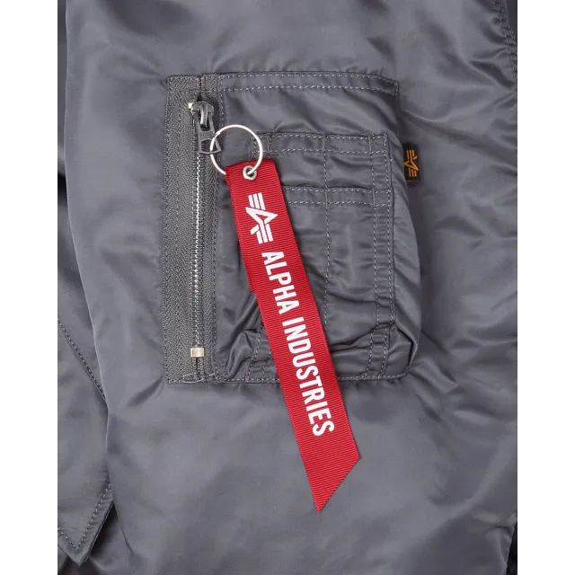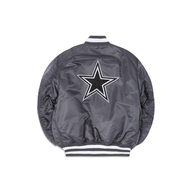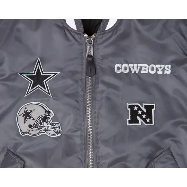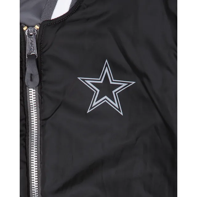The Alpha Industries X Dallas Cowboys Gray MA-1 Bomber Jacket features embroidered Cowboys patches throughout the chest and sleeves with an embroidered applique team wordmark at the rear. Additional details include a utility pocket with the Alpha Industries ribbon at the left sleeve. The reversible jacket features a black interior with a screen-printed team logo at the left chest and a multi-lingual message at the rear.