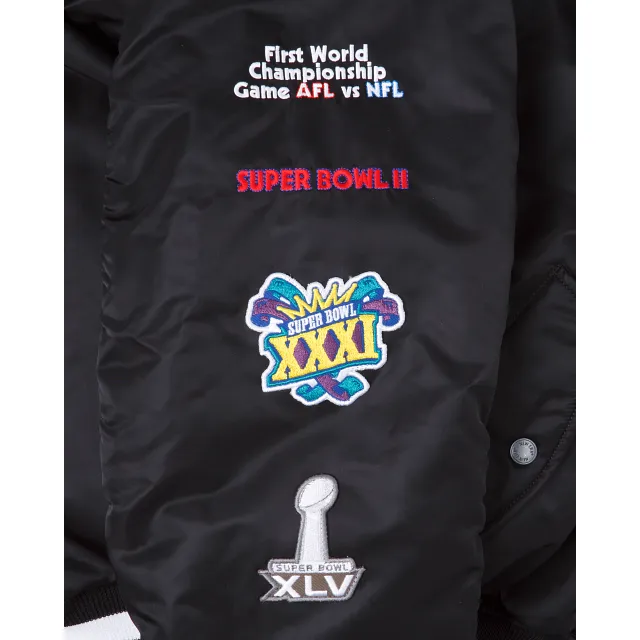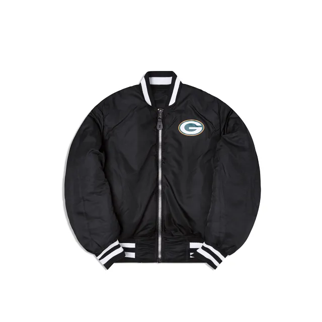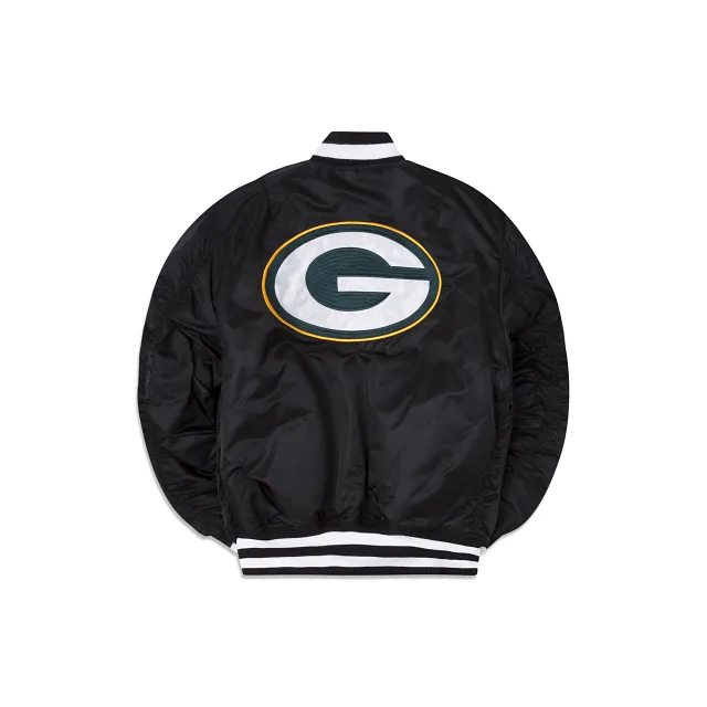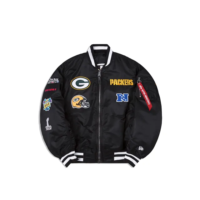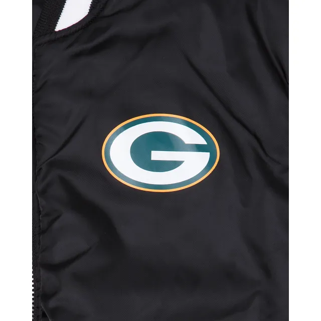 The Alpha Industries X Green Bay Packers MA-1 Bomber Jacket features embroidered Packers patches throughout the chest and sleeves with an embroidered applique team wordmark at the rear. Additional details include a utility pocket with the Alpha Industries ribbon at the left sleeve. The reversible jacket features a black interior with a screen-printed team logo at the left chest and a multi-lingual message at the rear.